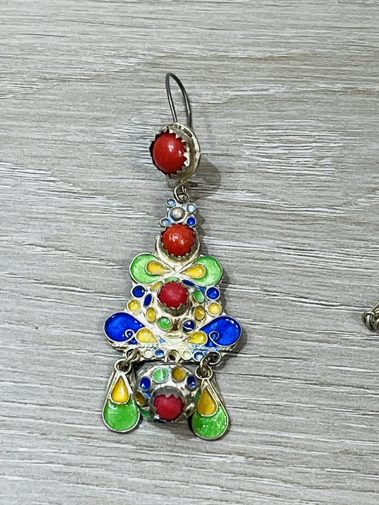 The six piece Algerian Berber Kabyle Sterling Silver Enamel Necklaces, Ring Bracelet, ear rings and Brooch Set Are all in very good condition they do show some signs of age and wear. And have been left unpolished to retain their natural patina.. the bracelet has an internal diameter of 2 1/2 inches, with an external measurement of 8 1/4 inches around. The earrings measure 2 1/2 inches long. both necklaces measure 16 inches long, with what I believe is a brooch or pendant, I’m not sure as it doesn’t have a typical fastener , it has a pointy end. It measures 4 1/2 inches by about 3 inches. The ring is a size 6 1/2.