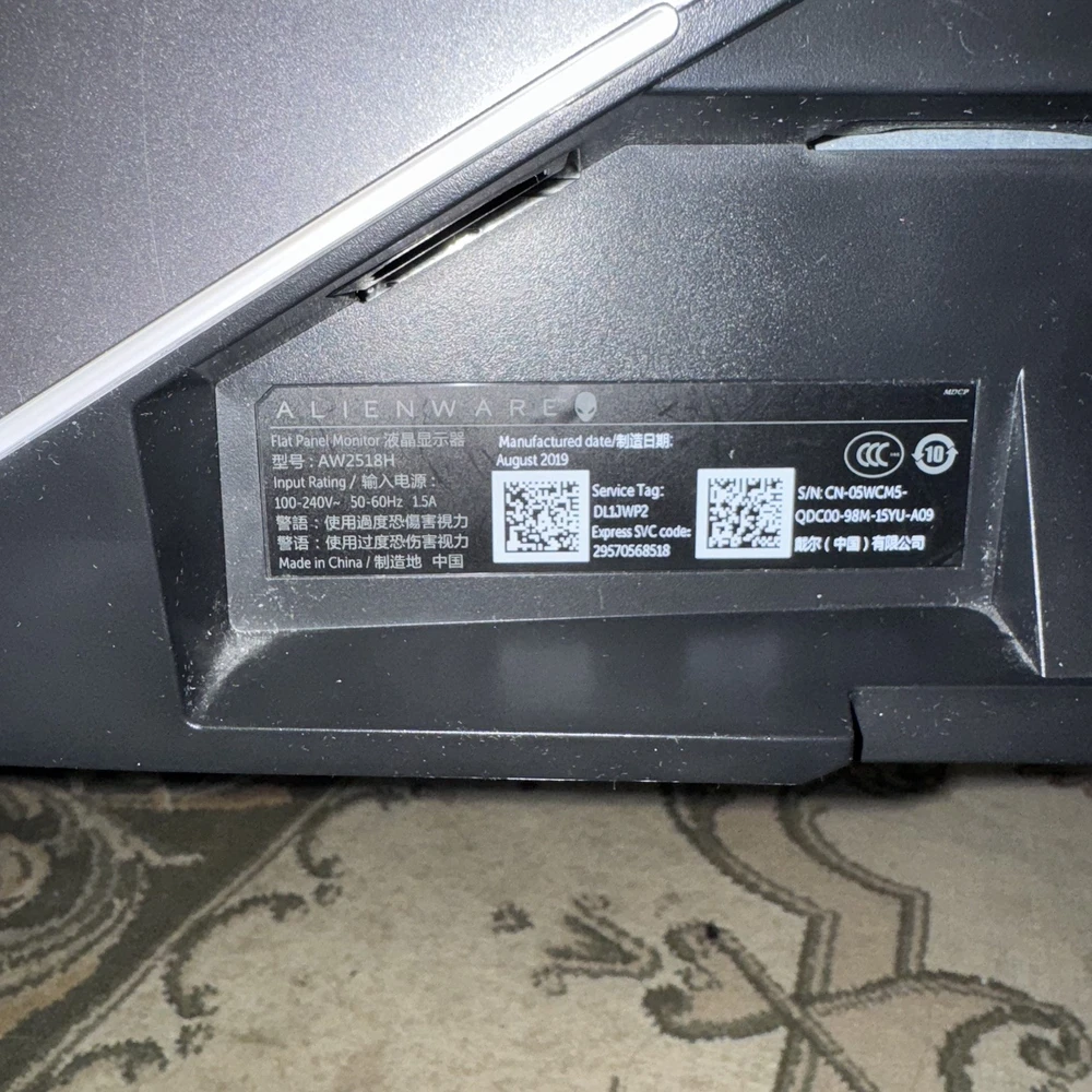 Energy Star: 5 Stars California Prop 65 Warning: Yes Video Inputs: DisplayPort, USB 3.0, HDMI Standard Color: Black Contrast Ratio: 1000:1 Country of Origin: China MPN: AW2518HF Model: Dell Alienware AW2518HF Response Time: 1 ms Brand: Alienware Screen Size: 25 in EC Range: A+++ - G Most Suitable For: Gaming Aspect Ratio: 16:9 Refresh Rate: 60 Hz Brightness: 400 cd/m² Features: Headphone Jack, Slim Bezel, Widescreen, Adaptive-Sync, Tiltable, USB Hub, Anti-Glare Maximum Resolution: 1920 x 1080 Display Type: TN LCD Product Line: Dell ALIENWARE