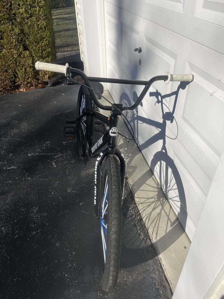 All Black SE 24" Bike with White & Blue Spokes and Black & White Handlebars