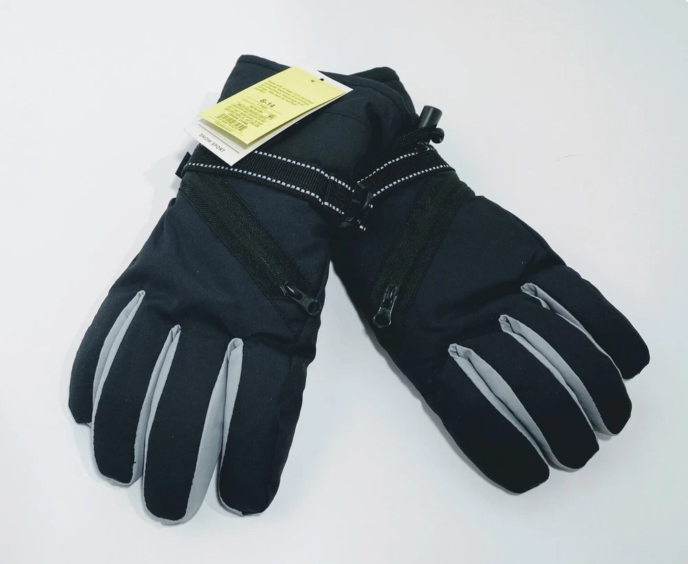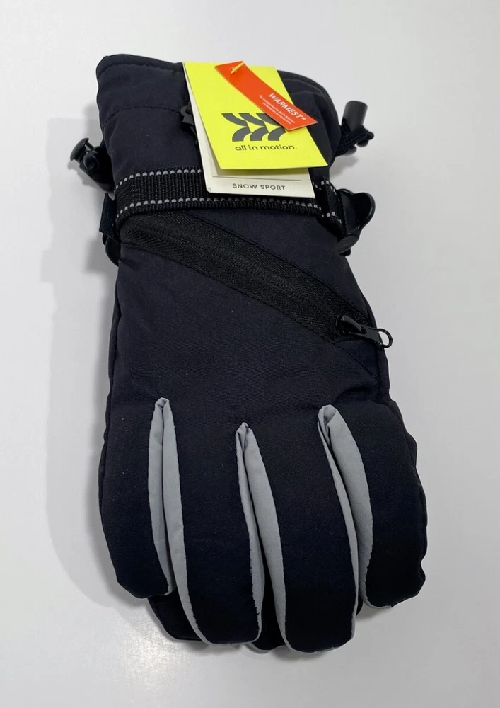All In Motion Kids Snow Gloves Snow Sport Sizes 4-7 and 8-14 Clips onto Jackets with all the all in Motion Clip System Palm Patches for enchanced grip Secure Zipper Pocket Adjustable cuffs A must for snow sports and color weather
