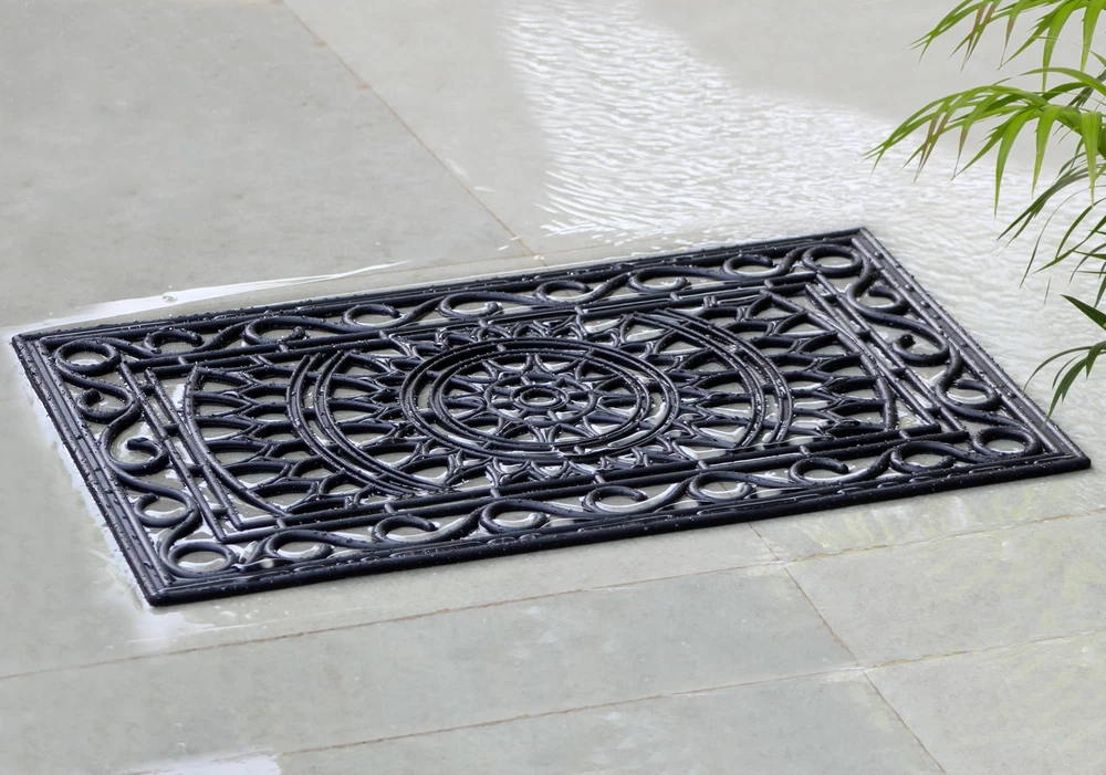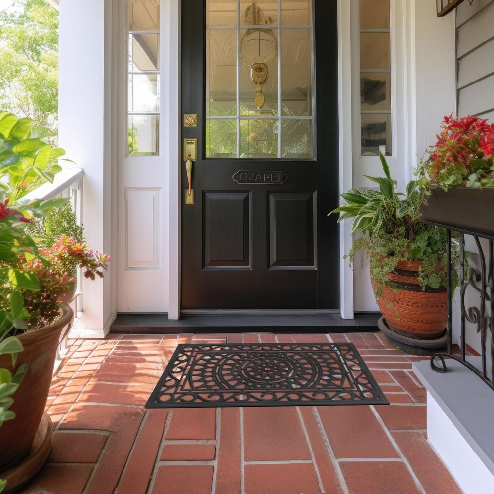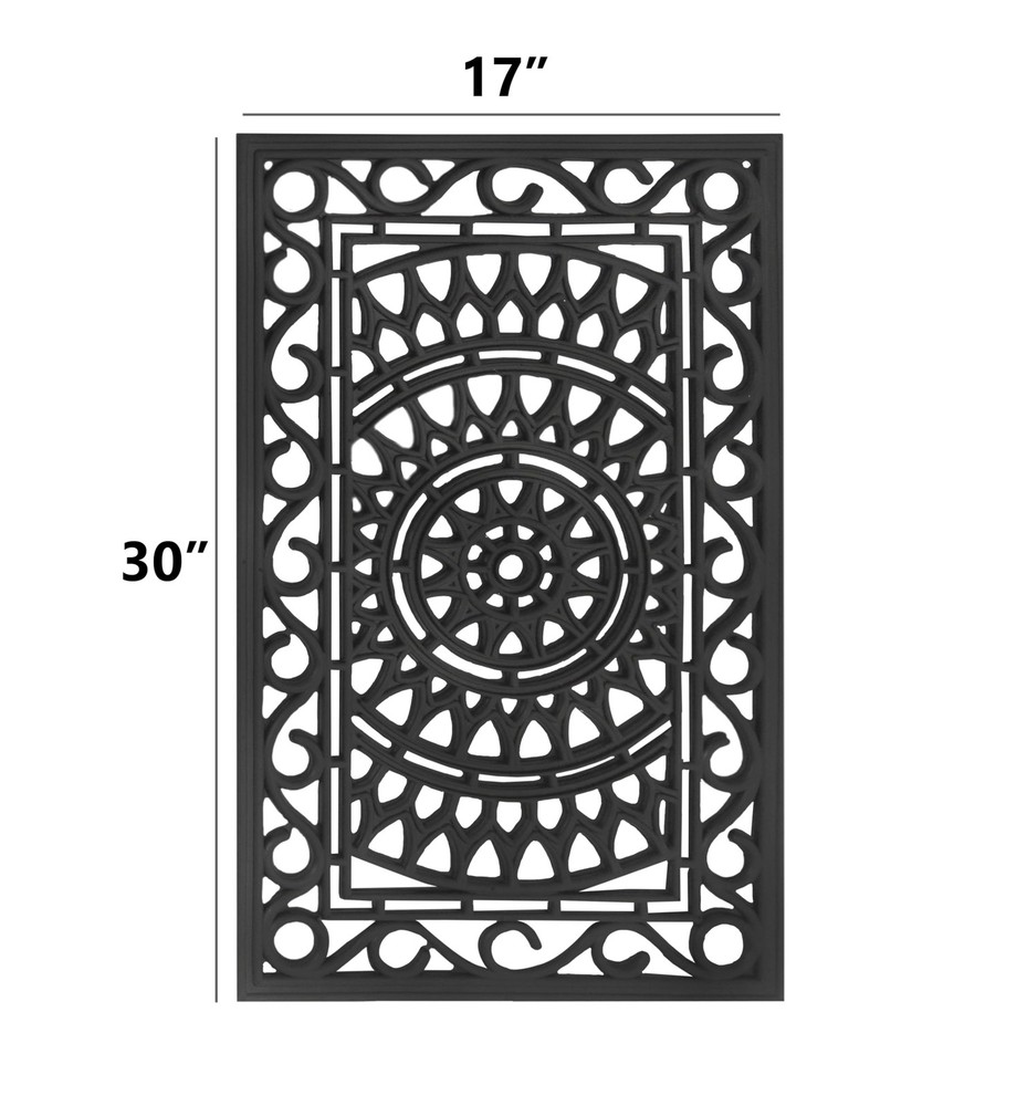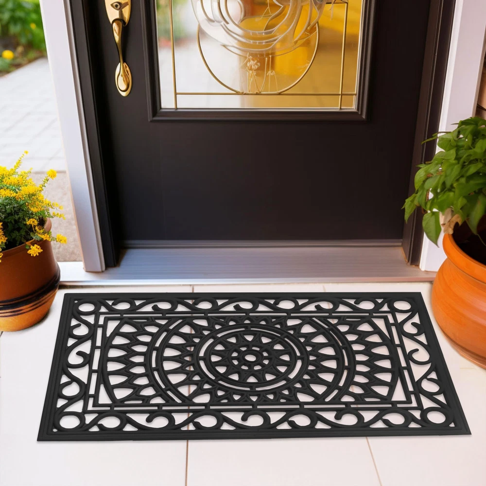 CONTENTS: One (1) Rubber Doormat measuring 17 inches by 30 inches. Thickness is approximately half an inch. Weighs approximately 4 pounds. Heavy duty rubber construction ensures door mat stays in place when wiping shoes. DURABLE, HIGH-QUALITY DOOR MAT: Not just a decorative element, the heavy-duty rubber construction of our doormats holds up to heavy foot traffic and protects your home from mud, dirt from the street, moisture, and foreign substances. This all-weather doormat made from durable rubber provides nonslip grip and stability allowing water to drain. Place this outdoor mat right outside the patio or front door to keep your entryways clean. VERSATILE USE: Keep one at each entryway, front door, porch, patio, deck, garage, workshop to keep dirt and debris outside while adding an aesthetic touch to your decor. Pet parents - limit the mess at mealtimes by placing these under the pet food bowls. Use in the kitchen for cushioning to prevent fatigue as you wash dishes and cook meals. Keep them in doorways throughout the home, in hallways, entryways or at bedroom doors to add a little charm to these spaces. GUEST FRIENDLY WELCOME DOORMAT: Our doormat's picture perfect intricately molded rubber design makes a great first impression and will ensure your guests feel welcome as they arrive at your home. CARE INSTRUCTIONS: Clean with wet cloth or just hose down with water.