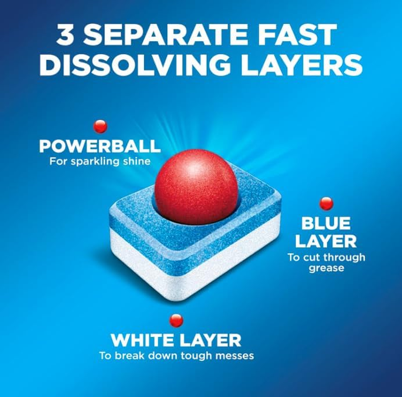 Help soften the toughest food residues like baked-on lasagna and dried-on oatmeal for easy removal Powerful cleaners remove even the toughest stains. No need to pre-soak or pre-rinse with Powerball cuts through grease & scrubs away burnt & dried-on food Each individually wrapped Finish Powerball tab provides a premeasured dose of detergent, eliminating guesswork and dissolves completely Rinse agent action helps rinse away residues, eliminating spots and film for a sparkling shine Finish is the worldwide leader in dishwashing and is the recommended brand worldwide by more dishwashing brands than any other brand Thanks to a unique and powerful dishwashing technology, Finish All In 1 Powerball Dishwasher Detergent Tabs give you an amazing clean and Finish Jet-Dry shine every time - which means you will never have to re-wash your dishes again in your dishwasher.