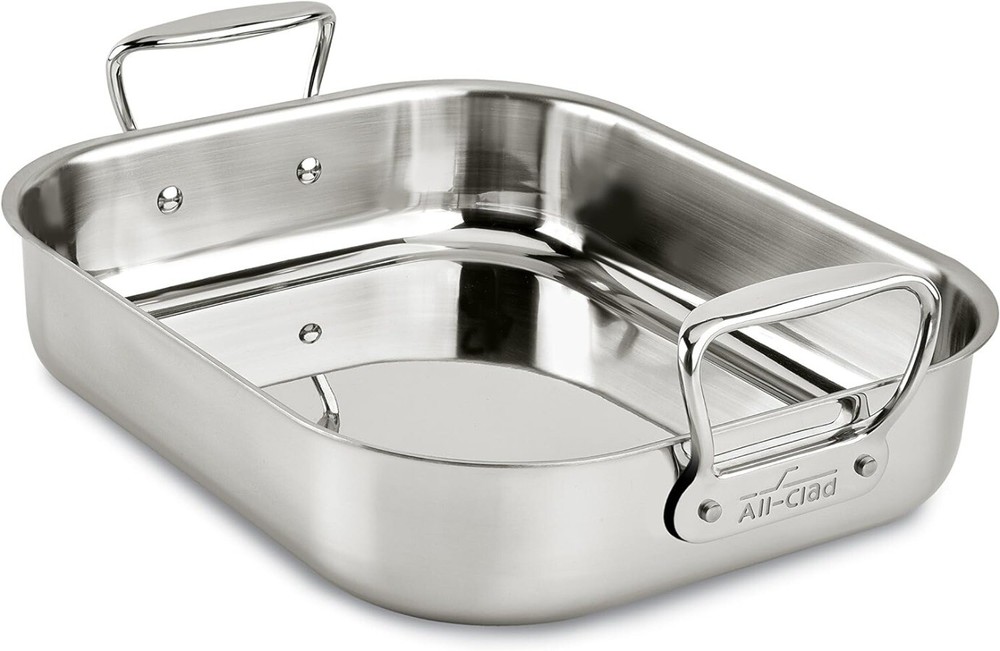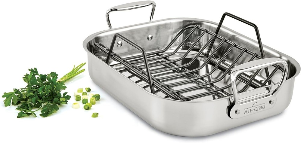 Package: 1X All-Clad Specialty Stainless Steel Roaster with Nonstick Rack 11x14 Inch Oven Broiler Safe 500F Roaster Pan, Pots and Pans, Cookware Silver Description: Small 11-by-14-inch roasting pan with removable V-shaped nonstick roasting rack Single-ply polished stainless-steel construction with warp-resistant bonded base Highly polished 18/10 stainless-steel cooking surface offers superior stick resistance and easy maintenance, plus won’t react with food More durable than traditional pans for a lifetime of use; stainless-steel handles permanently secured with stainless-steel rivets Capacity etched on the pan’s base; oven- and broiler-safe to 600 degrees F; dishwasher-safe