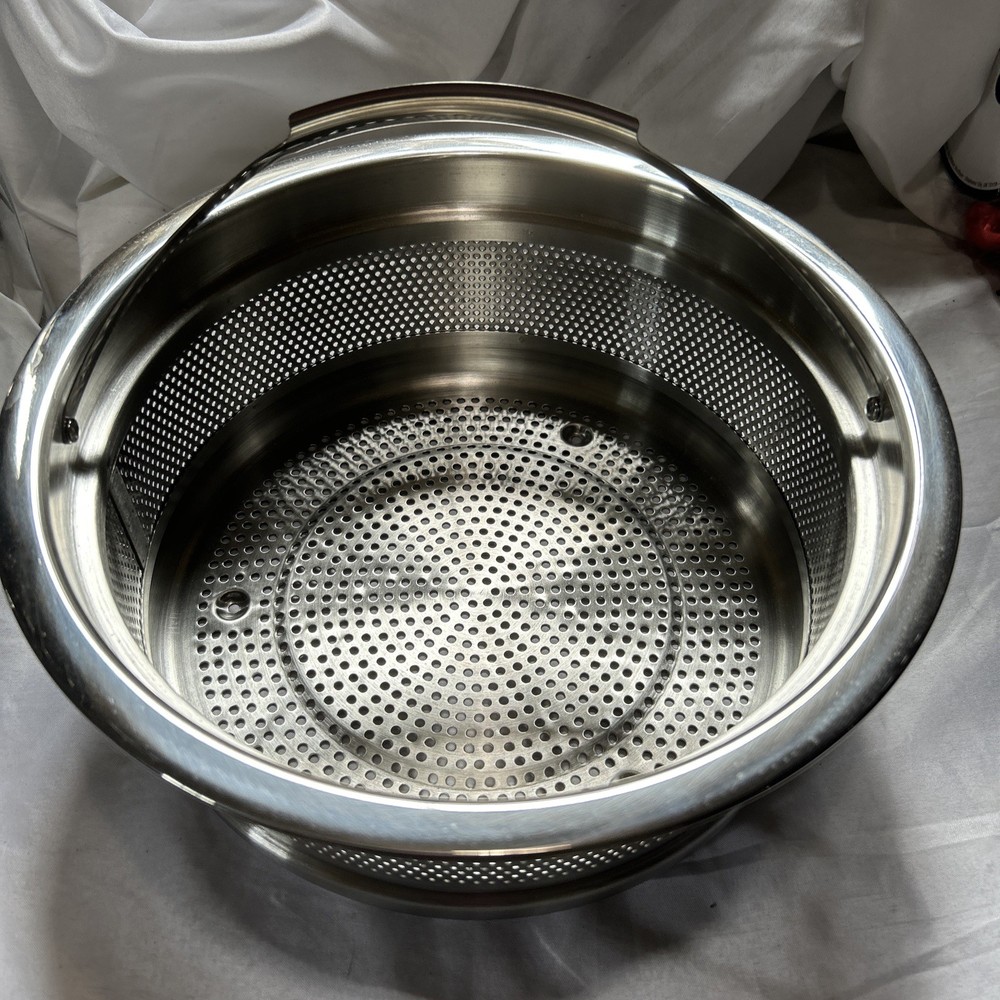 The All-Clad 12 Qt Stock Pot Multi Cooker Steamer Pasta Strainer 4 Piece Set is a versatile and high-quality kitchen essential. Made in the USA with durable stainless steel, this set includes a stockpot, steamer, strainer, and lid, all designed for electric and gas stoves. The round shape and 12Qt capacity make it perfect for a variety of cooking needs, while features like a flat-bottomed design, easy cleaning, and double handles add practicality to the pots. The set is finished in a sleek silver color and is sure to elevate any kitchen's functionality. In real good shape! Normal wear.