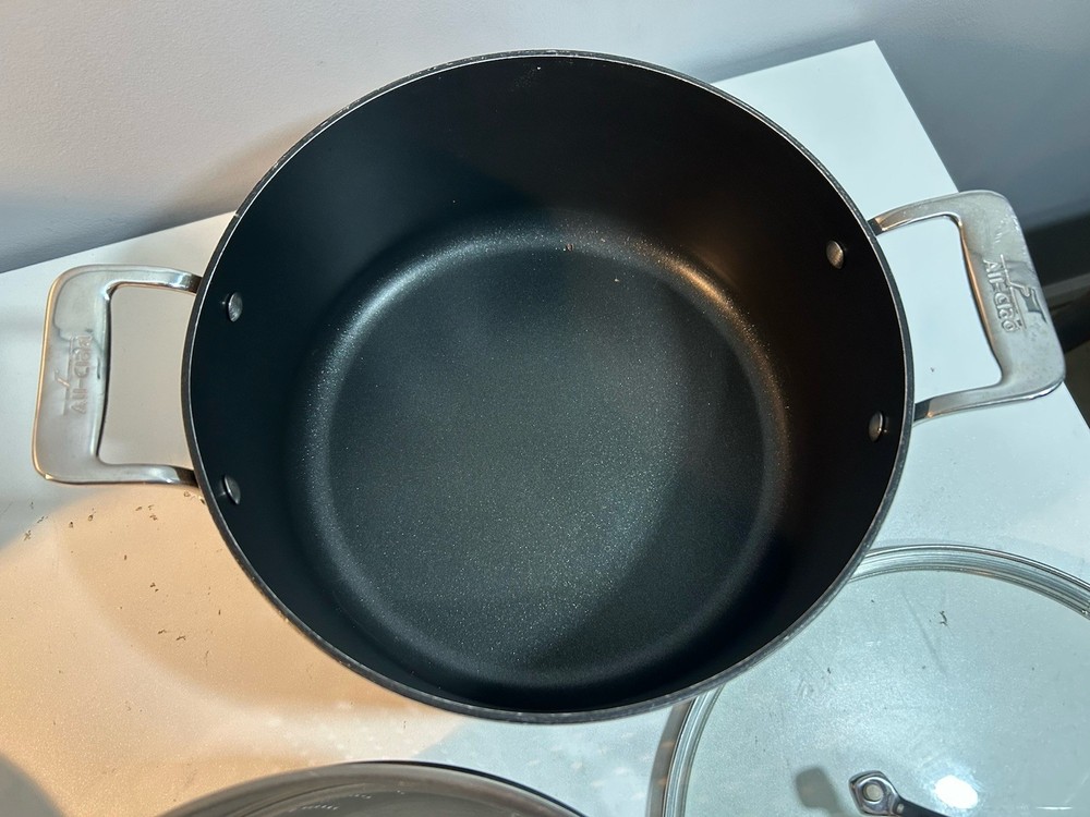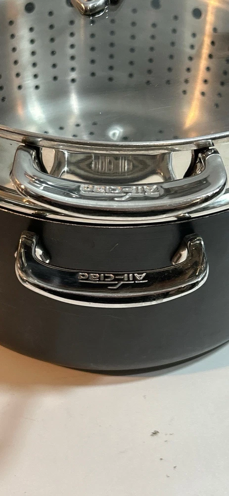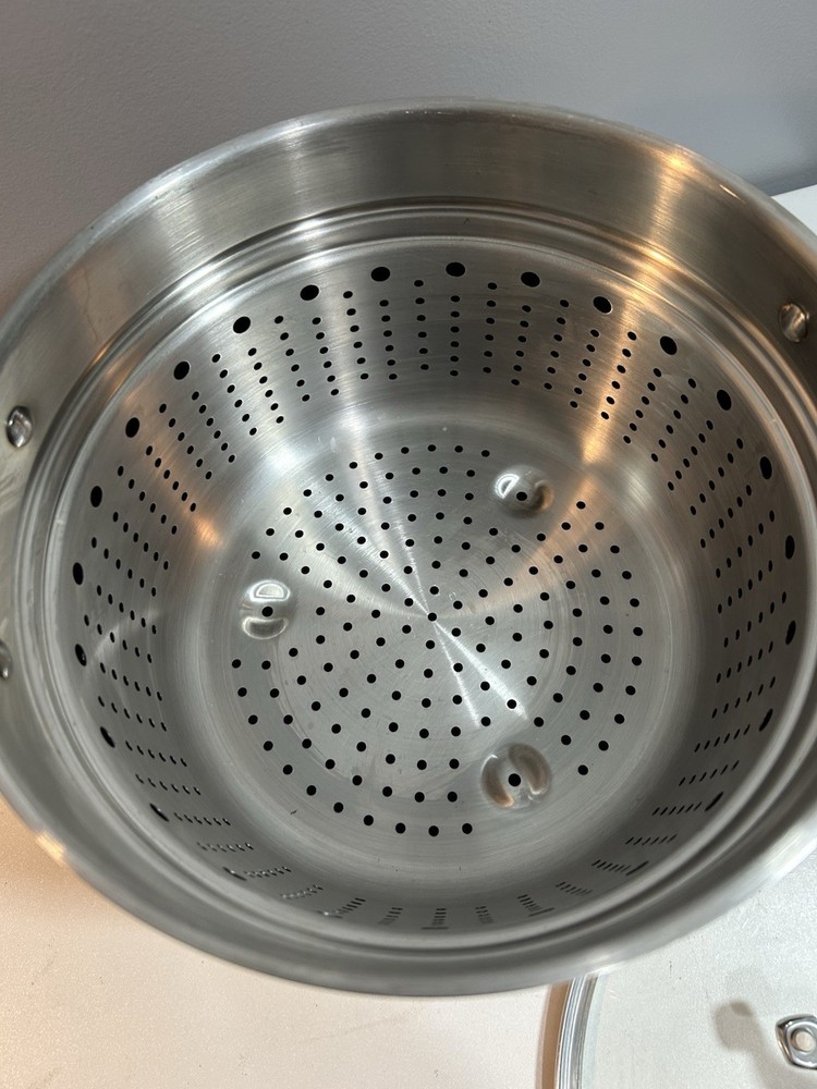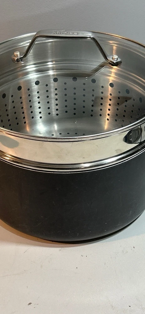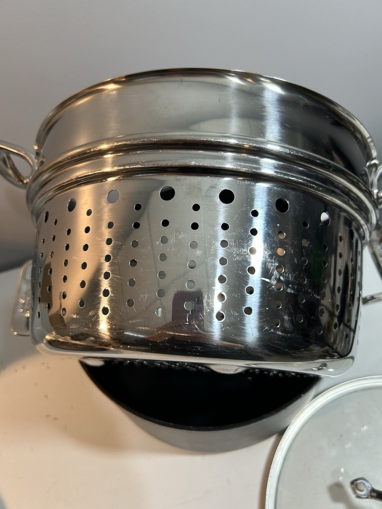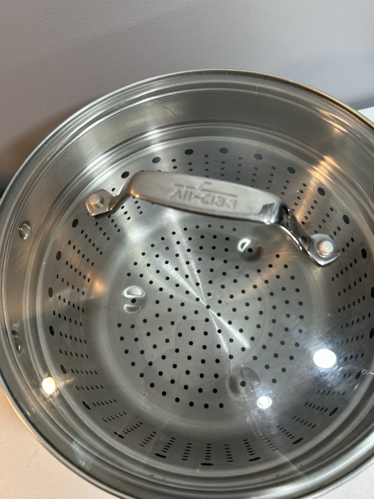 All-Clad Stainless Steel Stock Pot 7qt with Pasta Strainer w/ Lid 3 Piece. Very good condition