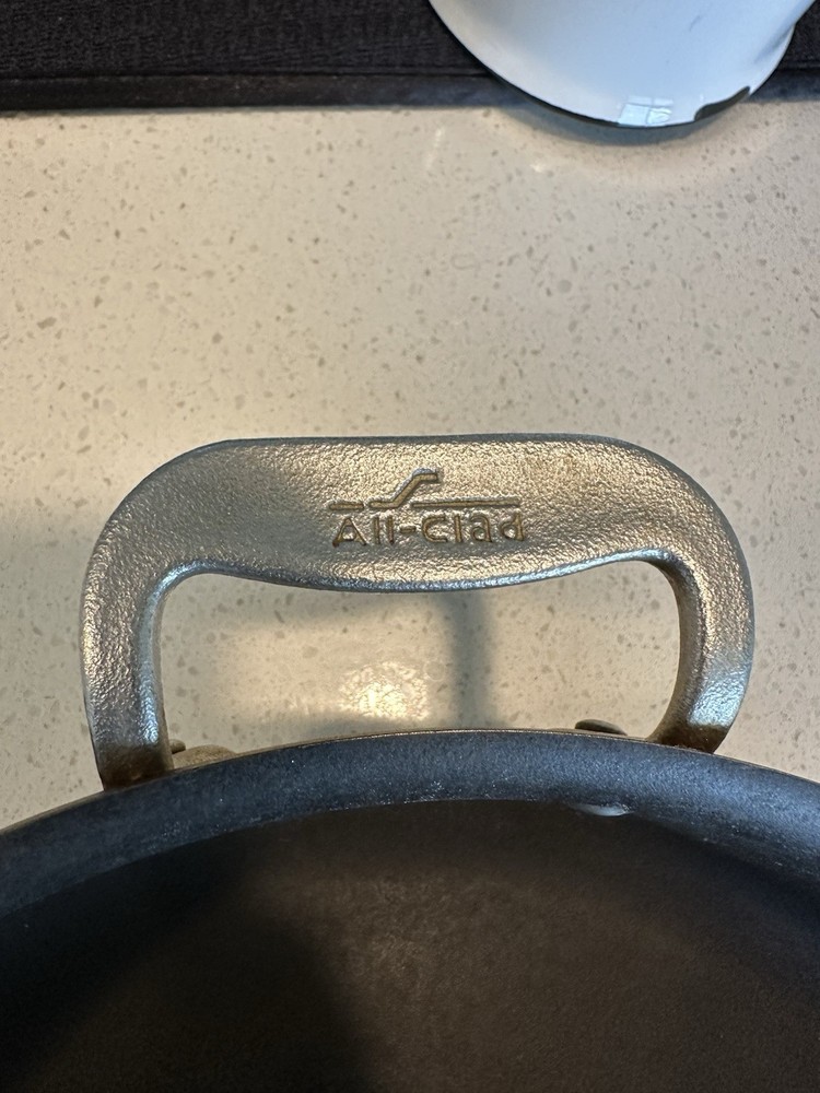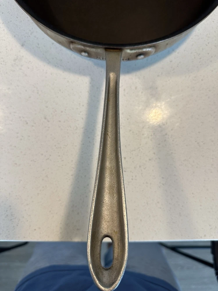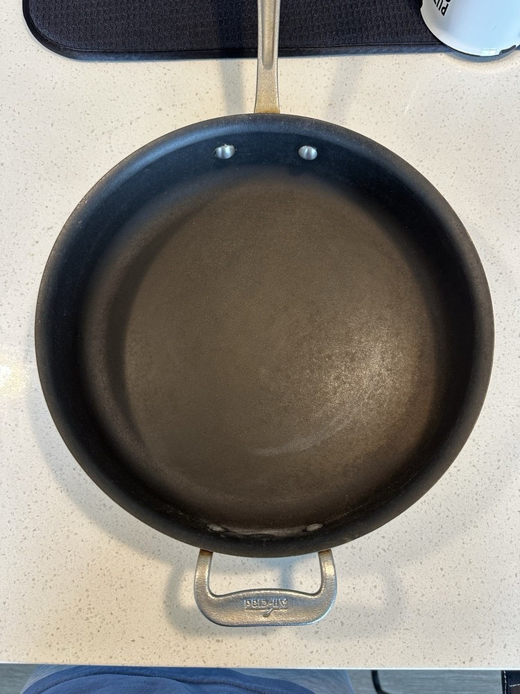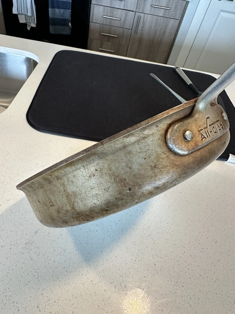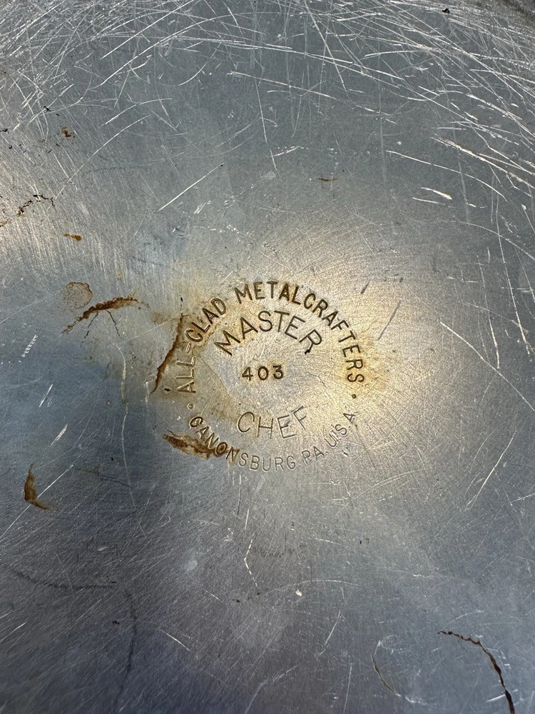 Used All-Clad Master Chef Series 403 skillet/frying pan, made in Canonsburg, PA, USA. 12-inch diameter, solid aluminum construction with riveted handles. Shows signs of heavy use including surface scratches and staining (see photos), but still functional and structurally sound. A solid addition to any kitchen or collector of American-made cookware.