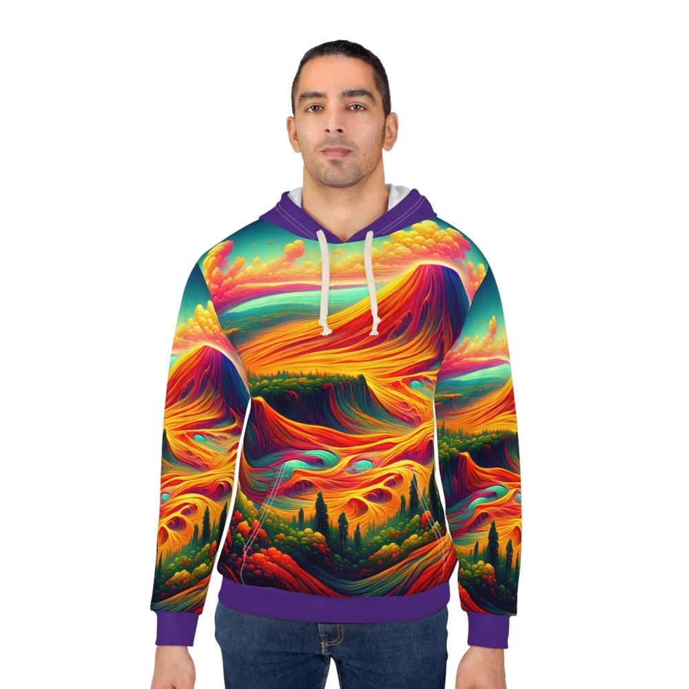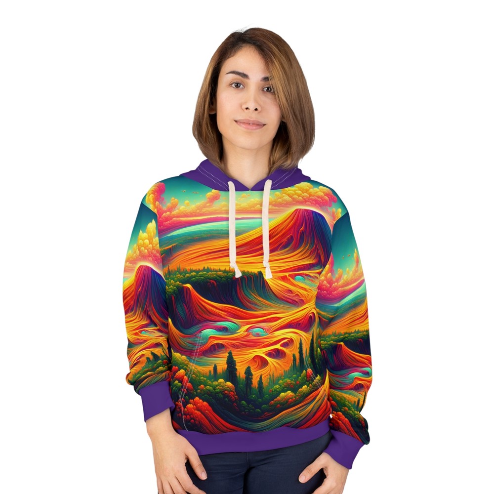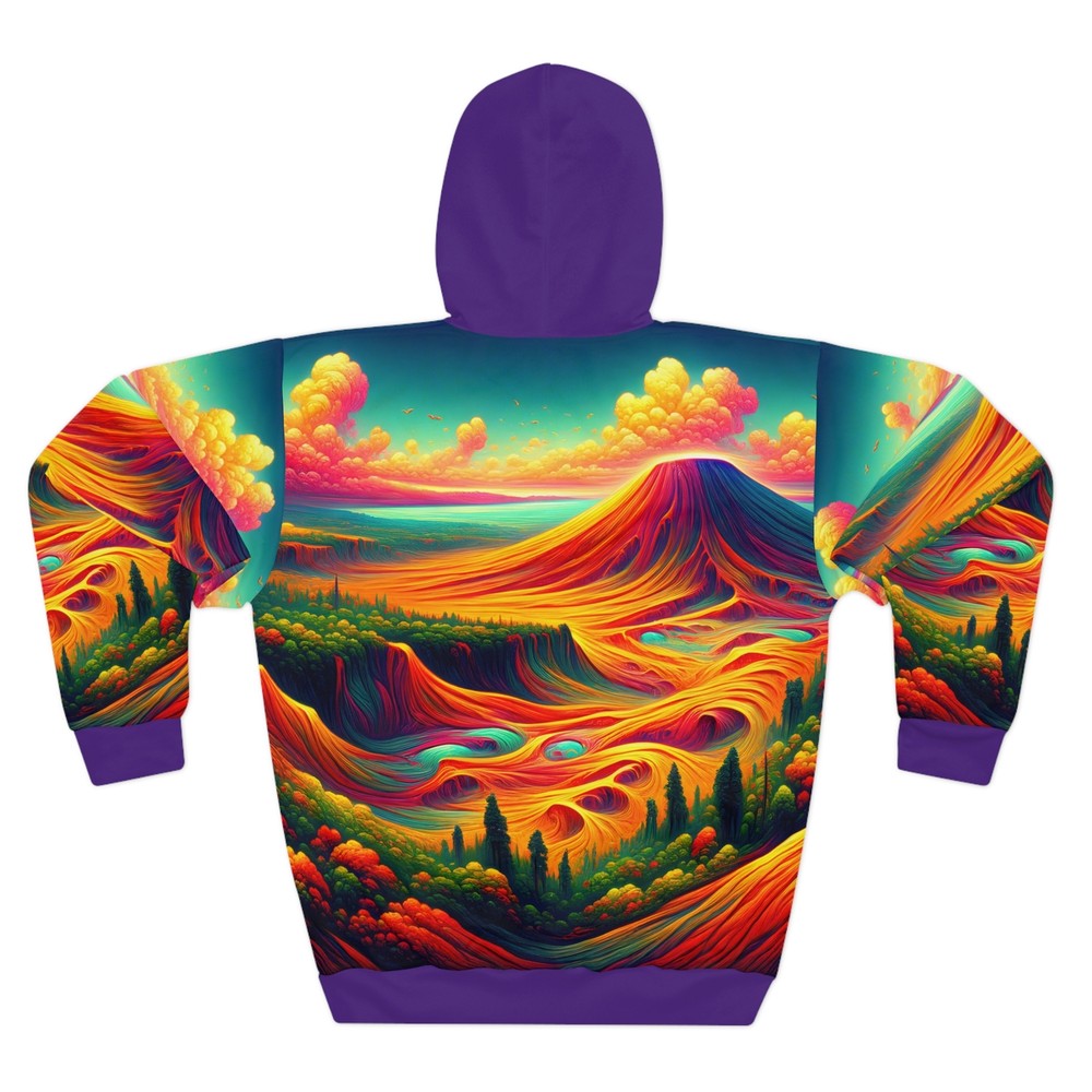 XS S M L XL Length, in 25.00 26.61 27.64 29.25 30.24 Width, in 20.00 21.50 22.99 24.49 26.50 Sleeve Length, in 23.86 24.25 24.88 25.39 25.87 Unleash your adventurous spirit with our All-Over Print Hoodie, inspired by the breathtaking landscapes of Hawai'i Volcanoes National Park. Crafted for ultimate comfort, this unisex pullover features vibrant volcanic designs that evoke the island's beauty. Perfect for outdoor explorations or cozy nights in! This Pullover Hoodie is made for warmth and comfort. Made to be easily customizable without white lines at the seams. It features a large front pocket, a hood with a drawstring, and is custom cut and sewn. Do not dryclean; Do not iron; Tumble dry: low heat; Do not bleach; Machine wash: cold (max 30C or 90F). * 100% polyester * Medium weight fabric: 7.4 oz/yd² (250 g/m²) * Classic Fit * White thread color * Custom cut and sewn * Assembled in the USA from globally sourced parts
