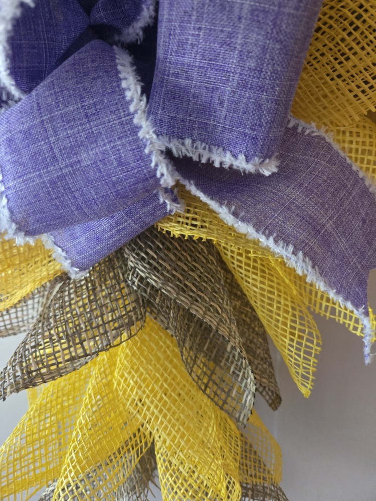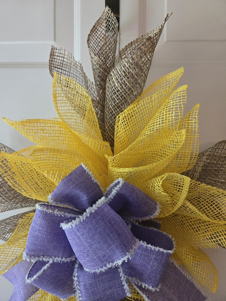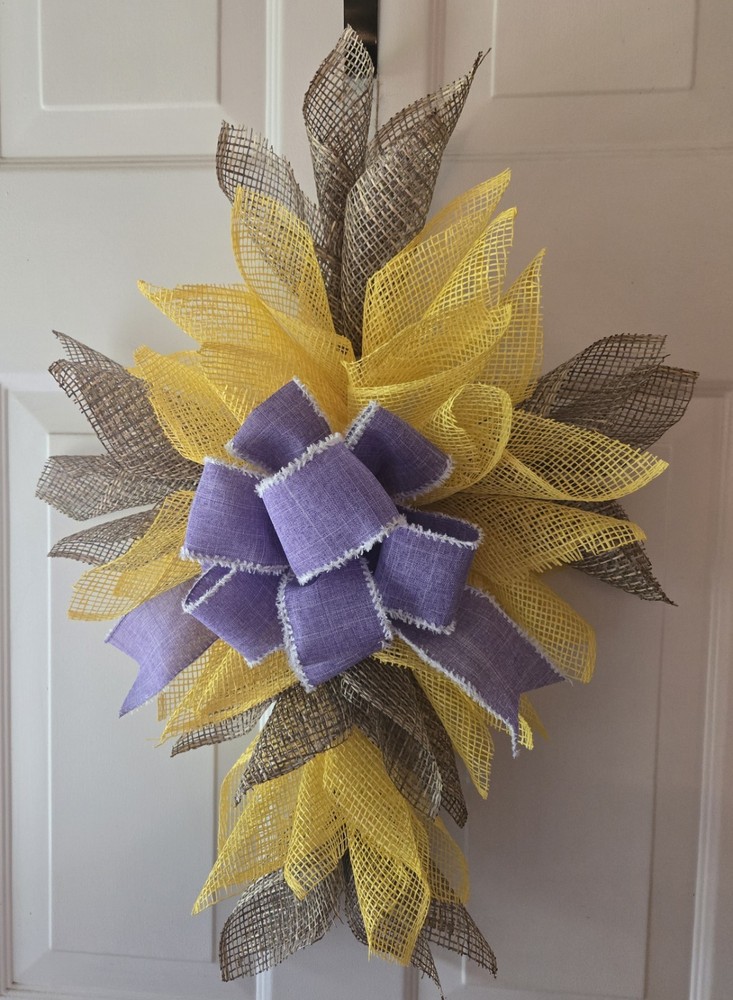The Everyday/Bereavement/All Seasons Deco Mesh Cross Wreath is a beautifully crafted handmade decoration featuring taupe and yellow deco mesh and lavender bow. This artificial wreath is perfect for all occasions, featuring a religious theme and a yellow color that adds a touch of warmth to any home. Deco mesh was cut using a wood burner to minimize fraying. The wreath measures approximately 25 inches from top to bottom and 24 inches across. **I only ship within the U.S. - No International Shipping at this time** Thank you for looking and have a great day!