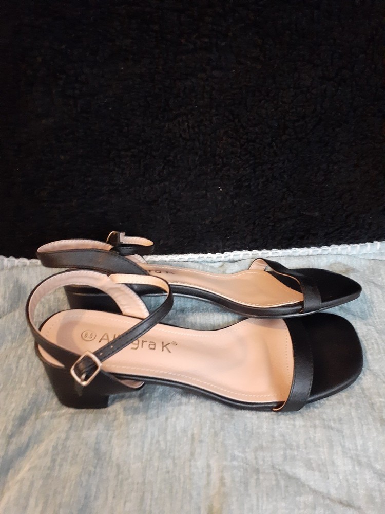 Smoke free home. Worn once. This product is a pair of women's black block heel sandals by Allegra K in size 8.5. They feature an open toe design with an ankle strap closure secured by a buckle. The chunky heel style provides stability and comfort, making them suitable for summer and spring seasons. The upper material is faux leather, giving the sandals an elegant look perfect for various occasions.