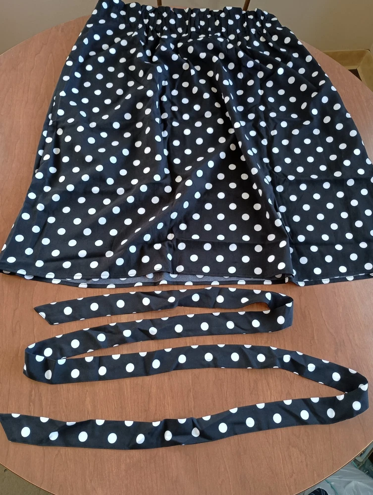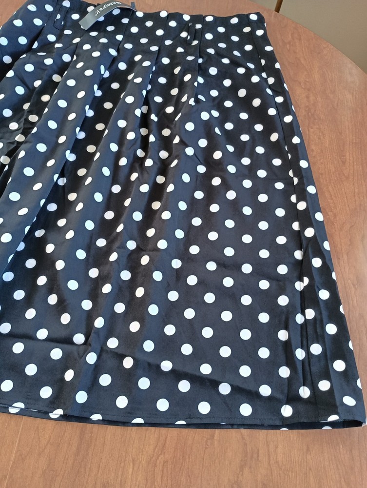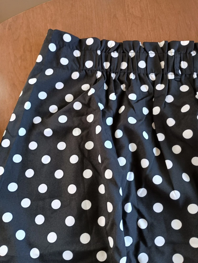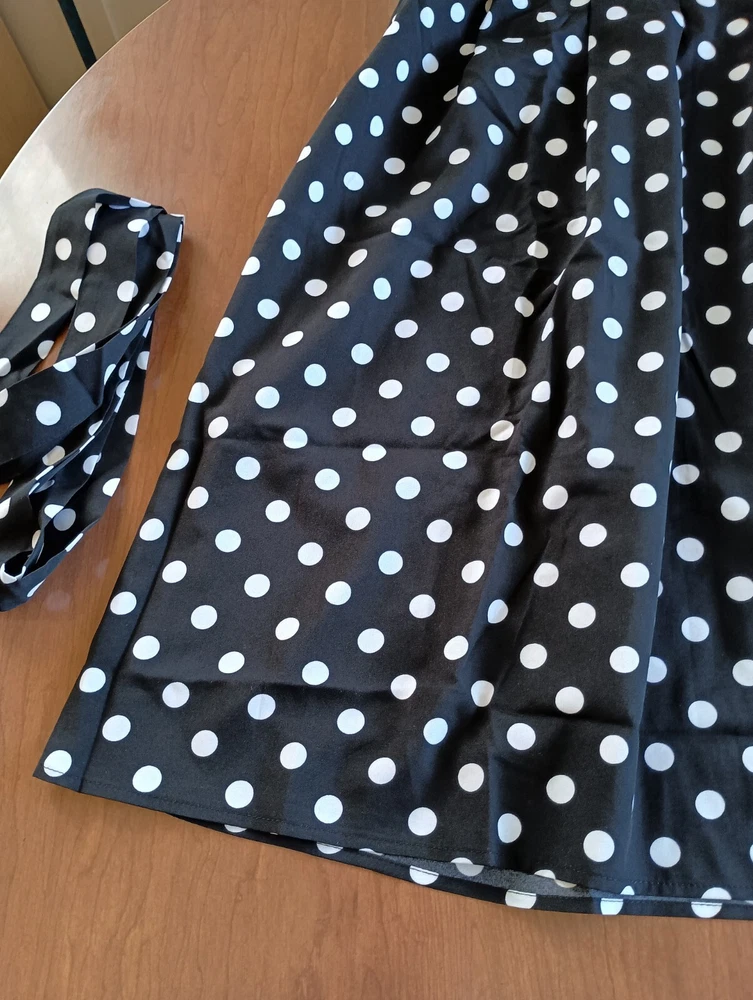 Shell color is black with white Polka Dots. Lining color is black. Size says XL - see photos for exact measurements. Also has secret zipper on one side that zips down about 6inches Shell and lining is 100% Polyester Also comes with Polka dot waist tie belt. This is currently being stored in a smoke/pet friendly home (will be put back in packaging until sold) Please see all photos before purchasing If you have any questions feel free to message me