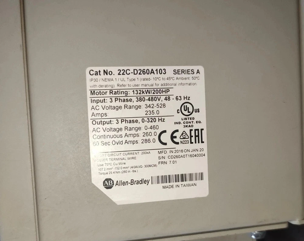 100% Genuine Products + Free & Fast Shipping + 30 Days Return Policy ------------------------------------------------------------------------------------ Allen Bradley PowerFlex 400 22C-D260A103 ( 22C-D260A103 ) 132KW 200HP VFD PRODUCT SPECIFICATIONS: Brand: Allen Bradley Model: PowerFlex 400 MPN: 22C-D260A103 Product Name: INVERTER AC DRIVE ( VARIABLE FREQUENCY DRIVE ) MOTOR: 132KW = 200 HP INPUT: Voltage= 380-480 V Phase= 3-Phase Ampere= 235A Frequency= 48-63Hz OUTPUT: Voltage Range= 0….460 V Frequency= 0..320 Hz Phase= 3 Phase Continous Amp= 260 A 60 sec Ovld Amp= 286 A PRODUCT CONDITION: SPARE CONDITION ( SUPERIOR QUALITY ) PRODUCT LOOKS THE SAME AS IN THE PICTURES; PLEASE CHECK ALL THE PICTURES PROPERLY BEFORE BUYING. SEE OUR LISTING DESCRIPTION FOR FULL DETAILS. 1.payment method: Payoneer is the only online payment method we accept. Please make sure you have a valid/confirmed Payoneer account. 2. shipping policy: Usually, we ship all items within 2-3 days of receiving cleared payment, except Sunday & holiday in India. In case of any delay, you will be duly informed and will update you with the expected date of dispatch. note - delivery time depends on destination and other factors. This is the expected time of delivery and sometimes it may take a longer period of time because of your country's customs clearance. 3.custom policy: import duties, taxes and charges are not included in the sale price. These charges are the buyer's responsibility. 4. return policy: Please contact us before making a Return Request on eBay. We will do our best to make your return as pain free as possible. Return accepted within 30 days. Duty charges and Shipping charges will be borne/paid by the buyer. Please check the listing properly as returns are not accepted only for parts products. 5. feedback: Please note that your feedback is always important for us. In case you have any problem with your purchase or the item, please do contact us, we will always be there to help you. Please don't open a case or leave negative feedback without contacting us. If you contact us, we will try to solve the issue in your favor faster than the eBay resolution center process. to see our full range of products, visit our eBay store. Looking forward to your positive feedback!!! happy shopping