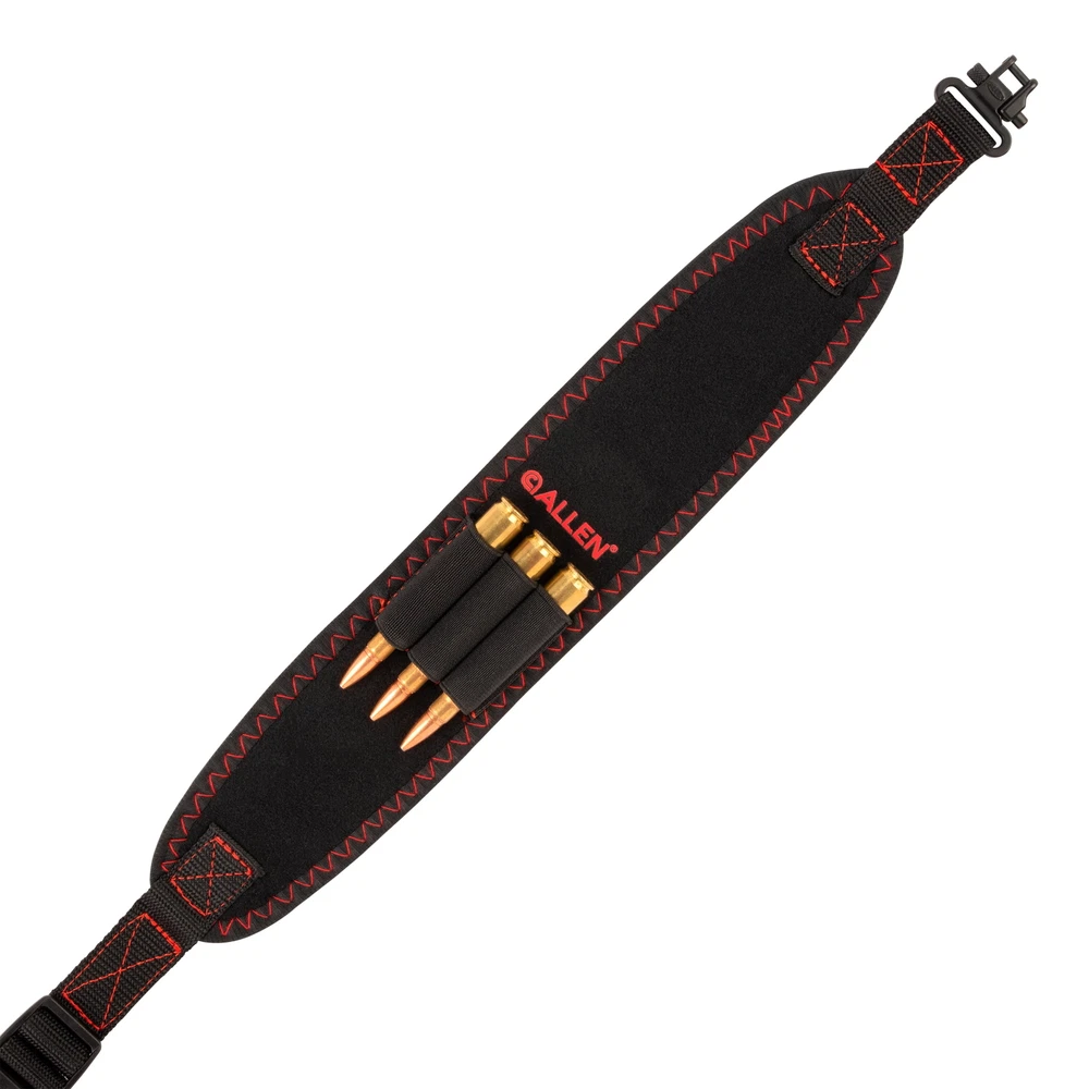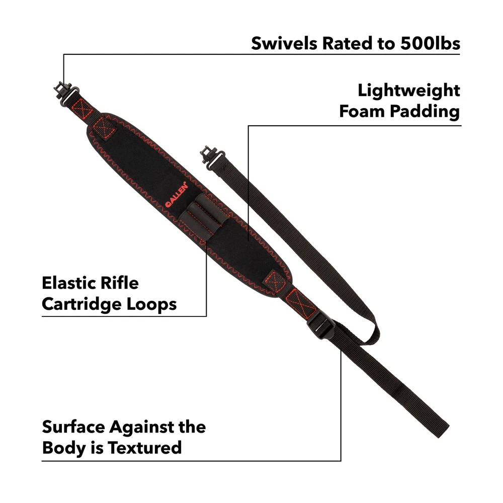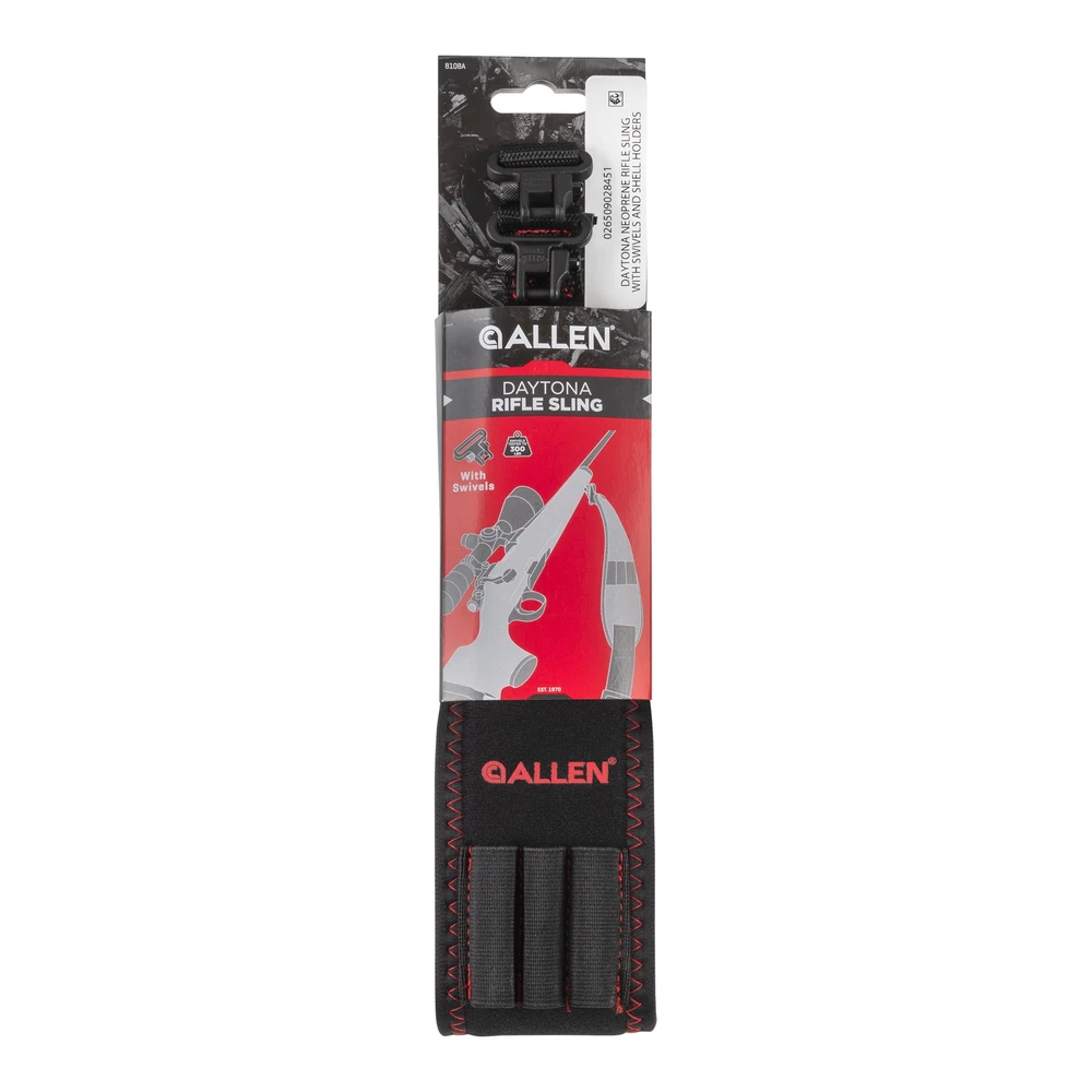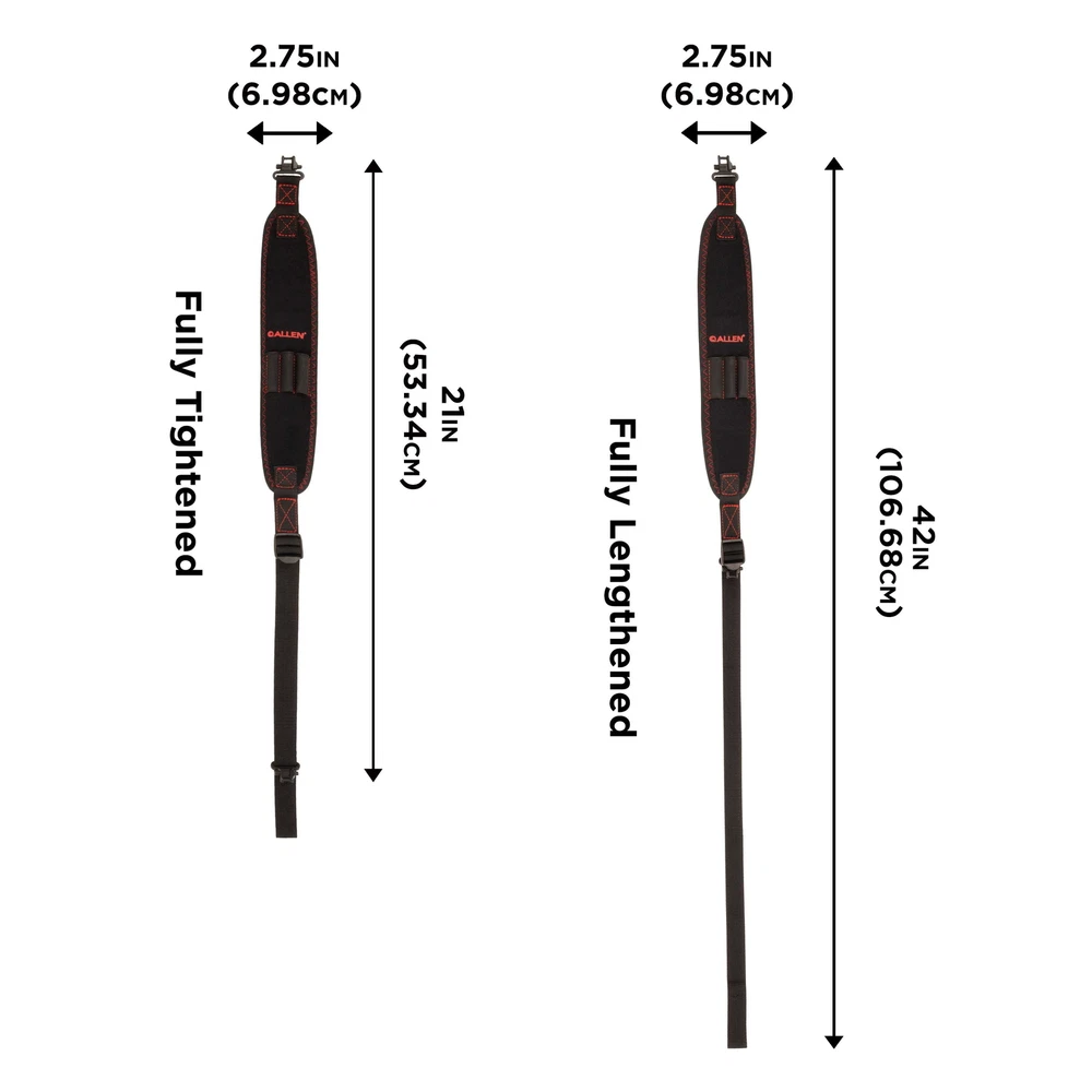 The Allen Company Adjustable Daytona Gun Sling features a rugged, heavy-duty design with swivels tested up to 500-pounds. Lightweight, neoprene padding is comfortable on your shoulder and provides a texture grip to ensure your gun sling will not fall off while in use. Elastic rifle cartridge loops keep you ready when at the range or in the field. Gun sling adjusts from 21-inches to 42-inches long, depending on your firearm. Transport your firearm to and from the field with confidence and security. Neoprene Firearm Sling. Brown. Allen Company Daytona Neoprene Firearm Sling, Adjustable Length 21" to 42"L, Black. Neoprene Shoulder Pad Cushioning Elastic Rifle Cartridge Loops Black Heavy Duty Web Construction Adjustable to desired length Highly durable, securely holding firearm in place 42" Max Length 21" Min Length Allen Company Daytona Neoprene Firearm Sling, Adjustable Length 21" to 42"L, Black