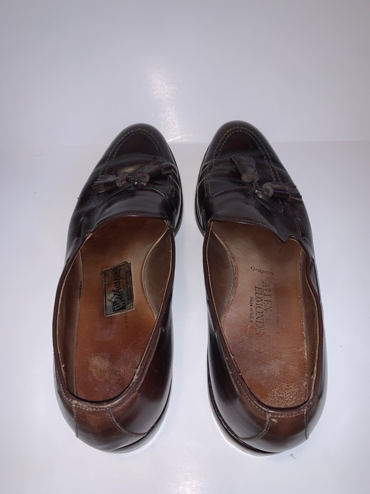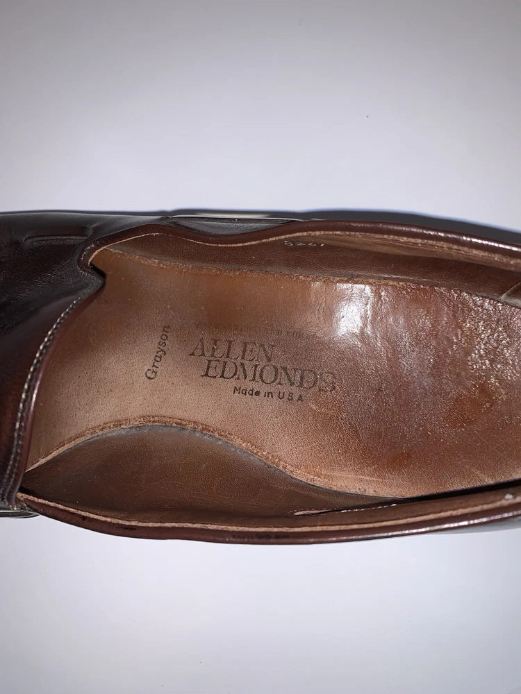 Theme: USA Style: Loafer Type: Dress Pattern: Solid Color: Brown Vintage: No Accents: Tasseled US Shoe Size: 11 Brand: Allen Edmonds Insole Material: Leather Customized: No Department: Men Shoe Width: D Closure: Slip On Product Line: Grayson Lining Material: Leather Country of Origin: United States Outsole Material: Leather Upper Material: Leather Season: Summer, Fall, Spring