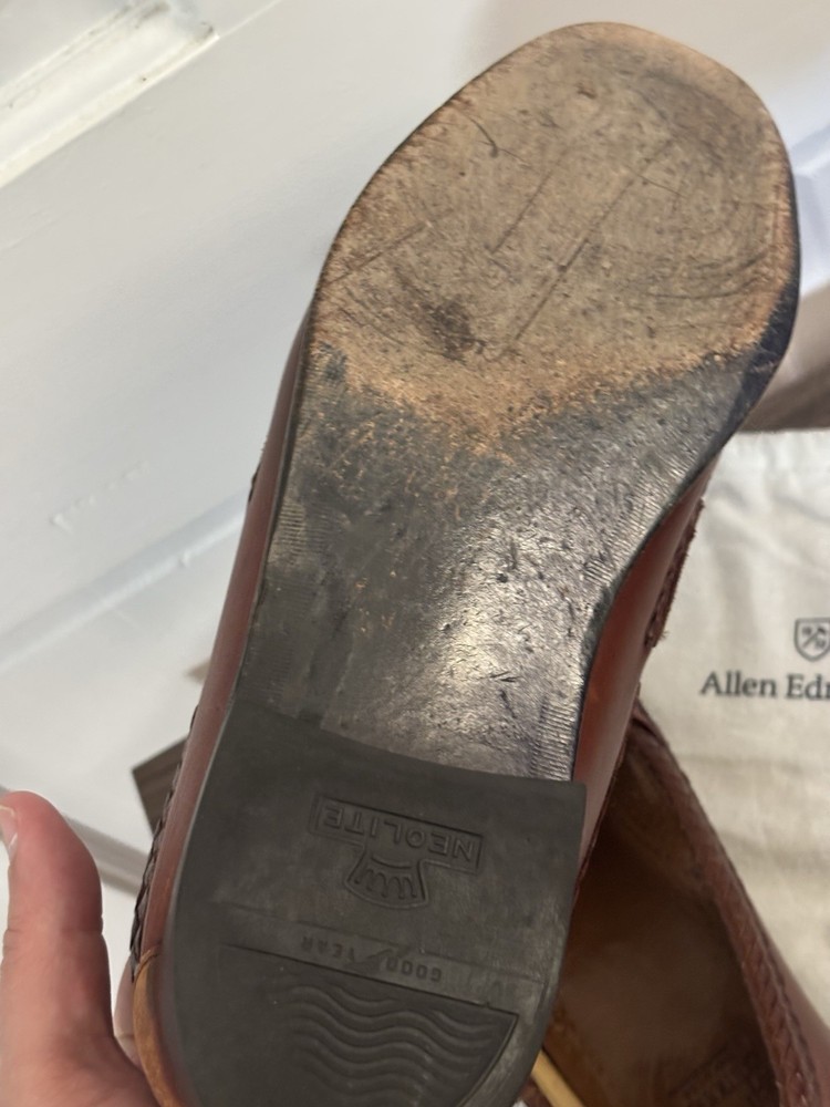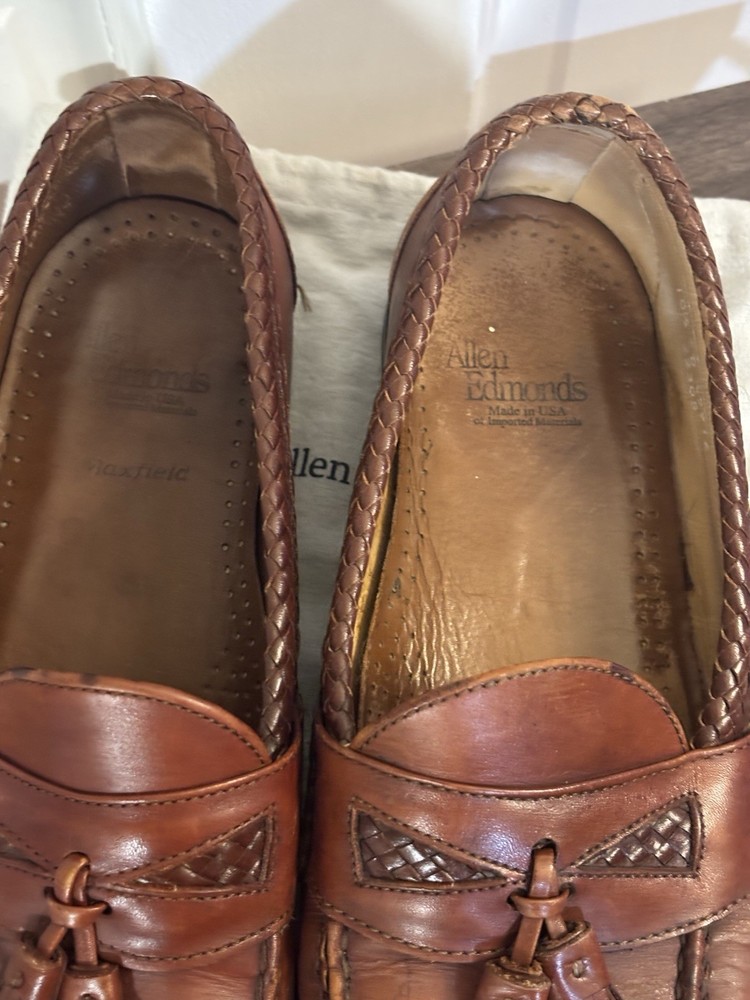 The Allen Edmonds Maxfield Brown Leather Tassel Shoes are classic men's dress loafers made in the USA. Featuring a slip-on closure and wide shoe width, these shoes are crafted with leather lining, insole, and upper material. The tasseled accents add a stylish touch to the solid brown color, making them perfect for a sophisticated and timeless look. With the renowned Allen Edmonds brand and Oxford style, these shoes are designed for a classic and elegant appeal. *scratch on toe