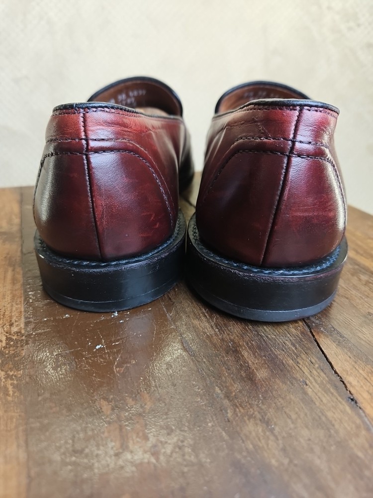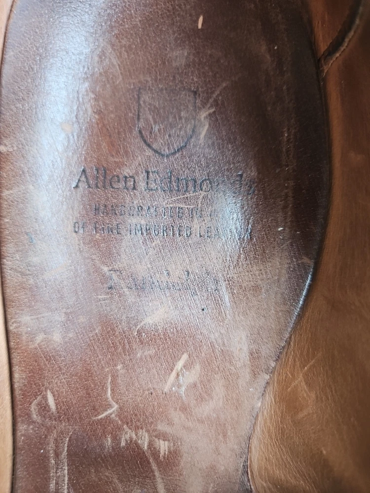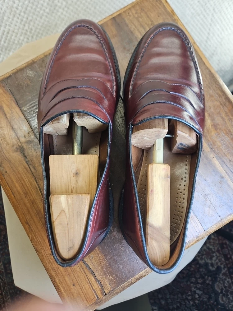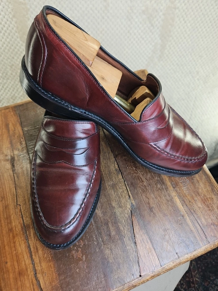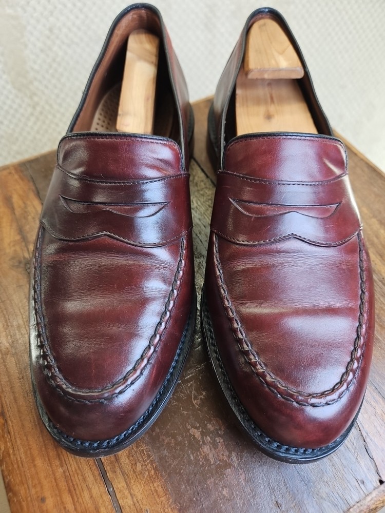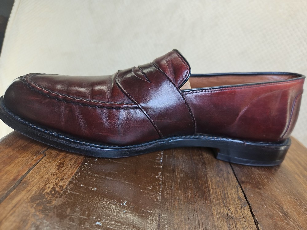The Allen Edmonds RANDOLPH Brown Leather Penny Loafers Dress Shoes are premium quality men's shoes with a classic almond toe shape and slip-on closure. Made with genuine leather, these shoes feature a cushioned insole and leather lining for maximum comfort. The solid Chile brown color and solid design make them versatile for any season, while the EEE shoe width ensures a comfortable fit for those with broader feet. With a brand like Allen Edmonds and a reputation for excellence, these shoes are a stylish and practical choice for any dressy occasion. It appears that theae shoes have recently had new soles and heels added by Nu Shoes soles and GTO Italia heels. Beautiful job was done for long lasting comfort and wear...B2461