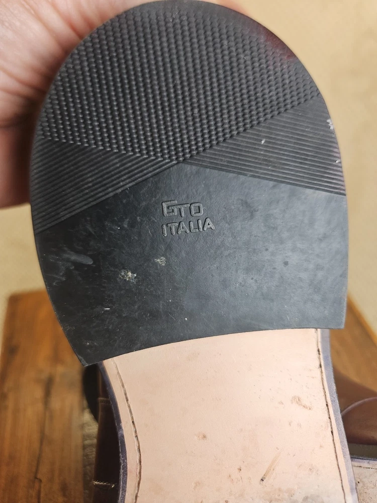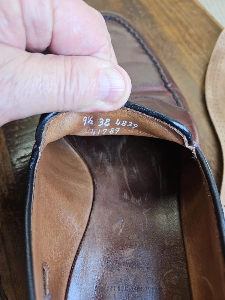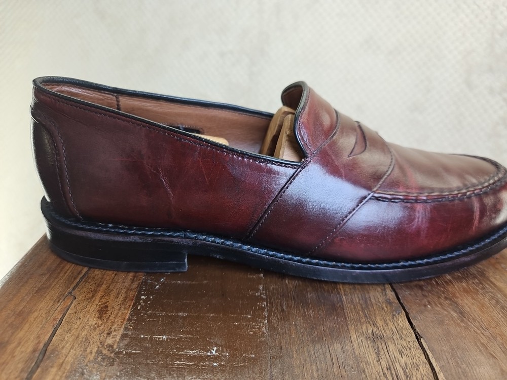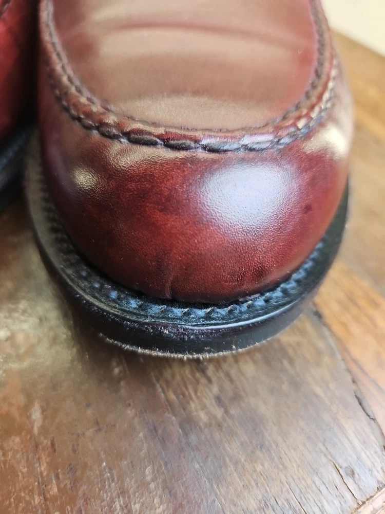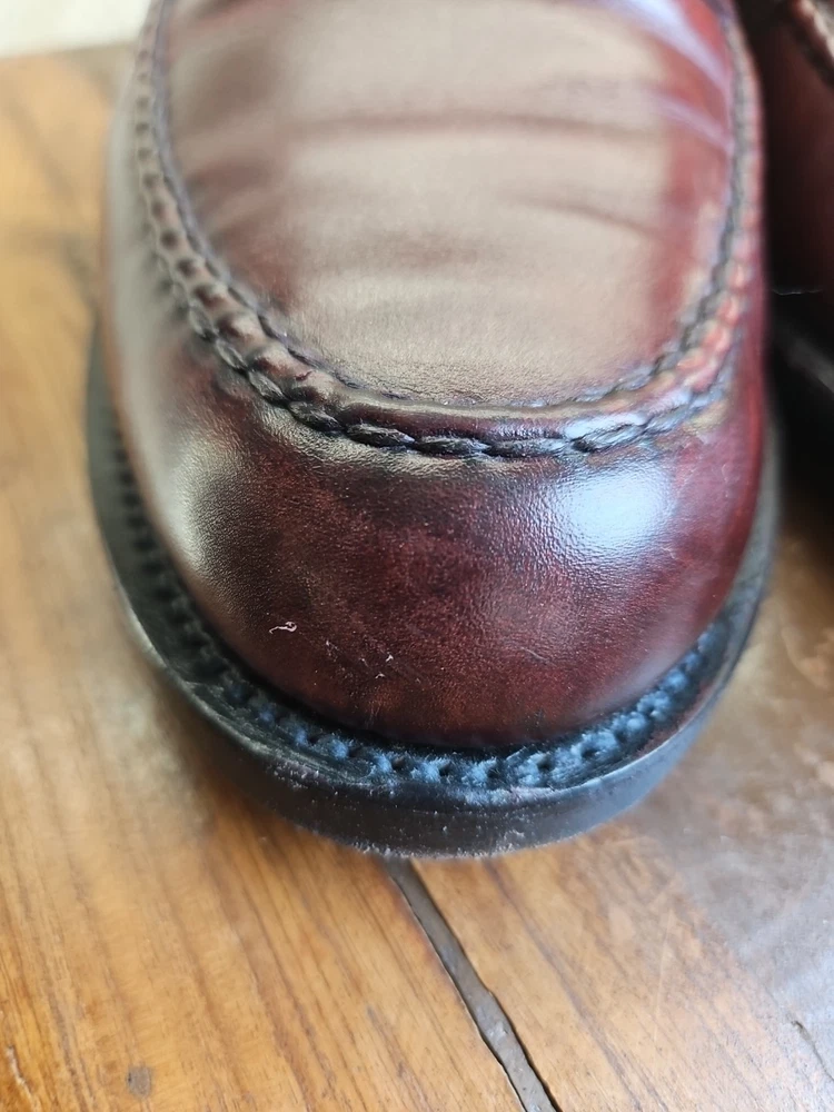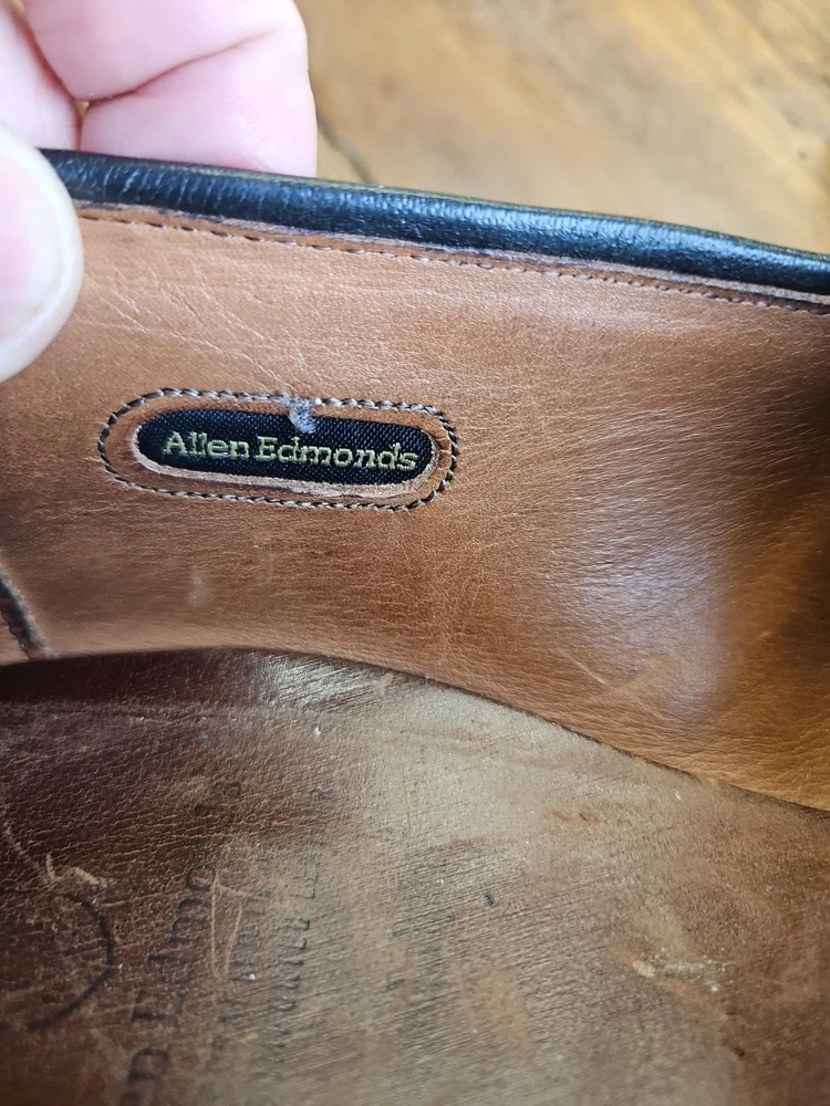 The Allen Edmonds RANDOLPH Brown Leather Penny Loafers Dress Shoes are premium quality men's shoes with a classic almond toe shape and slip-on closure. Made with genuine leather, these shoes feature a cushioned insole and leather lining for maximum comfort. The solid Chile brown color and solid design make them versatile for any season, while the EEE shoe width ensures a comfortable fit for those with broader feet. With a brand like Allen Edmonds and a reputation for excellence, these shoes are a stylish and practical choice for any dressy occasion. It appears that theae shoes have recently had new soles and heels added by Nu Shoes soles and GTO Italia heels. Beautiful job was done for long lasting comfort and wear...B2461