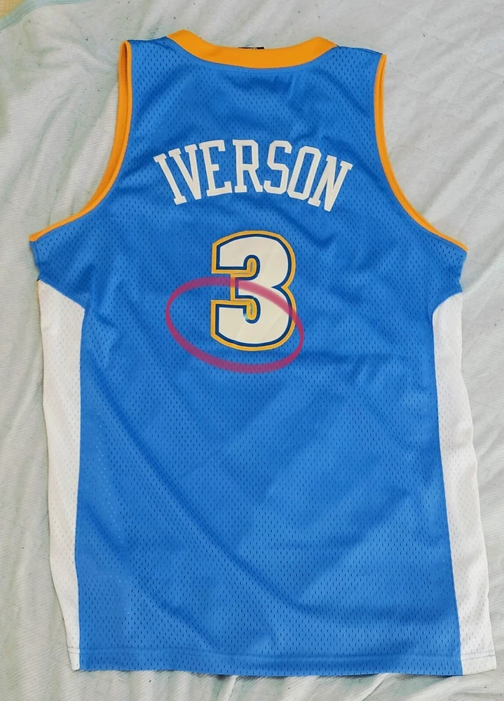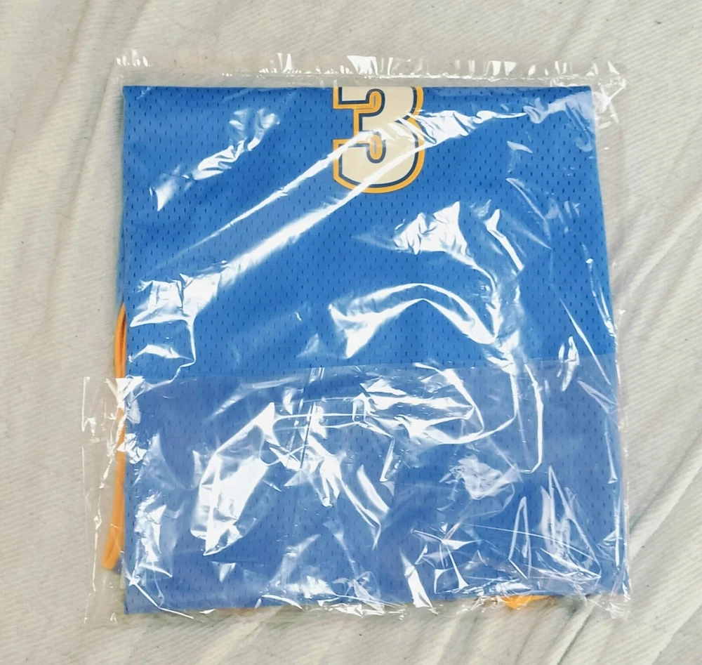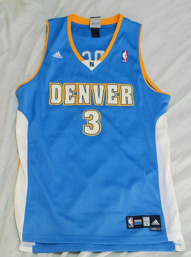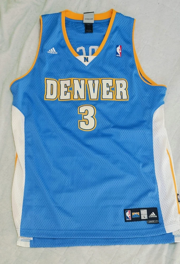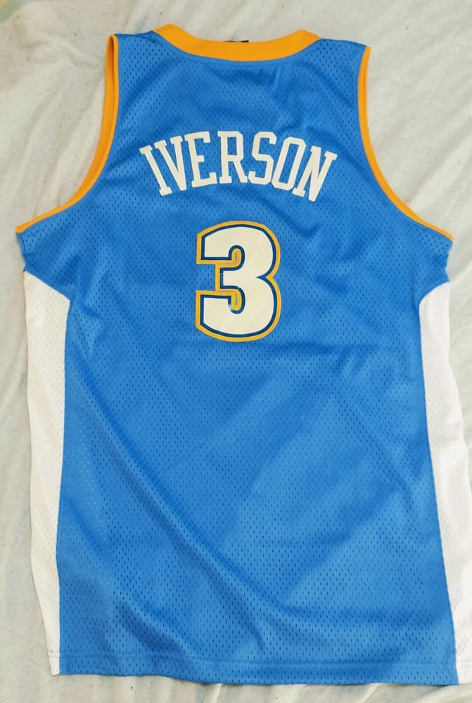 Allen Iverson Denver Nuggets Baby Blue Authentic Jersey Brand: Adidas, NBA Authentics Size: Large (+2 Length) (Measurements below) Care Instructions: 100% polyester Machine wash cold water Wash with like colors Do Not Bleach Do Not Iron Ornamentation Made in Honduras Details: Condition: Used but in very good condition. Design: Iconic Denver Nuggets baby blue jersey with yellow and white accents. "Nuggets" and the number "3" are stitched on the front, and "Iverson" with "3" is stitched on the back. Slight smudge on the number "3" on the back. No discoloration, no loose stitches, and all embroidery is intact. Printing Condition: All logos, text, and numbers are intact except for the slight smudge on the back "3." Measurements: Collar: 18 cm (7.1 inches) Length: 82 cm (32.3 inches) Chest: 58 cm (22.8 inches) Weight: 250 g Packaging Details: The jersey will be shipped folded in protective wrapping and placed in a padded envelope. Environment: Tobacco-free and pet-free home. Carefully maintained over the years. This is a must-have for fans of Allen Iverson and the Denver Nuggets! Own a piece of NBA history with this stylish and well-preserved jersey. Don’t miss your chance to add it to your collection!
