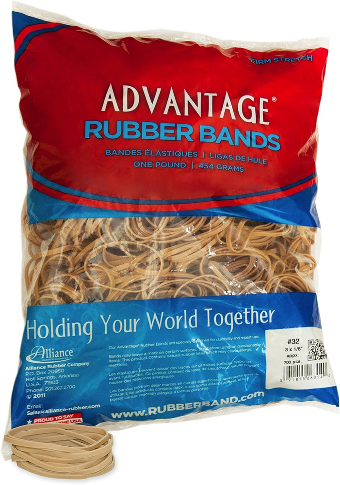 HIGH COUNT PER POUND: Advantage rubber bands have a mid-range rubber content and offer a high count per pound so you know you're getting a great value with these quality elastic bands. FIRM AND STURDY STRETCH: These rubber bands offer an easy stretch with an ultimate elongation of 700% from their original size. Use them for a variety of tasks requiring a firm and sturdy hold. IDEAL FOR EVERYDAY USE AT HOME: Advantage elastic bands are a handy and useful tool to have around the house. Use them to keep crafts, tools, games and other items organized or to keep food packaging closed to seal in freshness. OFFICE TOOL: Use Advantage elastic bands in the office to keep mail, folders and paperwork organized and tidy whether you work in a large office or have a home business. MADE IN THE USA: Advantage rubber bands are made in the USA so you know that you're receiving a high quality product, fresher stock and faster service. Alliance Advantage Bands are a great choice for go-to everyday rubber bands for a variety of applications. With a mid-range rubber content and a sturdy, firm stretch these elastics provide users with both value and durability. With a soft stretch and an ultimate elongation at 700%, Advantage elastic bands are ideal for many different environments and tasks. Rubber bands are a useful and handy tool to keep around the house. They're great for organizing and storing kid's crafts and games, and are perfect for food storage and transport. Elastics can be used to give a broom new life by wrapping the bristles tight, or to secure a loose battery cover on a remote control. Advantage elastic bands are also great for core office tasks as well as industrial and warehouse environments. They provide an excellent hold and firm stretch so they can be used for more demanding tasks and projects. Rubber bands can be used for bundling and filing paperwork and folders or for keeping tools and equipment organized.