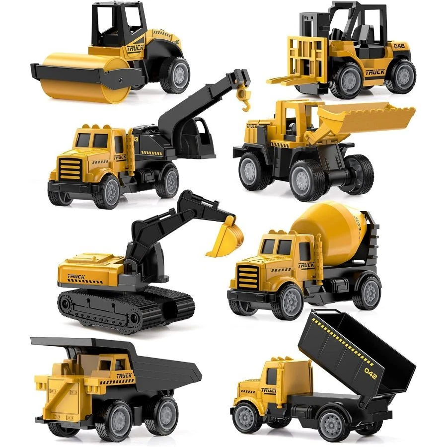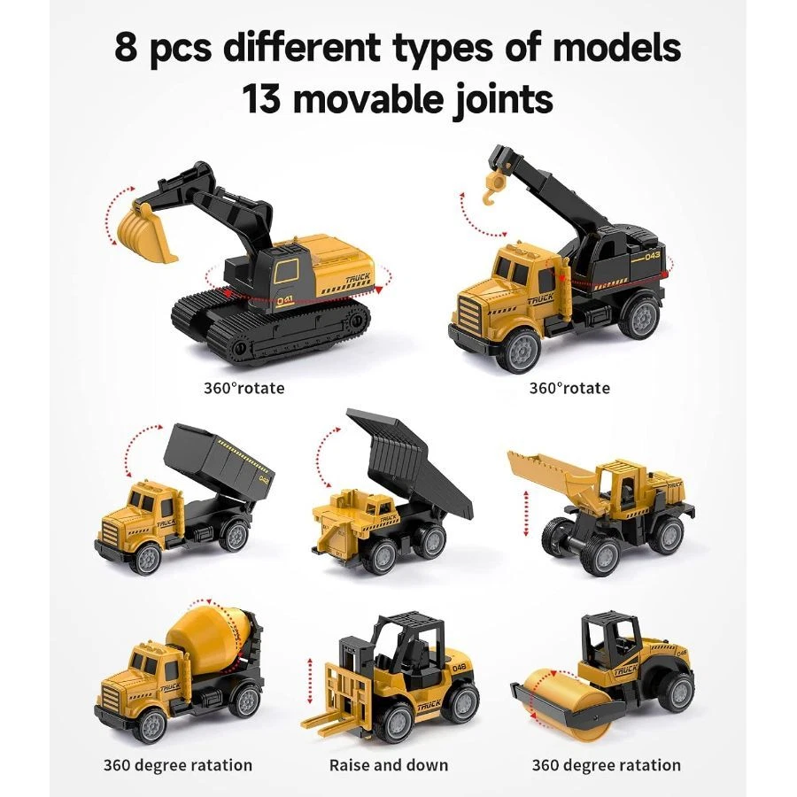 8 Pcs Construction Set: includes 1 pcs Bulldozers, 1 pcs excavator, 2 pcs dump, 1 pcs cement mixer truck, 1 pcs forklift,1 pcs , roller which enhance the 's curiosity through different models. Luxury Engineering Trucks: Truck head made of heavy duty Alloy metal Material, other parts made of Plastic rubber tire. All are durable and non-toxic, smooth, no share corner, safe for kids. Realistic Vehicles Model: Moving Parts allow Excavator to rotate, Dump Truck to unload, and Bulldozer bucket to rise, which develops kids fine finger skills. kids can do all kinds of construction job with the vehicles. Great Gift Idea: These Engineering trucks could stimulate kid's imagination and encourage hand-eye interaction.You could set these as Birthday Cake Topper for Kids who love construction vehicles.And these are Great for Back to school, Thanks giving, Christmas, Year, Easter, kids' birthday gift,party favors,cake topper,collection and home decoration. On Jan 14, 2025 at 18:38:17 PST, seller added the following information: