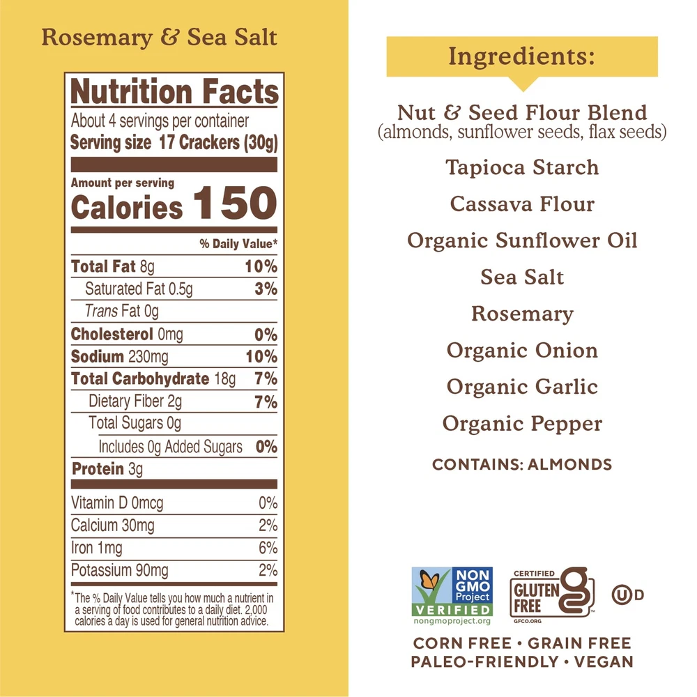 , Variety Pack, Fine Sea Salt 4.25 oz Pack of 6 Receive 6 boxes of Rosemary & Sea Salt Almond Flour Crackers. The herbaceous cracker that you deserve and deserves a prime spot on your next cheese board or dip spread. Take a look at our nutritious cracker ingredients. Nutrient dense, purposeful ingredient list for these delicious snacks from . See our reviews on your iPhone, iPad, Android, or laptop by scrolling down to see how other consumers rate our delicous taste! Nothing artificial, ever. Shelf stable snack that is perfect for stocking up the pantry and great way to gain energy and boost productivity Made With Simple Ingredients, Certified Gluten free, Non-GMO, Grain Free, Corn Free, Paleo Friendly, Plant Based