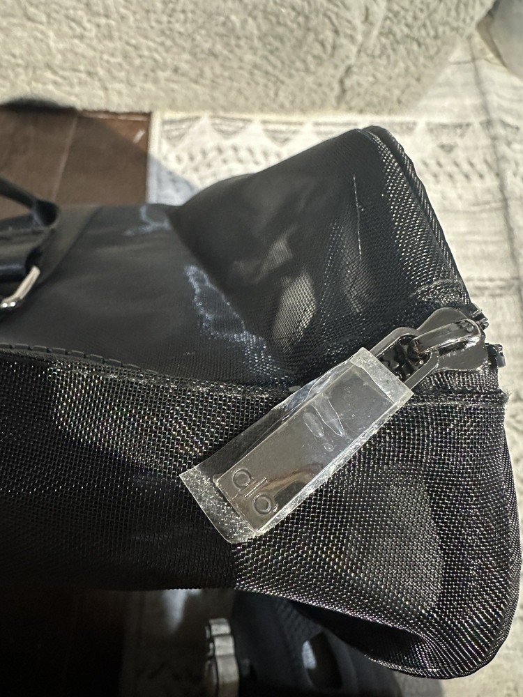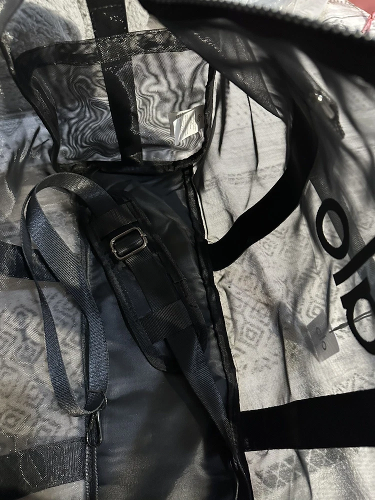 Country of Origin: United States Bag Depth: 7 in Handle Style: Double Handles Theme: Sports Hardware Material: Silver Accents: Zipper Exterior Color: Black Handle/Strap Color: Black Vintage: No Finish: Matte Handle/Strap Material: Nylon Features: Lightweight Personalize: No Style: Crossbody Fabric Type: Knit Lining Color: Black Exterior Material: Nylon, Mesh Occasion: Travel Closure: Zip Shape: Rectangle Hardware Color: Black Handmade: No Department: Women Pattern: Solid Customized: Hot Stamped Initials Size: Large Accessories: Luggage Tag, Detachable Strap, Bag Charm, Handle Keeper, Lock Brand: Alo Yoga
