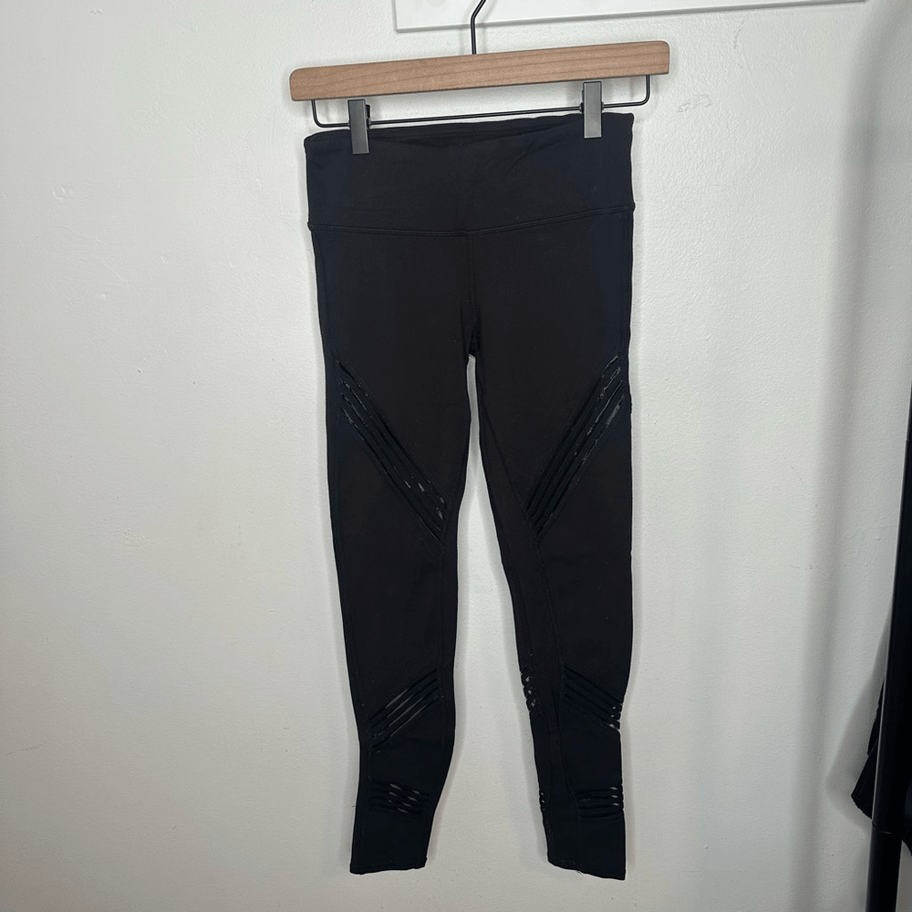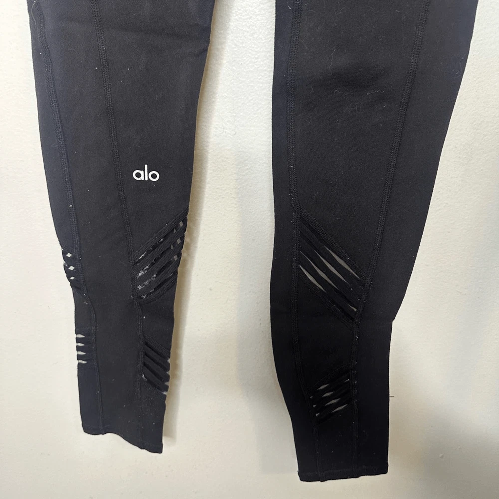 Alo Yoga Sheer-Inset Leggings Fits true to size, order your normal size • Elasticized waistband, interior pocket in waist • Filament detail, pull-on style Mid rise Color: Black Size: XXS Excellent Pre Owned Condition