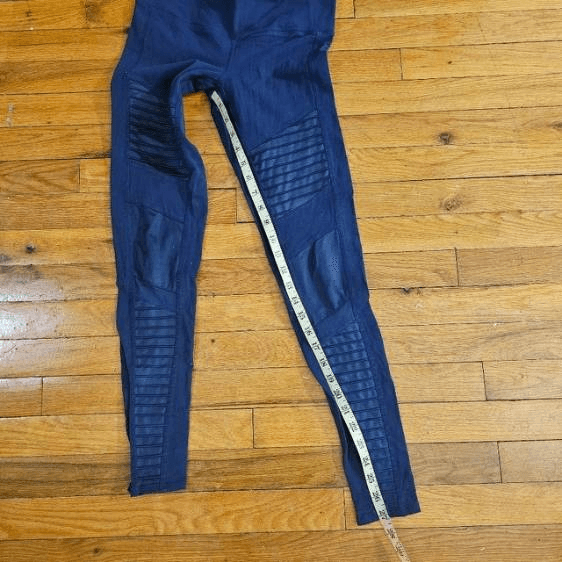 It looks like the leggings are worn. The actual measurements of the clothes are in the photos. If the clothes have a defect, it will be shown in the photos.The clothes are not washed by me so they may smell like dirty clothes or other things. Good condition.