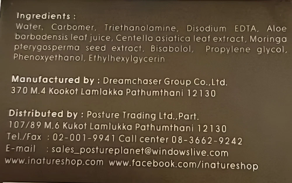 INature Thai Aloe Vera Moringa Gel Soothing Hydration Overnight Mask x2 Brand : INature Condition : New, 💯% Authentic. Size: 100g Quantity : 2 Boxs Thai FDA No.: 13-1-6600035097 Looking for a gentle, effective solution for tired or reactive skin? INature Aloe Moringa Gel is designed for those seeking a naturally inspired skincare option that provides daily hydration, post-sun care, and overnight recovery — all in one. Formulated with skin-friendly ingredients like aloe vera, moringa seed extract, centella asiatica (cica), chamomile, and snail secretion filtrate, this multi-purpose gel helps to comfort sensitive skin, support hydration, and improve overall texture and radiance. Why Choose INature Aloe Moringa Gel? Ideal for skin under stress: Helps balance skin that has been exposed to sun, pollution, or frequent cosmetic use. Great for sensitive and combination skin: Lightweight formula that absorbs quickly without clogging pores. Multi-use versatility: Use it as a daily moisturizer, calming after-sun gel, or overnight sleeping mask. Naturally inspired ingredients: Made with plant-based extracts and free from parabens, alcohol, and heavy fragrances. Visible skin improvement: Regular use helps reduce the appearance of uneven skin tone and dryness. Recommended For: Individuals with sensitive, easily irritated skin Those recovering from the effects of strong cosmetic or skincare products People looking for a clean, simple skincare routine with multi-use benefits Anyone who prefers lightweight hydration and botanical-based care How to Use : Apply a generous amount on cleansed skin. For daily use, apply a thin layer and let it absorb. For overnight care, apply a thicker layer as a sleeping mask and leave on until morning. No rinsing required. ✈️✈️Shipping & Handling✈️✈️ ✈️✈️✈️Ships from Thailand ( with tracking ) Handling time: 3–5 business days. Estimated delivery: 11-23 business days depending on your location. Thank for visiting and shopping with us🙏🙏🙏