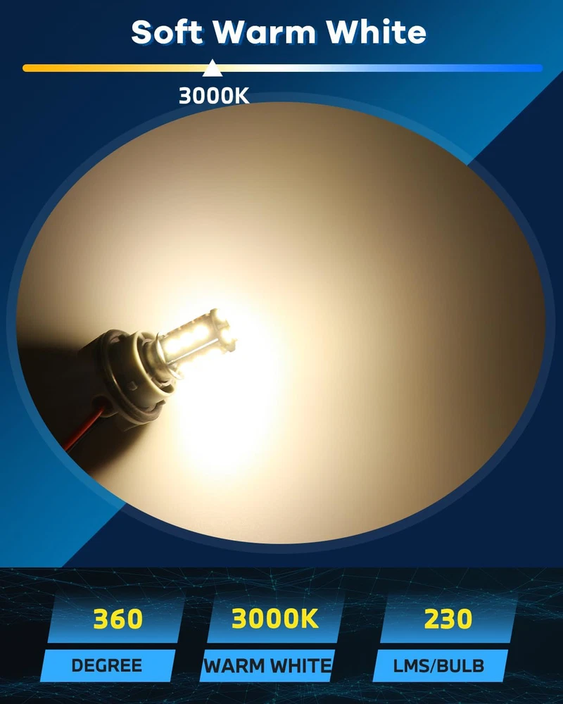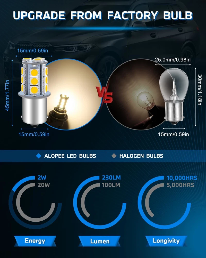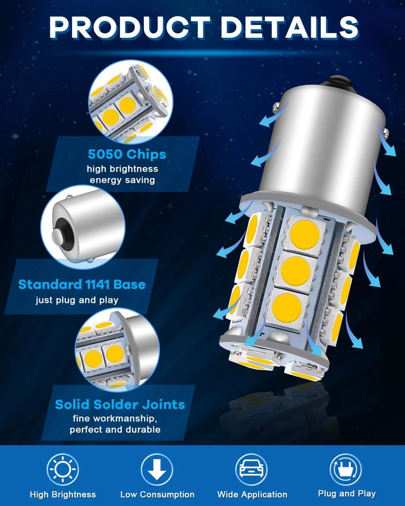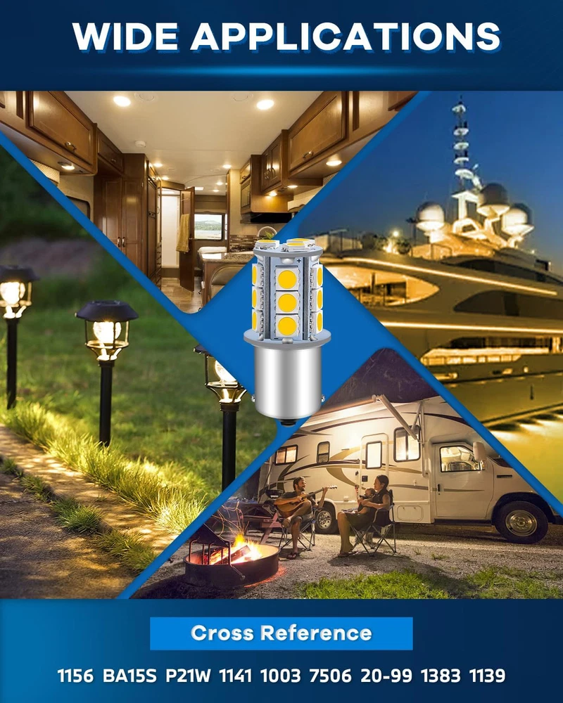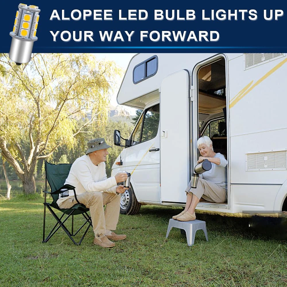 ???RV Light Bulbs???The working volts of this rv light bulb is 12V DC( can't exceed 13V or connect to AC volts, otherwise it is easy to burn); Power: 2.0W, lumens: 230 lumens, Length: 43mm 1.69" ; Diameter: 15mm 0.59" ; Color: Soft warm white 3000K; LED Types: 18pcs 5050 Chipsets; Lifespan: 10,000 Hours ???1156 Led Bulb???Alopee 1156 led bulb base, easy fit OEM# 1156 1003 BA15S P21W 1156A 1156NA 87 93 97 97A 97NA 199 631 1073 1095 1141 1195 1295 2396 3497 5007 5008 7506 12088 1295NA etc ???1141 Led Bulb RV???Impressive 12v 1141 led bulbs rv warm white for traditional ones. Can be used for exterior tail lights, backup lights, reverse lights, turn signal lights, interior cargo trunk lights on cars, motorcycles, trucks, porch light bulb in rv camper, marine cabin boats lighting ???RV Led Lights Interior 12v???Inside stable resistor makes 12v 1156 bulb more reliable; Unique chipsets sequence enhances luminous efficiency; High power 18pcs 5050 chips creates ultra bright & energy saving luminous; 12 bulbs included, value for the money; Soft warm white color will make you feel relax and not harsh to your eyes ???Camper Light Bulbs???Any problems about our 1156 camper light bulbs, we will always be here to help you solve it