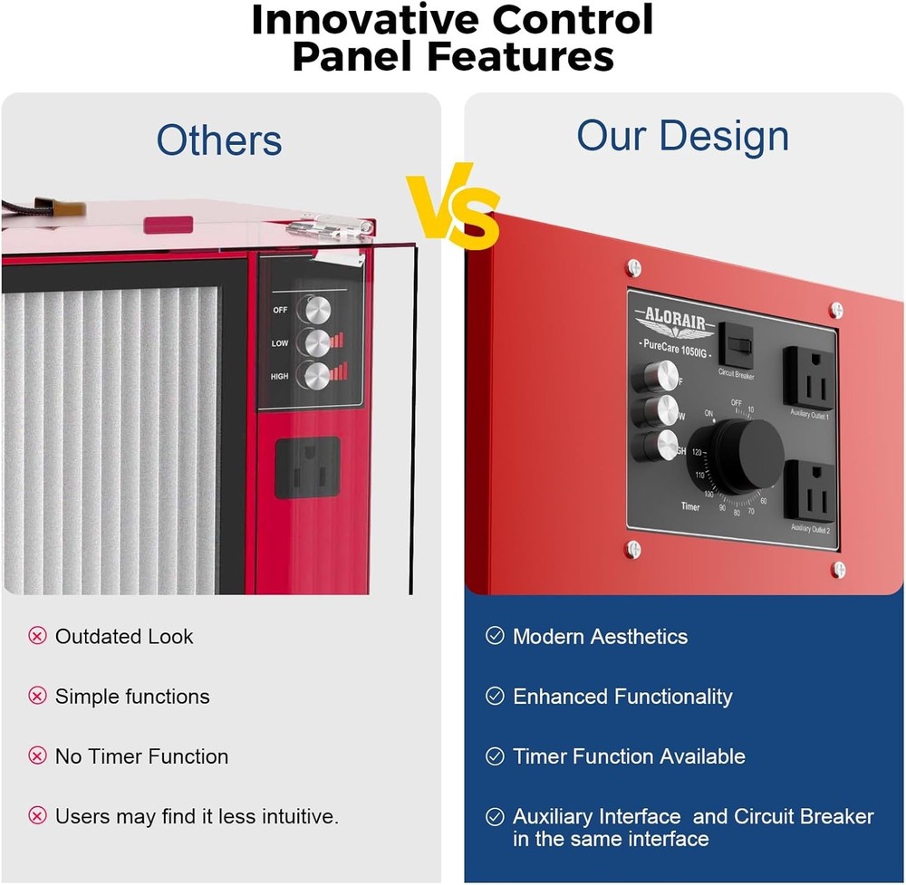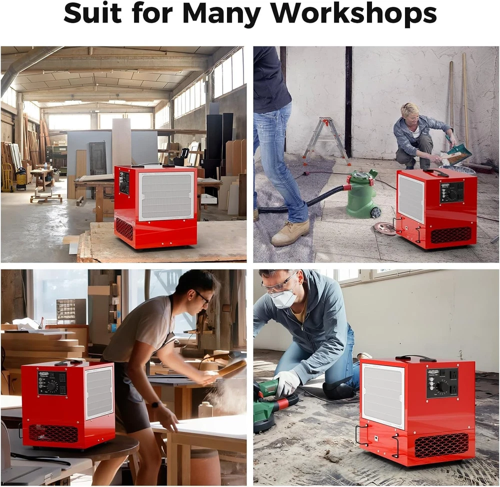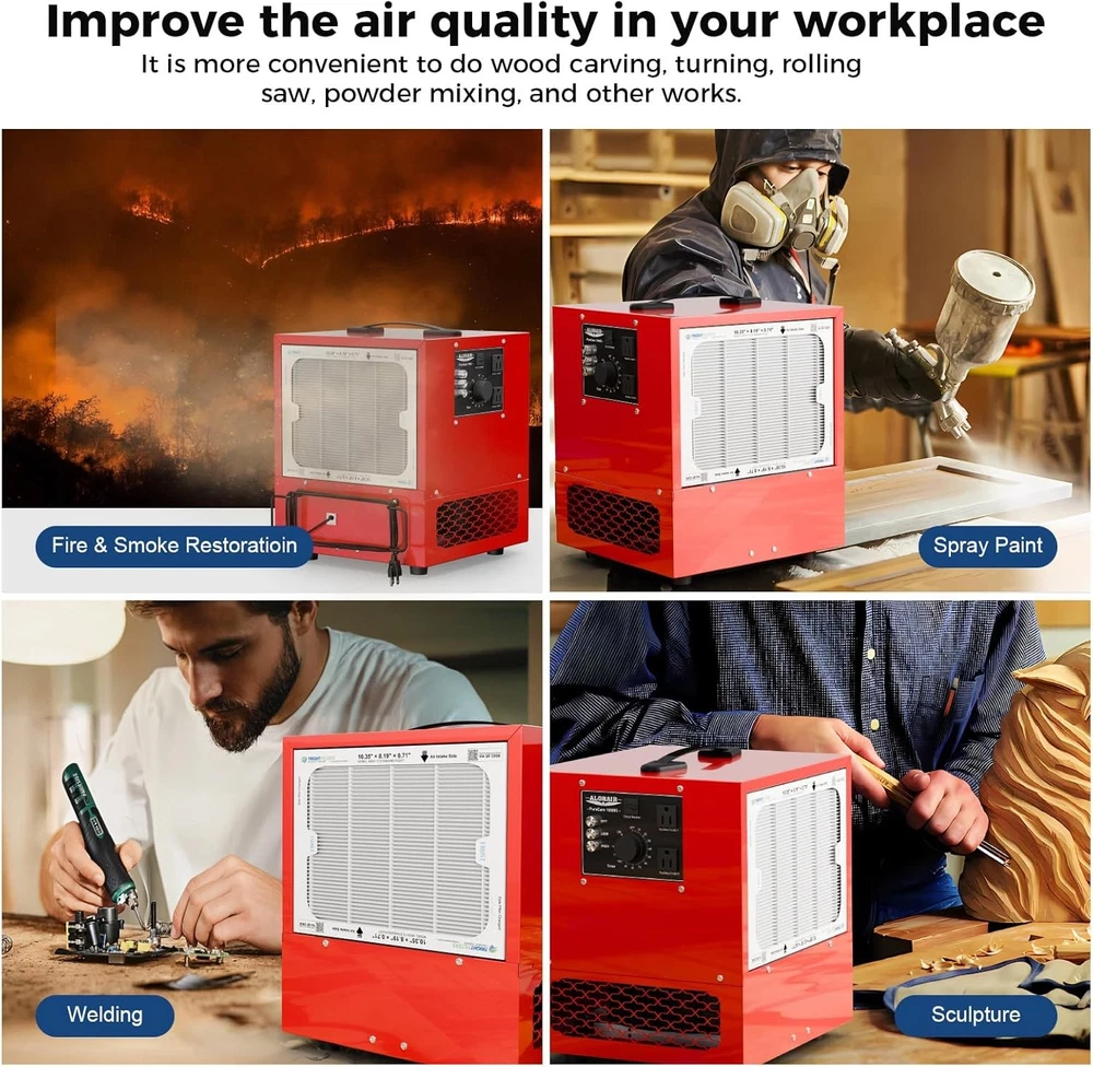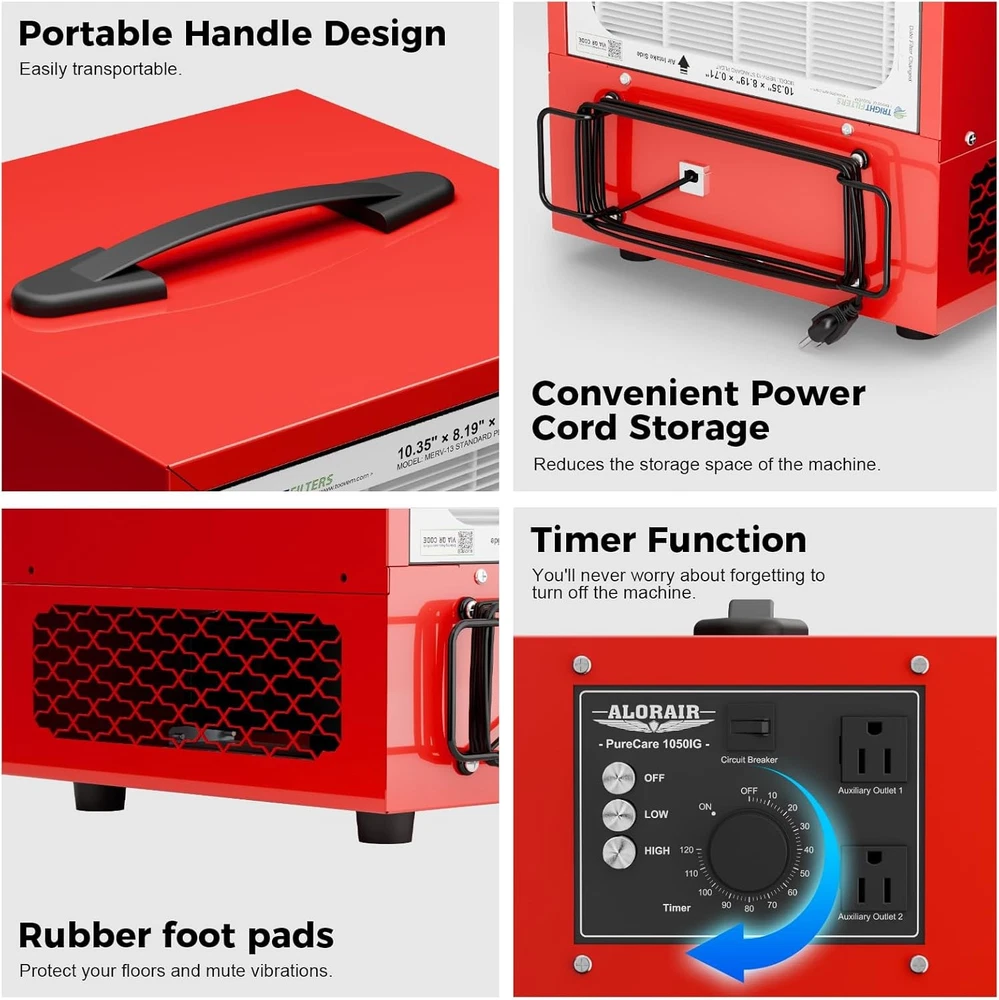 ALORAIR Portable Air Filtration System, 180° Air Intake (850/1050CFM) Tabletop Dust Collector for Woodworking with Strong Vortex Fan, Air Filter for Garage, Works Shop, Home, Purecare 1050 Get 4PCS additional filters. There is no need to add it to the shopping cart. Click Blue Underlined fonts to Shop Filters. Alorair MERV-13 Filter for Purecare 1050/1050IG Air Filtration Systems- 3pack Alorair MERV-13 Filter for Purecare 1050/1050IG Air Filtration Systems- 4pack Product details Product Dimensions : 11.81 x 11.81 x 13.78 inches; 17.4 Pounds Item model number : Purecare 1050 Date First Available : August 28, 2024 Manufacturer : ALORAIR About this item Kindly Note: It does not meet California's regular requirements and it can not be shipped to California. Please do not place the order if you're in California. Portable & Compact Design: PureCare 1050 featured a handle on the top of the machine, smaller size(11.81*13.78*11.81 in) and light weight(17.4 Lbs) design makes it more compact, with the handle you can easily grab it to move around, smaller size allows you to put it anywhere you want, extremely saving your space. Powerful Air Intake: The built-in vortex fan offers 2-stage powerful air flow speed(850/1050 CFM), which creates strong air circulation for space up to 1,100 sq.ft, and you can choose the air flow speed base on your needs. Ideal for reducing smoke of wildfire, wood carving workshop, Woodworking, Garage. High Eficiency Filtration Technology: The shop air filtration system is equipped with a fiter with class MEVR 13, which canstop 90% of 3-10um particles without impacting air flow. ldeal for wood carving, sanding, tumning, scroll saw work, rotary tools, powder mixing, etc. it quarantees periect results in terms of reducing indoor air polution. The filter can be easily replaced. Quiet & Easy to Use: PureCare 1050 air filtration system is at a low noise level when funtioning which is under 58 dBA, working quietly and properly. Rotating the knob to adjust the timer, you can set fan to shut down automatically in 1-2 hours, there is no wireless interference, and the anti-interference ability is strong. Anti-Slide & Extra Socket: 4 rubber stands at the buttom of the machine offers anti-slide ability, ensures it alway stay at where it should be and keeps it stable, and also avoid the vibrations when it's working. 2 Extra sockets were design on the control panel to let you connet with other electric tools to let them work at same time, save your time and money. 1-Year Limited Warranty: Safety tested our PureCare 1050 air filtration is fully compliant with the electrical safety ETL. Every PureCare 1050 comes with a 1-year limited warranty Product description Powerful but low noise when functioning, with the MERV-13 rating filter, it's able to filter dust, small particles and odor, smoke caused by wildfires. Prepare for Air Pollution PureCare 1050 featured a powerful vortex fan offers 2 level of 850/1050 CFM air flow speed, creates strong air circulation, and help a lot on filtering smoke, dust, pollen, odor, small particles Create Strong Air Circulation Built-in power vortex fan which offers up to 1050 CFM air flow and it's able to clean dusts for up to 1,100 Sq.Ft space. Weighs only 17.4 pounds, and we design a handle on the top, compact and light weight, makes it's convenient to transfer and store anywhere. PureCare 1050 air filtration system featured a simple control panel for you to manipulate it easily, you can switch air speed and set timer without any problem. Each PureCare 1050/1050IG featured 2 extra sockets, PureCare 780S featured 1, to provide convenience for your daily use.