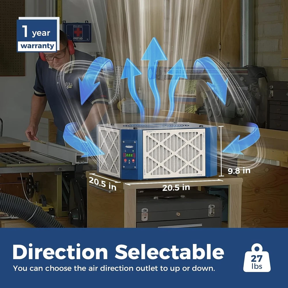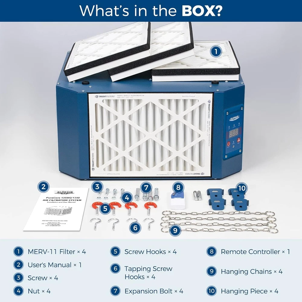 ALORAIR 360 Degree Intake Air Filtration System Woodworking - (1050/1350 CFM) with Strong Vortex Fan, Hanging Mode for Garage Works Shop, Shop Dust Collectors, Purecare 1350 Click Blue Underlined fonts to Shop 4Pack Filter. Alorair 4-pack MERV-11 Air Filter for Purecare 1350/1350IG Air Filtration System Product information Technical Details Manufacturer ALORAIR Part Number Purecare 1350 Item Weight 27 pounds Product Dimensions 20.5 x 20.5 x 9.8 inches Style Purecare 1350 Material iron Voltage 115 Volts Sound Level 69 Decibels Batteries Included? No Batteries Required? No About this item IMPORTANT: It does not meet California's regular requirements and it can not be shipped to California. Please do not take the order if you're in California. Accessibility: Timer cycle controller, you can set the fan to shut down automatically in 1-9 hours. √ IR remote system, there is no wireless interference, and the anti-interference ability is strong. √ With hooks and chains, the air filtration system is easy to move and can be hung from the ceiling in the shop or placed on a workbench. 360 degree air Intake Air Filtration System: The Shop Dust Collector has a 360 degree air intake design, powerful enough to cover a large area with high circulating airflow, sawdust from woodworking, grinding, sawing, etc. Improving your workplace’s air quality. Dimensions: 20.5"Lx 20.5" Wx 9.8"H; electrical Reguirements: 115v,60 Hz, 1.5 A ; cover rooms up to-1700 sq.ft; noise rating: 60 to 69 dB High Eficiency Filtration Technology: The shop air filtration system is equipped with a fiter with class MEVR 11, which canstop 90% of 3-10um particles and 85% of 1um particles. ldeal for wood carving, sanding, tumning, scroll saw work, rotary tools, powder mixing, etc. it quarantees periect results in terms of reducing indoor alr polution. The filter can be easily replaced. Strong Vortex fan: This air filtration system for woodworking is equipped with a strong vortex fan, which generates a strong air flow while it's working, and maintains a high static pressure state even if the filter covers a large amount of wood chips. It has two-stage speed selection. Suite for wood carving workshop, woodworking, garage. Product description Wildfire Dust & Smoke Contorl PureCare 1350 featured powerful vortex fan, which creates strong air circulation, with the MERV-11 grade filters, it will reduce the dust and smoke and improve your air quality when wildfire comes. 2 Speed Options(1050CFM/1350CFM) 2 optional speeds allow you to select the efficiency of your air filtration system based on your needs. 360° air intake is designed to cover your work area in all directions, cover up to 1,700 sq.ft. 2-Speed Air Filtration System with Remote Control Features 360 degree air intake design that circulates air in a 400 square foot space up to 13 times per hour. Use Vortex fan to create more powerful wind, offer 2 optional airflow speeds of 1050CFM/1350CFM for your adjustment. Purecare 1350 dust collector includes an infrared remote control, in addition to manual control, also supports remote control within a certain distance. High-density MERV-11 is easy to disassemble and install, assisting unit to achieve more thorough cleaning. 1-9 hour programmable timer allows you to set the time you desire, the unit automatically shuts off when the set value is reached. Purecare 1350 air filtration system has a 360 degree air intake design. Compared with traditional units, it can improve the air quality of woodworking workshops more efficiently and quickly, providing you with better air circulation. Hang it from the ceiling of the workshop or place it on a horizontal surface to effectively remove sawdust particles or other allergens from the space up to 1350 cubic feet per minute.