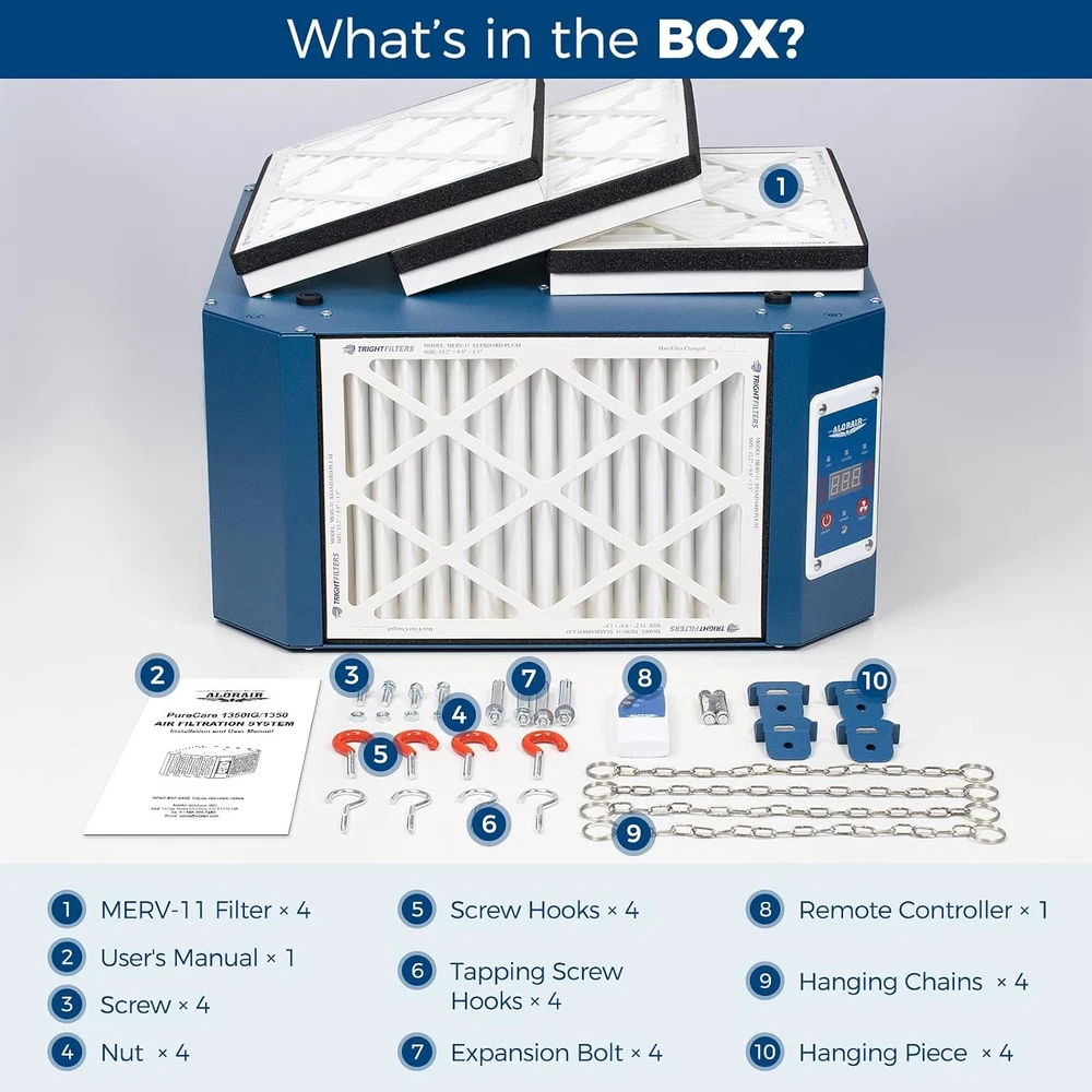 AlorAir 360 degree Intake Air Filtration System - (1350 CFM) with Strong Vortex Fan, Built-in Ionizer, Shop Dust Collector for Woodworking Shop, Garage Works Shop, Purecare 1350IG Click Blue Underlined fonts to Shop 4Pack Filter. Alorair 4-pack MERV-11 Air Filter for Purecare 1350/1350IG Air Filtration System Product information Technical Details Manufacturer ALORAIR Part Number Purecare 1350IG Item Weight 27 pounds Product Dimensions 20.5 x 20.5 x 9.8 inches Style 1350 IG Material iron Voltage 115 Volts Batteries Included? No Batteries Required? No About this item Kindly Note: The AIR Filtration System does not meet California's regular requirements, it can not be shipped to California, Accessibility: Timer cycle controller, you can set fan to shut down automatically in 1-9 hours. √ IR remote system: There is no wireless interference, and the anti-interference ability is strong. √ With a hook and chain: Puricare 1350IG air filtration system is easy to move and can be hung from the ceiling in the shop or placed on a workbench. Built-In Ionizer: ALORAIR air filtration system built-in ionizer, the air passed through is subjected to electric discharge. Pollutantsand odor particles in the drawn-in air are subjected to oxidative degradation and can achieve the effect of dust removal,elimination of odors, and improvement of air quality to promote your health. 360 degree air Intake Air Filtration System: The Shop Dust Collector has a 360 degree air intake design, powerful enough to cover a large area with high circulating airflow, sawdust from woodworking, grinding, sawing, etc. Improving your workplace’s air quality. Dimensions: 20.5"Lx 20.5" Wx 9.8"H; electrical Reguirements: 115v,60 Hz, 1.5 A ; cover rooms up to-1700 sq.ft; noise rating: 60 to 69 dB Strong Vortex fan: The Air Filtration System for woodworking is equipped with a strong vortex fan, which generates a strong airflow when working, and maintains a high static pressure state even if the filter covers a large amount of wood chips. It has two-stage speed selection. Suitable for wood carving workshop, Woodworking, Garage. High Eficiency Filtration Technology: The shop air filtration system is equipped with a fiter with class MEVR 11, which canstop 90% of 3-10um particles and 85% of 1um particles. ldeal for wood carving, sanding, tumning, scroll saw work, rotary tools, powder mixing, etc. it quarantees periect results in terms of reducing indoor alr polution. The filter can be easily replaced. Product description PureCare 1350IG Dust Collector with Built-In Ionizer Wildfire Dust & Smoke Control PureCare 1350IG featured ionizer can reduce the dust and smoke, built in strong vortex fan with 2 stage air flow speed creates strong air circualtion, improves your air quality when wildfire comes. 2-Speed Air Filtration System with Remote Control Features 360 degree air intake design that circulates air in a 400 square foot space up to 13 times per hour. Use Vortex fan to create more powerful wind, offer 2 optional airflow speeds of 1050CFM/1350CFM for your adjustment. Purecare 1350 dust collector includes an infrared remote control, in addition to manual control, also supports remote control within a certain distance. High-density MERV-11 is easy to disassemble and install, assisting unit to achieve more thorough cleaning. 1-9 hour programmable timer allows you to set the time you desire, the unit automatically shuts off when the set value is reached. Purecare 1350 air filtration system has a 360 degree air intake design. Compared with traditional units, it can improve the air quality of woodworking workshops more efficiently and quickly, providing you with better air circulation. Hang it from the ceiling of the workshop or place it on a horizontal surface to effectively remove sawdust particles or other allergens from the space up to 1350 cubic feet per minute. 1050CFM/1350CFM 2 Speed Options Two optional speeds (1050CFM/1350CFM) allow you the freedom to choose the efficiency of your air filtration system based on your actual needs. 360 degree air intake is designed to cover your work area in all directions, up to 1,700 square feet.