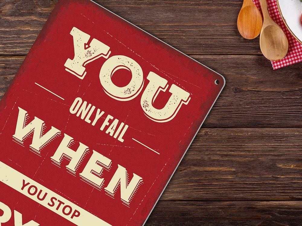 Inspirational Quote: You Only Fail When You Stop Trying. Great Size: 8 x 12 inches (20 x 30 cm), About the same size as a piece of A4 paper, also suitable for little area. Material: Made of 0.036" aluminium, never rust and avoid bending and can be displayed for a long time whether indoors or outdoors. Printing: Unique UV printing technology,True Rich Color quality for unmatched vibrancy, color reproduction and extremely detailed image quality. This is Aluminum material poster, some paintings appear to have the effect of rust, it is printed up, not really rusty, fit for decorations of mancave, living room, bedroom... Personalized Personalized gift for your friends and family to decorate Office. They will absolutely love it. They will smile ear to ear! Made of Industrial Grade Aluminium, Stronger and more durable than vintage tin signs / tinplate. Make a nice Man Cave wall pediments. It added a nice touch of fun and whimsy. 4 pre-drilled holes for style and easy hanging on the wall. The sign is made of sturdy aluminum, each side is bent nicely to avoid any sharp edges. They were smooth. A nicely home decorated Gifts! And it is a great alternative to filling a blank space within the Dinning Room, Restaurant, Bar or anywhere else.