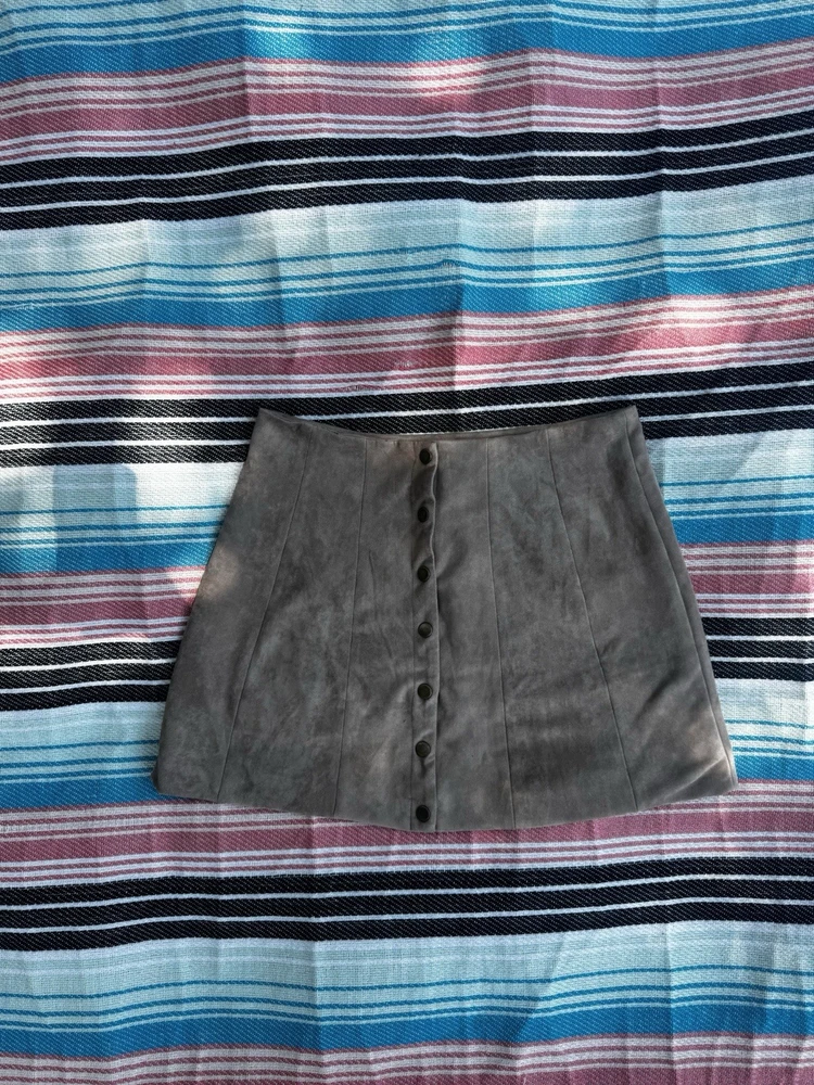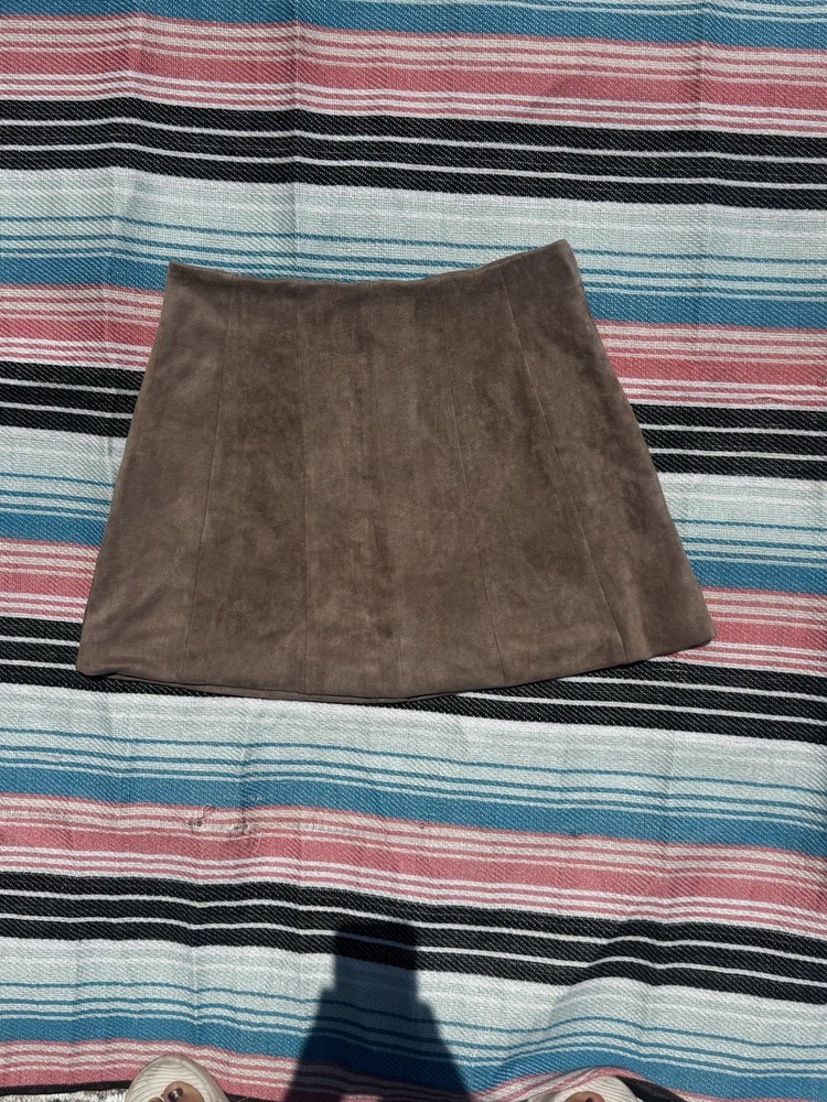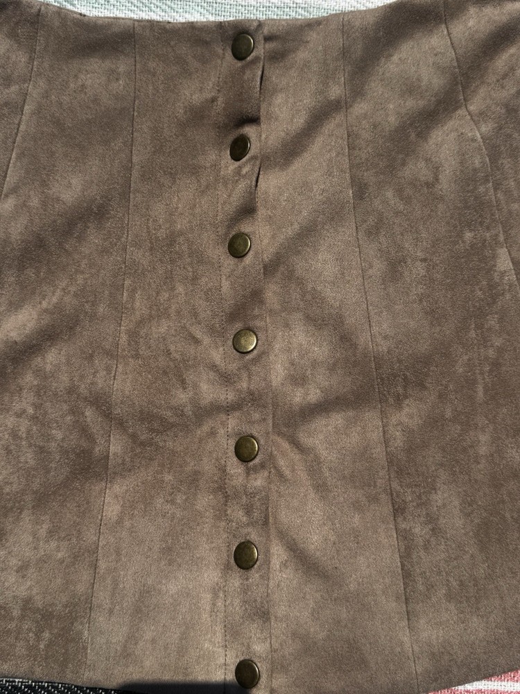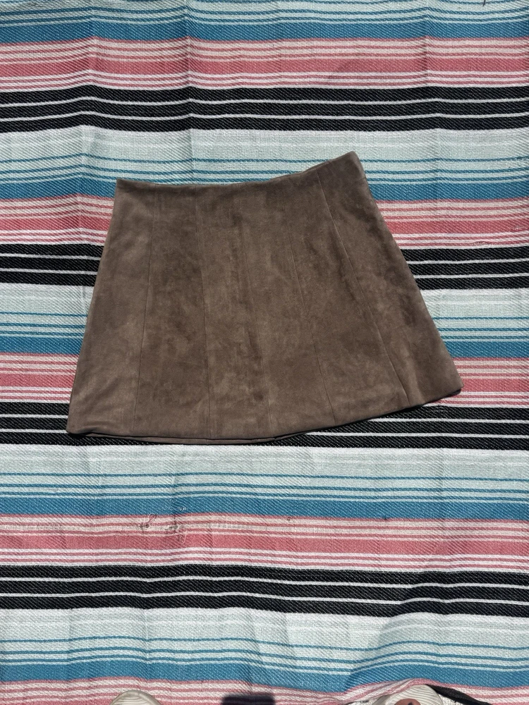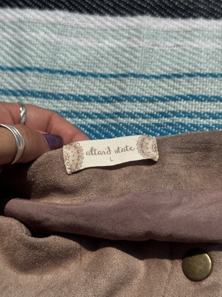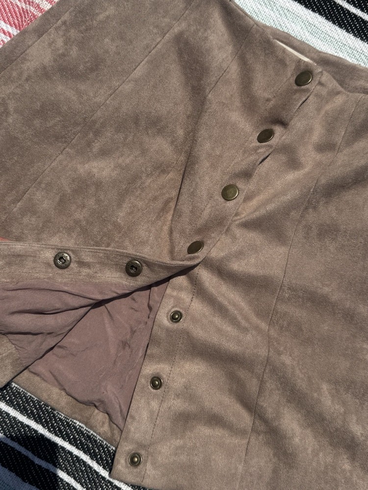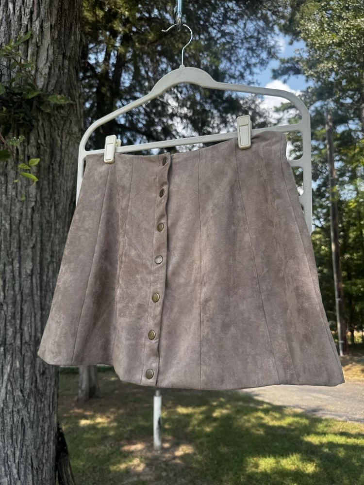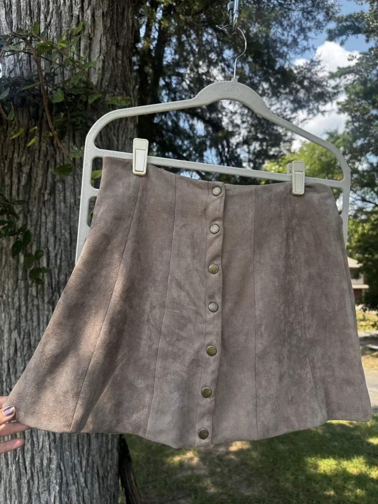 The Altar'd State Mini Skirt in size Large is a stylish and versatile piece perfect for the fall season. Made of faux suede with a solid taupe color, this skirt features a unique snap closure and is lined for added comfort. The Western cowgirl character and boho theme make it ideal for casual outings, travel, or even a party or cocktail event. This short and mini skirt is a great addition to any wardrobe, especially for those who love the Southwestern style. Hand wash only to maintain its quality, this skirt embodies a trendy and effortless look for the fashion-forward woman.