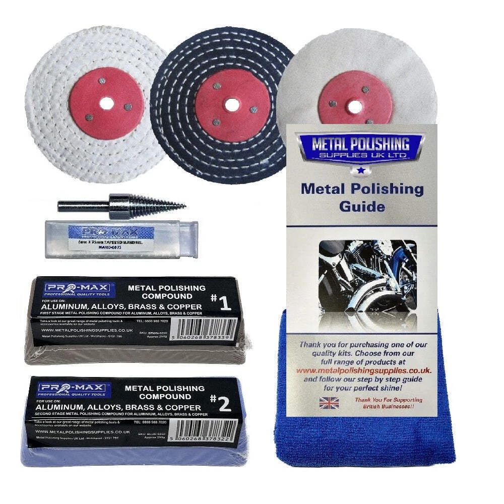 Aluminium Alloy Brass Metal Polishing Kit Drill 7pc - 3" x 1/2" Pro-Max From the best-selling range of Pro-Max aluminium metal polishing kits, this compact kit is perfect for polishing aluminium, alloys, brass, and other soft metals to a stunning mirror finish. Designed to fit onto a standard electric drill, this kit is easy to use and comes with a full set of metal polishing instructions, ensuring you have everything you need to achieve professional results, whether you're working at home or in the workshop. This Quality Polishing Kit Contains: 1 x 3" x 1/2" Pro-Max Sisal Metal Polishing Buffing Wheel. 1 x 3" x 1/2" Pro-Max Colour Stitch Metal Polishing Buffing Wheel. 1 x 3" x 1/2" Pro-Max 'G' Loose Fold Metal Polishing Buffing Wheel. 1 x 100g Bar Pro-Max Brown Metal Polishing Compound. 1 x 100g Bar Pro-Max Blue Metal Polishing Compound. 1 x 6mm Pro-Max Standard Tapered Mandrel. 1 x 250gsm Pro-Max Micro Fibre Cloth. Aluminium Alloy Brass Metal Polishing Kit Drill 7pc - 3" x 1/2" Pro-Max From the best-selling range of Pro-Max aluminium metal polishing kits, this compact kit is perfect for polishing aluminium, alloys, brass, and other soft metals to a stunning mirror finish. Designed to fit onto a standard electric drill, this kit is easy to use and comes with a full set of metal polishing instructions, ensuring you have everything you need to achieve professional results, whether you're working at home or in the workshop. This Quality Polishing Kit Contains: 1 x 3" x 1/2" Pro-Max Sisal Metal Polishing Buffing Wheel. 1 x 3" x 1/2" Pro-Max Colour Stitch Metal Polishing Buffing Wheel. 1 x 3" x 1/2" Pro-Max 'G' Loose Fold Metal Polishing Buffing Wheel. 1 x 100g Bar Pro-Max Brown Metal Polishing Compound. 1 x 100g Bar Pro-Max Blue Metal Polishing Compound. 1 x 6mm Pro-Max Standard Tapered Mandrel. 1 x 250gsm Pro-Max Micro Fibre Cloth. × × × × × × × × Buy now and save! Shipping info Click the Shipping & Payments tab above the listing description for more info Click the Shipping & Payments tab above the listing description for more info! Additional delivery notes PICK UP OPTION Sorry, our items are NOT available for pick-up. PAYMENT Immediate payment is required upon selecting "Buy It Now" or upon checking out through the cart. We accept payment via All Major Credit Cards (Visa, Mastercard, AMEX, Discover), Google Pay, PayPal, & Apple Pay (on mobile & eBay App). Thank you for shopping with us on eBay! Additional Information No additional information at this time Ask seller a question You might also like Bench Grinder Metal Polishing Kit For Aluminium Alloy Brass 8pc 6" x 1/2" - Pro- Bench Grinder Metal Polishing Kit For Aluminium Alloy Brass 8pc 6" x 1" - Pro-Ma Aluminium Alloy Brass Metal Polishing Kit Fits Drill 14pc - 4" x 1" Pro-Max Bench Grinder Metal Polishing Kit Aluminium Alloy Brass Steel 11pc 6" x 1" Contact To contact our Customer Service Team, simply click the button here and our Customer Service team will be happy to assist. Ask seller a question © Metal Polishing Supplies UK Ltd Shipping & Payments Click the Shipping & Payments tab above the listing description for more info Payment Accepted Payment Methods Immediate payment is required upon selecting "Buy It Now" or upon checking out through the cart. We accept payment via All Major Credit Cards (Visa, Mastercard, AMEX, Discover), Google Pay, PayPal, & Apple Pay (on mobile & eBay App). Thank you for shopping with us on eBay! Returns Returns are accepted Items must be returned within 30 days of the auction ending Buyer will pay for return shipping. eBay integration by