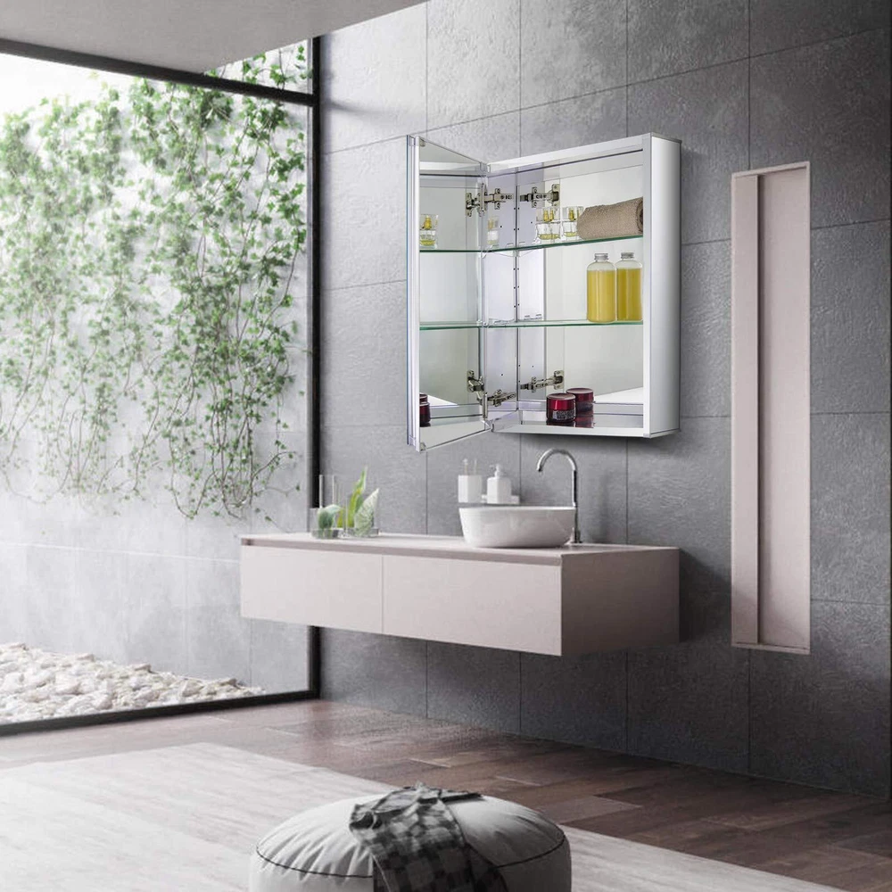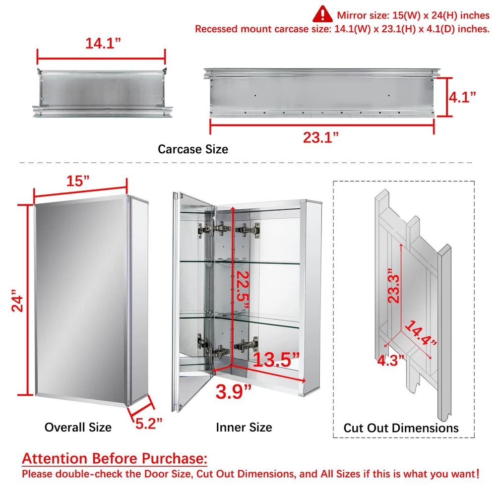 This frameless medicine cabinet inside and outside are mirror surface. Two adjustable tempered glass shelves, rugged, with transparent four fixed brackets integrated with tempered glass shelves, enough to accommodate and withstand your toiletries Adjustable 100-degree Soft closed hinges, allowing you to easily open the door without interference Grinding silver mirror design, pampering your hands and enjoying a wider view Simple mounting kit that can be easily mounted on the wall and very secure 【Multi Mirrors】medicine cabinet with Beveled edge mirror in front of the door; Mirrors on back of door and interior back of cabinet, Include side mirror kit for surface mounting. 【Durable material】Anodized aluminum profile, shining finish, strong rust-resistant capacity, lead to a stable and long lifetime, so it’s easy to clean this bathroom cabinet. 【Adjustable shelves】2 adjustable tempered glass shelves and has 9 adjustable heights to make sure you can place more daily necessities. 【Hinge】The mirror cabinet has two soft-closing hinges, which will slow down the closing speed of the door to avoid hitting the cabinet when you close the door and it is quiet. 【Installation】This medicine cabinet can be recessed or surface mounted, and it can also be mounted reversible (upside down). Please follow the instructions to install the cabinet step by step. Any confusion about assembling this medicine cabinet, please communicate with us~ All feedback will be replied within 12 hours.