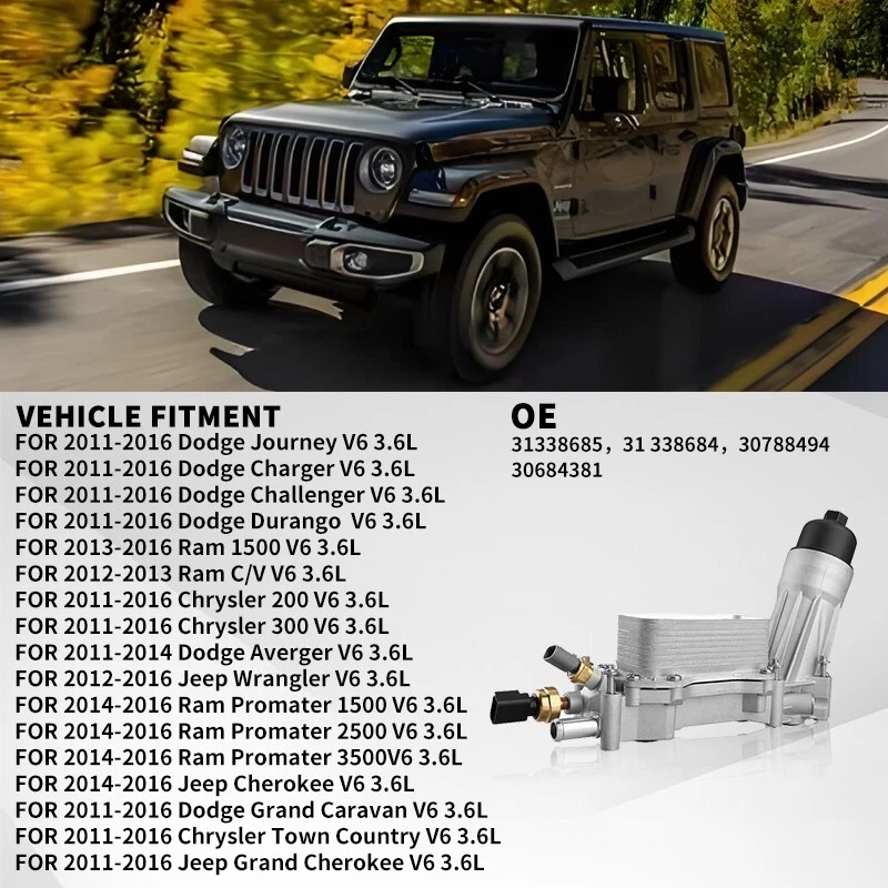 Product Information The aluminum oil filter is made of high quality aluminum material . This upgrade solves the defects of fracture and oil leakage caused by the plastic casing used in the original product of the older generation and ensures the improvement of product reliability. It can be used as a perfect replacement for filter components in specific years, models and makes of vehicles, correcting the plastic oil filter housing from leaking fluids and other failures. Charge Durango Journey Wrangler Oil Cooler with the high-load work of the engine,dust,particles and water will be continuously mixed into the lubricant;At this time,our engine oil cooler can filter out these mechanical impurities for you,keep the lubricating oil clean,prolonging its lifespan Vehicle Fitment FOR 2011-2016 Dodge Journey V6 3.6L , FOR 2011-2016 Dodge Charger V6 3.6L , FOR 2011-2016 Dodge Challenger V6 3.6L , FOR 2011-2016 Dodge Durango V6 3.6L , FOR 2011-2016 Dodge Grand Caravan V6 3.6L , FOR 2011-2016 Chrysler 200 V6 3.6L , FOR 2011-2016 Chrysler 300 V6 3.6L , FOR 2011-2016 Chrysler Town Country V6 3.6L , FOR 2011-2016 Jeep Grand Cherokee V6 3.6L , FOR 2011-2014 Dodge Averger V6 3.6L , FOR 2013-2016 Ram 1500 V6 3.6L , FOR 2012-2013 Ram C/V V6 3.6L , FOR 2012-2016 Jeep Wrangler V6 3.6L , FOR 2014-2016 Ram Promater 1500 V6 3.6L , FOR 2014-2016 Ram Promater 2500 V6 3.6L , FOR 2014-2016 Ram Promater 3500V6 3.6L , FOR 2014-2016 Jeep Cherokee V6 3.6L . Part Number 5184294AE, 5184304AE, 5184304AF, 5184294AD, 5184294AC, 68105583AG, 68105583AF, 68105583AE, 68105583AD,68105583AC, 68105583AB, 68105583AA, 68308741AF, 68308741AC, 68308741AB,68308741AA, 68310865AF, 68310865AC, 68310865AB, 68310865AA, 68365925AD, 68365925AC, 68365925AB, 68365925AA, 68365931AD, 68365931AB, 68365931AA Package Includes 1x Oil Filter Housing Adapter Assembly; 6x Upper Intake Manifold Gasket; 6x Lower Intake Manifold Complete Gasket Shipping Please check your shipping address carefully before checkout, it can't be changed if order completed. We are not responsible for any wrong or undeliverable addresses. Delivery time will take about 2-10 working days to you,you can track it on line. We refund or reship for non-received items that is over our estimate shipping time for free. Returns 1. We committed to provide good quality products to our customers. All items will be checked before packing. All items are new and of high quality. All items have one Year replacement warranty. 2. If you don't like an item within 30 days you get (non-quality problem). We could exchange or refund the item under the premise of unused, in its original, never mounted and could sell out next time, customer should return the item and responsible for all charges. 3. If return for refund, we will refund the customer at the item's price ( excluding the shipping costs to and fro ) after getting the returned item. We refund or exchange for defective items which caused by us for free. But if broken off by incorrect operation, customer should bear all the shipping charges. Other If you encounter any problems about anything, please feel free to contact us and we will do our best to assist you solve the issue. If you are not satisfied in anyway, please feel free to let us know and give us a second chance to correct it before you decide to leave any neutral or negative feedback. Please believe that any problems all could be solved through the positive communication . We do not let our customer suffer any loss . Please contact us through eBay link if you have any questions. We will reply you within 24- 48 hours. We are glad to serve for you! Thank you so much!