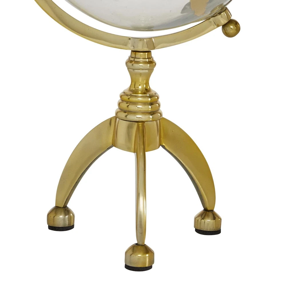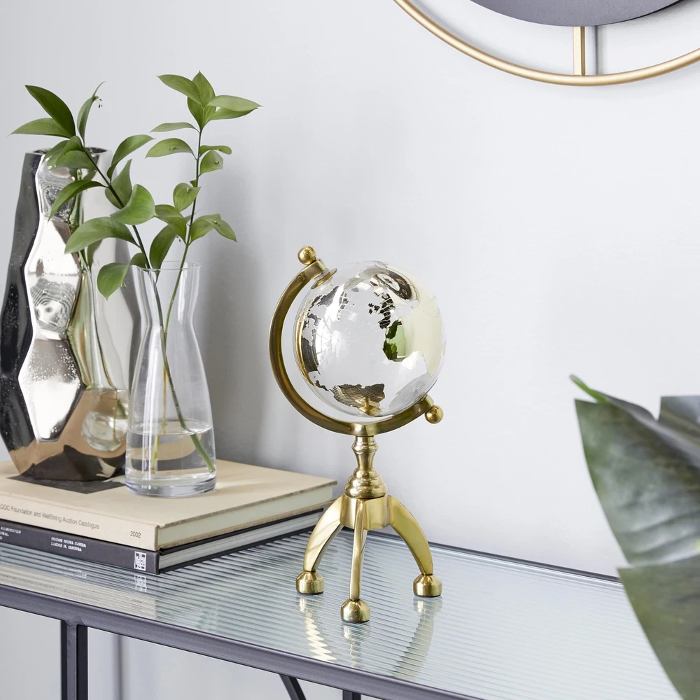 Glam decorative globe for living room is crafted from molded tempered glass, mounted on a welded aluminum axle and tripod stand, allowing it to rotate like the Earth. Polished gold globe on a stand showcases a round shape with land masses, round finials, and a tripod base with round feet for added charm. Wipe clean with a dry cloth. Place this globe on any counter or table to show your love for traveling. Embark on an exciting adventure with this world globe decor. Experience the world in your grasp, place this globe on any accent table to show your love for traveling. Designed with felt or rubber stoppers at the base that prevent scratching furniture and table tops, as well as sliding around. This item ships in 1 carton. Aluminum globe makes a great gift for any occasion. Table top globe measures 5in diameter. Suitable for indoor use only. This item ships fully assembled in piece. Made in India. This is a single gold colored decorative world globe. Glam style. GLAM WORLD GLOBE: Indulge in the glamorous luxury of plush textures, dazzling details, and sleek finishes to elevate your home and add a sophisticated flair ALUMINUM METAL GLOBE DÉCOR: Decorative globe with stand is crafted of solid and glossy aluminum and glass materials GOLD AND CLEAR GLOBE ON A STAND: Polished metallic gold finish and gold continents over transparent smooth glass orb ROUND DECORATIVE GLOBE FOR LIVING ROOM: Glam style gold accent piece features a glass orb with aluminum axis and tripod base SMALL SIZE DECORATIVE GLOBE FOR OFFICE: The gold aluminum metal globe measures 4.95L x 5.3W x 12.5H inches, and weighs 1.34 lbs