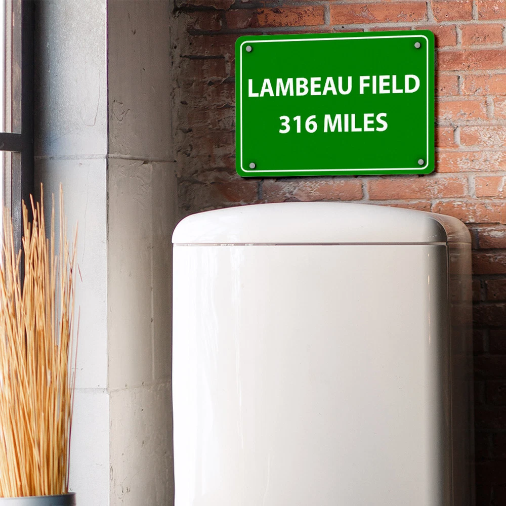 Signs Outdoor/Indoor Metal Personalized sign Protect yourself and avoid accidents with our metal warning sign. Communicate instructions and safety warnings efficiently to others. The text reads: lambeau field 316 miles. Perfect for businesses looking for: With Border metal signs, cut signs, signs, wall signs, or yard signs. Make sure your message or instruction catches the attention and is being seen as well as respected. Also available in different shapes and sizes, you will always find the perfect fit for you! Our designs are professionally printed with state-of-the-art equipment guaranteed to last for years. We have more than 12 years of experience in the printing industry to offer you stunning detail and rich lifelike colors. All prints are carefully made in our lab in Tampa, Florida. BEST METAL SIGN ON THE MARKET! **PREMIUM QUALITY: Our industrial metal signs are made of durable .040IN high quality aluminum that will last for decades. Very clear, bold, easy to read lettering that can be read from the distance. **INDOOR & OUTDOOR: Our aluminum yard metal signs can be used indoor as well as outdoor. They can be easily mounted on any surfaces such as walls, doors or fences with zip ties, screws or nails (NOT INCLUDED). **EASY INSTALLATION: Our indoor and outdoor signs come with pre-drilled holes for an easy installation on any surfaces. We left you the easy part... You just have to make sure it is straight! **WEATHERPROOF: Our personalized signs are especially treated against UV, humidity and water thanks to our ink curation. As a result, they will not rust or fade which make them perfect to use indoor and outdoor. **UNIQUE DESIGNS AND GRAPHICS: We put a lot of thought and time in our design process. We are proud to offer you the best selection of informative signs graphic designs, as well as the best variety of traffic and road signs designs. Whether you are a business owner or a homeowner, you will be 100% satisfied with our metal signs. PAYMENT TERMS