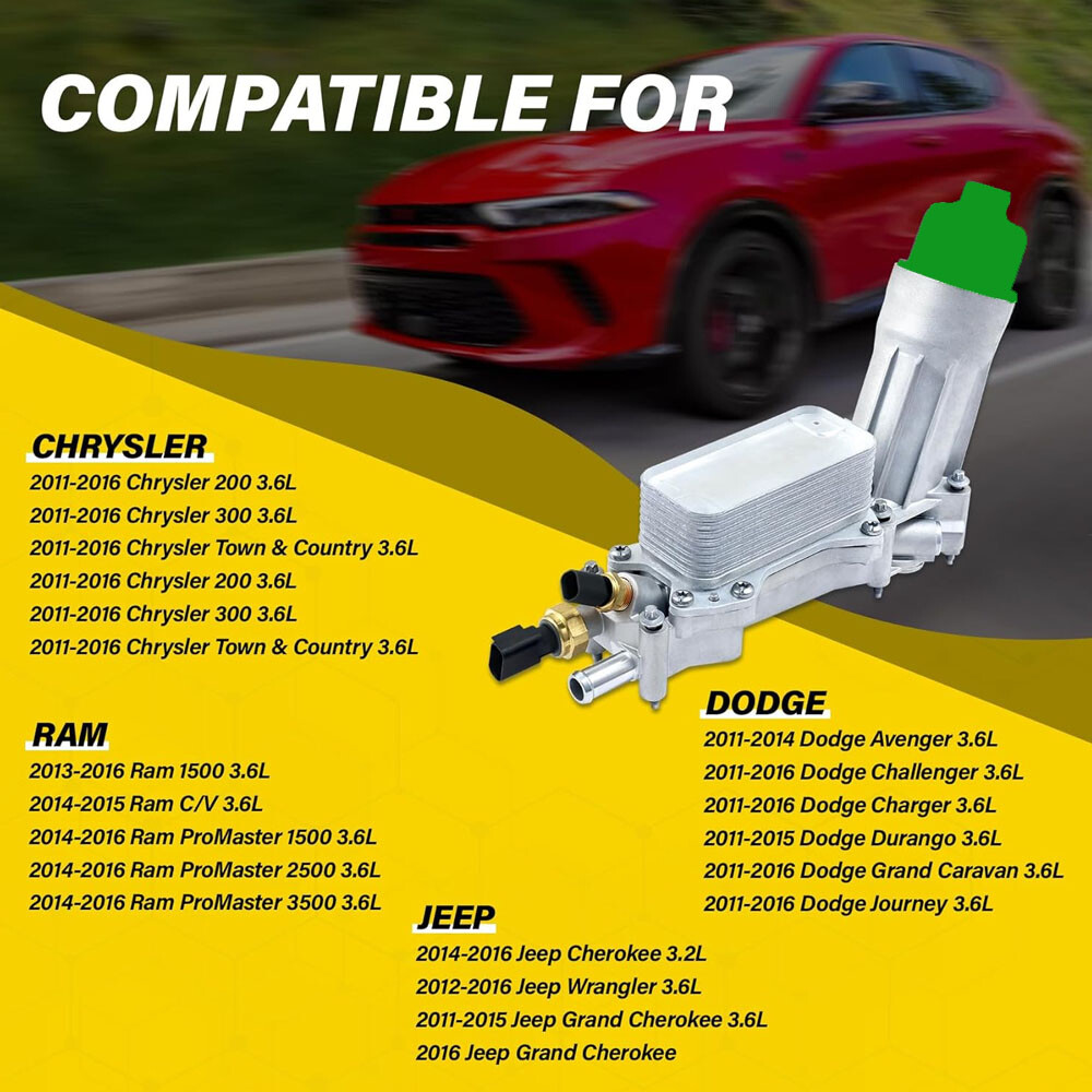 Product Description: Oil filter Housing in Upgrade Housing NOTE:Stop installing the plastic Oil filter adapter, you need to install new one immediately. OEM Part Number 926-959, 926-876, 5149062AA, 5149062AB, 5149077AB, 5149096AB, 5184294AC, 5184294AD, 5184294AE, 5184304AE, 5184304AF, 56044777AA, 68060337AA, 68105583AA, 68105583AB, 68105583AC, 68105583AD, 68105583AE, 68105583AF, 68105583AG, 68308741AA, 68308741AB, 68308741AC, 68308741AF, 68310865AA, 68310865AB, 68310865AC, 68310865AF, 68365925AA, 68365925AB, 68365925AC, 68365925AD, 68365931AA, 68365931AB, 68365931AD, 68596317AA. Fitment: Fit for V6 3.6L Pentastar Engine Fit for 2011-2016 Chrysler 200 Fit for 2011-2016 Chrysler 300 Fit for 2011-2016 Chrysler Town Country Fit for 2011-2014 Dodge Averger Fit for 2011-2016 Dodge Challenger Fit for 2011-2016 Dodge Charger Fit for 2011-2016 Dodge Durango Fit for 2011-2016 Dodge Grand Caravan Fit for 2011-2016 Dodge Journey Fit for 2011-2016 Jeep Grand Cherokee Fit for 2012-2016 Jeep Wrangler Fit for 2014-2016 Jeep Cherokee (3.2L) Fit for 2012-2013 Ram C/V Fit for 2013-2016 Ram 1500 Fit for 2014-2016 Ram Promater 1500 Fit for 2014-2016 Ram Promater 2500 Fit for 2014-2016 Ram Promater 3500 Read in detail below before you order it from us ✅ This is a full assembly oil filter assembly included; Upgrade Housing, Plastic Oil cap, oil filter, temperature switch, oil pressure sensor, oil cooler, 5 pcs bolts, manifold seals ✅ We tested the product 100% for leaking before shipping out ✅ Inspect all seals and O-ring carefully before installation. ✅ Clear any residues in the engine valley after the old oil filter adapter removed ✅Make sure the Housing seated fully in the engine valley, gap checking is necessary ✅ Insert the cooling pipe fully on the tube and put the clamp correctly. Sales Term: * Replacement for any shipping defects. * Our Warranty covers 1 years. * No reimbursements will be given for delay, labor, mileage, or any other cost involved in installation or re-installation of the auto parts in question Packge includues: Upgraded Metal Housing Plastic Oil cap, oil filter, temperature switch, oil pressure sensor, oil cooler, 5 pcs bolts, manifold seals Notes: Customer is responsible for shipping parts back for inspection and replacement. We provide part numbers and high resolution pictures. lease check part numbers and pictures for compatibility.Because this is a functional part, not a cosmetic part, the color of the cover is random, it does not affect the use, hope to understand.