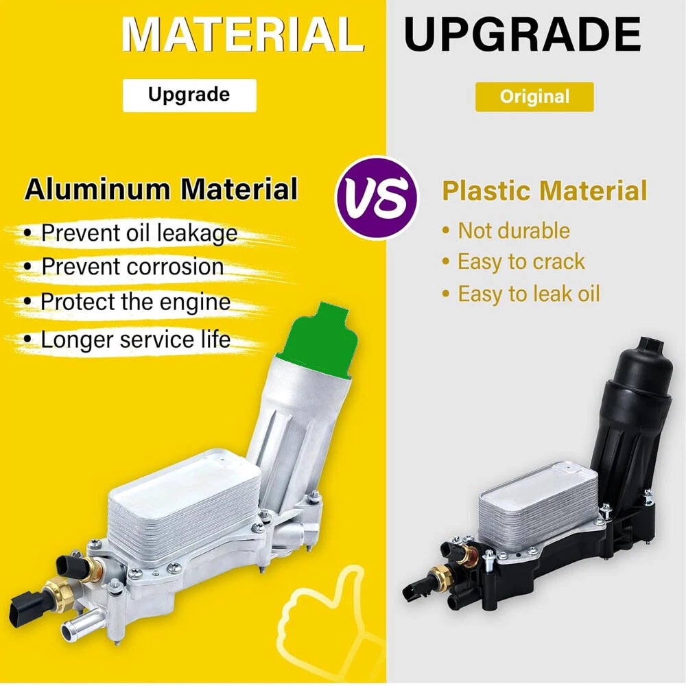 Product Description: Oil filter Housing in Upgrade Housing NOTE:Stop installing the plastic Oil filter adapter, you need to install new one immediately. OEM Part Number 926-959, 926-876, 5149062AA, 5149062AB, 5149077AB, 5149096AB, 5184294AC, 5184294AD, 5184294AE, 5184304AE, 5184304AF, 56044777AA, 68060337AA, 68105583AA, 68105583AB, 68105583AC, 68105583AD, 68105583AE, 68105583AF, 68105583AG, 68308741AA, 68308741AB, 68308741AC, 68308741AF, 68310865AA, 68310865AB, 68310865AC, 68310865AF, 68365925AA, 68365925AB, 68365925AC, 68365925AD, 68365931AA, 68365931AB, 68365931AD, 68596317AA. Fitment: Fit for V6 3.6L Pentastar Engine Fit for 2011-2016 Chrysler 200 Fit for 2011-2016 Chrysler 300 Fit for 2011-2016 Chrysler Town Country Fit for 2011-2014 Dodge Averger Fit for 2011-2016 Dodge Challenger Fit for 2011-2016 Dodge Charger Fit for 2011-2016 Dodge Durango Fit for 2011-2016 Dodge Grand Caravan Fit for 2011-2016 Dodge Journey Fit for 2011-2016 Jeep Grand Cherokee Fit for 2012-2016 Jeep Wrangler Fit for 2014-2016 Jeep Cherokee (3.2L) Fit for 2012-2013 Ram C/V Fit for 2013-2016 Ram 1500 Fit for 2014-2016 Ram Promater 1500 Fit for 2014-2016 Ram Promater 2500 Fit for 2014-2016 Ram Promater 3500 Read in detail below before you order it from us ✅ This is a full assembly oil filter assembly included; Upgrade Housing, Plastic Oil cap, oil filter, temperature switch, oil pressure sensor, oil cooler, 5 pcs bolts, manifold seals ✅ We tested the product 100% for leaking before shipping out ✅ Inspect all seals and O-ring carefully before installation. ✅ Clear any residues in the engine valley after the old oil filter adapter removed ✅Make sure the Housing seated fully in the engine valley, gap checking is necessary ✅ Insert the cooling pipe fully on the tube and put the clamp correctly. Sales Term: * Replacement for any shipping defects. * Our Warranty covers 1 years. * No reimbursements will be given for delay, labor, mileage, or any other cost involved in installation or re-installation of the auto parts in question Packge includues: Upgraded Metal Housing Plastic Oil cap, oil filter, temperature switch, oil pressure sensor, oil cooler, 5 pcs bolts, manifold seals Notes: Customer is responsible for shipping parts back for inspection and replacement. We provide part numbers and high resolution pictures. lease check part numbers and pictures for compatibility.Because this is a functional part, not a cosmetic part, the color of the cover is random, it does not affect the use, hope to understand.