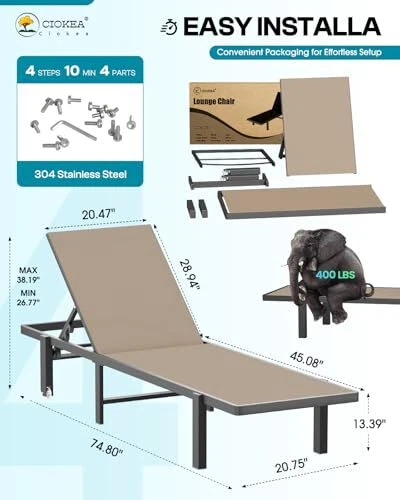 Return Policy Fast Delivery Trusted seller Aluminum Chaise Lounge Chair Outdoor with Wheels, Patio Lounge Chair with Adjustable 5-Position Recliner and Full Flat Tanning Chair for Patio, Beach, Pool, Khaki Product Description Premium Fabric: Our lounge chair is crafted with premium textilene fabric that boasts superior durability. It also provides excellent comfort and support, ing a nice lounging experience Convenient Installation: The chaise lounge chair is constructed with a lightweight, aluminum frame, allowing for easy movement. Installation takes only 10 minutes Enhanced Mobility: With the added convenience of wheels at the base, moving your lounge chair around your patio or garden has never been easier. This upgrade allows effortless repositioning so you can always find just the right spot in the sun or shade Easy Maintenance: The textilene fabric is easy to clean, requiring only a simple wipe-down with a damp cloth. The aluminum frame is low maintenance and doesn't require frequent upkeep and giving you more time to relax and enjoy 5-Position Adjustment: Conforming to ergonomic principles, our outdoor sun lounger features five adjustable reclining positions, ensuring the perfect lounging angle for every user. It can even lay completely flat, making it an ideal choice for tanning All-Season Comfort: The lounge chair allows you to comfortably enjoy your outdoor time in any weather, redefining your outdoor relaxation experience! Shipping Returns Payment Shipping Shipping is FREE to all addresses other than APO/PO boxes in the lower 48 states. All our stock ships from US-based warehouses. Shipped via USPS or UPS (depending on location and package weight) Unless stated otherwise, all orders will ship within 24-72 hours of your payment being processed. Check our feedback to see the great reviews of FAST shipping we offer. Returns Seller does not accept returns Payment We currently accept payment via eBay managed payments only. Once payment is cleared, we will dispatch your shipment within 1-3 business days. Please refer to the "Shipping" tab for more information regarding shipping speed to your destination.