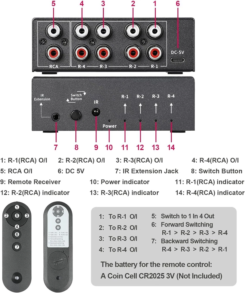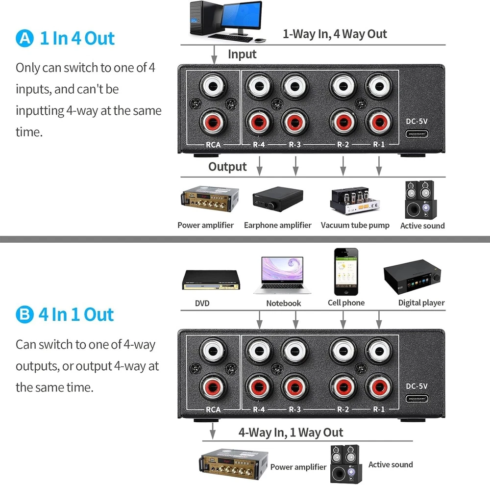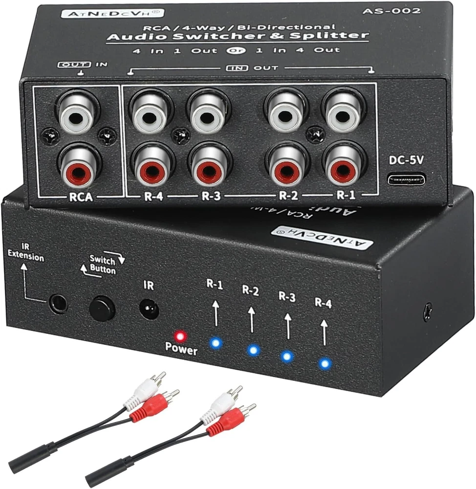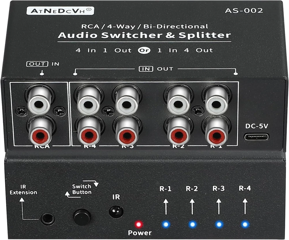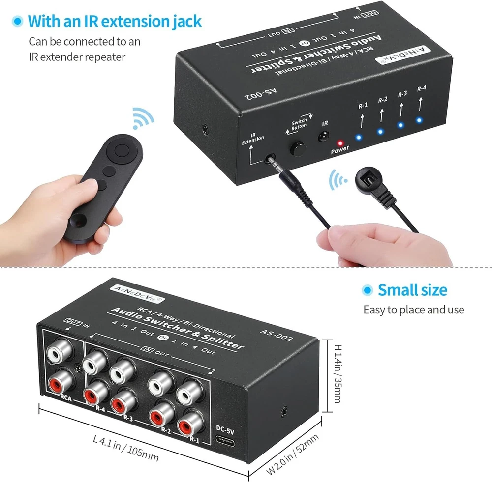 Connector Type: Rca Audio Color: Black Connection Split/Duplication: 1 : 4 (4-Way) Audio/Video Outputs: RCA, Stereo Audio L/R RCA Cable Type: Rca Type: Audio Switcher Connectivity: Type C, IR Expansion, Remote Control gtin13: Does not apply Product Dimensions: 4.1 X 2.4 X 1.5 Inches Brand: Unbranded Compatible Devices: Television, Dvd Player, Personal Computer, Tablet Features: Bi-Directional, Lossless Audio Switching, Noise Reduction Circuit Design, Clear Sound, Noise Free, Crosstalk Free, Remote Controlled, Manual Switching, IR Expansion Jack, Type C Power Input, Plug & Play, Anti-Interference Performance, Excellent Heat Dissipation, Small Size, Easy to Carry Year Manufactured: Audio Switcher Splitter Item Weight: 14.4 Ounces Compatible Product: Audio Switcher, RCA, 3.5mm, Audio Devices, Speakers, Headphones, Amps, Television, DVD Player, PC, Tablet, Phonograph, HiFi Player, Decoder, Amplifier, Desktop Speaker, Sound Bar UPC: Does not apply
