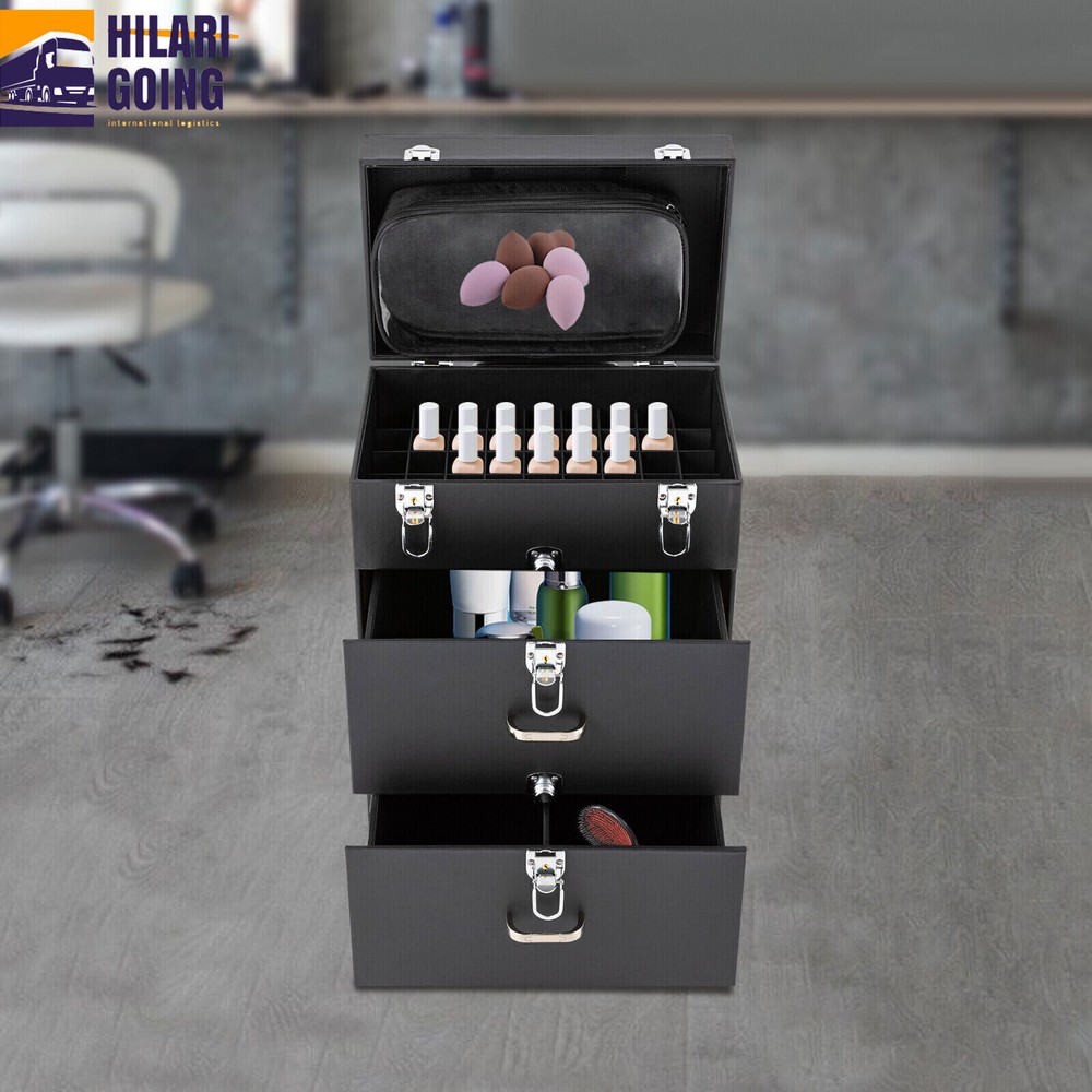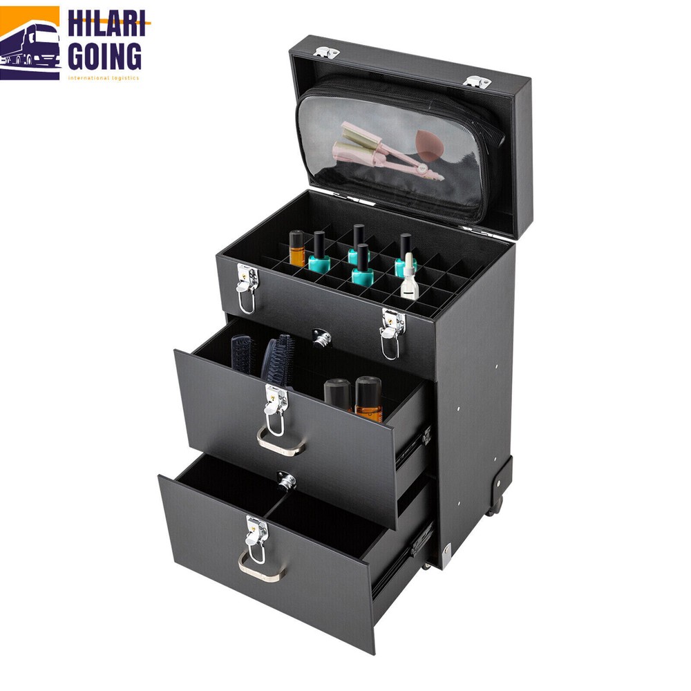 Rolling Makeup Train Case Aluminum Salon Cosmetic Trolley Organizer Box+Drawer Description This is a rolling makeup train case designed for professional beauty artists to make up anytime and anywhere. It is constructed of high-quality PU, wood, PVC , and aluminum alloy that is sturdy and durable. It has extra large capacity compartments and multi-layer drawers. This case is ideal for all people who love beauty or nail art. Key Features High-quality Material: This product is made of high-qualit y PU, wood, PVC, and aluminum alloy, with c orrosion resistance , wear resistance , and not easy to fade. Categorized Storage: Three compartments and a removable grid tray allow you to organize beauty products of different functions and sizes and make it easy to find the tools you want quickly . High Privacy: Four locking cylinders securely protect your valuables inside the box and maximize your privacy. Large Capacity: One 3.54in high tray and two 6.69 high trays can store a variety of cosmetics and beauty appliances, such as perms, nail machines and light therapy supplies, its ample storage space will be able to meet your multiple storage needs. Outstanding Load Capacity: The rectangular structure gives it an excellent load capacity (up to 99 lbs). You can put all your beauty tools in it with confidence. Easy to Move and Carry: The easy-to-move silent universal wheels (two of them can be fixed), three-position telescopic trolley rod, and a top handle make it more convenient to carry on the go, especially suitable for nail technicians and cosmetologists who have a lot of tools and need to be on the go frequently. Stylish Appearance: Its simple structure and black color give people a fashionable and elegant feeling. Such a vintage makeup case can nicely decorate your dressing room and make a good impression when you go out to work. Protective Shipping: To prevent the product from being damaged during transportation as much as possible, this product uses a rigid cardboard box, plastic bag, and foam that can effectively resist normal compression and drops. Details Clear Storage Bag: The clear storage bag on the inside of the lid allows for wet and dry storage and avoids cross-contamination. In addition, the double zipper design not only makes it easier to open and close, but also gives it a better seal. Corner Reinforcement: The bottom corner reinforcement design makes the box structure more stable, thus providing you with more excellent quality assurance. Smooth Tracks: Smooth drawer tracks make the drawing smoother and less noisy. Ergonomic Handles: The top handle has an ergonomic four-finger structure and a slow rebound damping design, making it more comfortable to hold and less likely to break. In addition, two drawer handles make it easy to pull out the drawer. Application This rolling makeup train case is suitable for professional make-up artists, hairdressers, nail technicians, and beauticians in beauty centers, salons, private homes, parties, and other occasions. Specification Material: PU, Wood, PVC, Aluminum Alloy Color: Black Shape: Rectangular Assembly Required: No Opening Method: Latch Carrying Parts: Retractable Handle Rolling Wheel Style: Universal Wheel Number of Trays: 3 Maximum Load: 45kg/99lbs Gross Weight: 9.2kg/ 20.28 lbs Net Weight: 8kg/ 17.64 lbs Package Size: 42*34*64 cm/ 16.54* 13.39*25.2 in Footprint: 36*23cm/14.17*9.05in Top Cover Height from Ground: 49cm/19.29in Top Cover Size: 29*23*5cm/11.4*9.05*1.97in Telescopic Rod Extension Height from Case: 45cm/17.72in First Tier Height: 9cm/3.54in Second Tier Height: 17cm/6.69in Third Tier Height: 17cm/6.69in Package Included 1 * Rolling Makeup Train Case 2 * Keys Notes It's normal for the tie rod to wobble a little bit as it needs clearance to move back and forth better. If it is too tight, it will harm the tie rod instead. Please make sure you don't mind before purchasing. Please allow the slight color difference caused by the shooting light and the 1-3 cm error due to manual measurement, and make sure you do not mind before ordering. Payment Delivery details Terms of sales About us Contact us Payment We accept ebay payment ă Fees such as import duties, taxes are not included in the item price or shipping costs. These charges are the buyer's responsibility. Delivery details Shipping: 2-9 working days to: USA Terms of sales We maintain high standards of excellence and strive for hundred percent customer satisfaction. Feedback is very important to us. We hope that you contact us immediately before you give neutral or negative feedback, so that we can address your concerns. It is impossible to address issues if we do not know about them! About us Your satis faction is our ultimate goal. We work hard to earn your trust and future business. Our certified technicians have tested each item before shipping. The unit comes with 1 year limited warranty on all manufacturing defects. a) If you receive a defective item, you may return it or ask for a discount. Please contact us within 14 days after you receive the package. b) What you returned must be intact and in its original packaging as re? u. Customer is responsible for shipping costs of the returned item. c) We will cover the cost of shipping back t with the shipping rate indicated in the registration page. We will send you a new unit or refund the full payment you paid. Thank you. Contact us Business Hour Business Hour: Monday To Friday: 8:30 AM to 5:00 PM (Beijing China time) Due to time zones, our reply to your questions may not be immediately. But within above working time, we will reply your email within 24 hours. If it's non-workdays, please kindly be patient and wait till Monday. Please contact us with ebay message. Please feel free to contact us if you have any questions. Monday To Friday: 8:30 AM to 5:00 PM (Beijing China time) Due to time zones, our reply to your questions may not be immediately. But within above working time, we will reply your email within 24 hours. If it's
