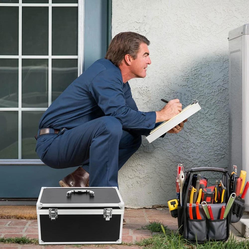 Features - : Equipped with sturdy crash- shell and shockproof foams inner material - Durable: , it is not easy to . - Practical: It is able to withstand large impacts without being damaged and effectively protects your stuff in great safety - Works Well: Ergonomic handle makes it comfortable and labor-saving to hold the tool box in hand - Multipurpose: Buckle lock protect your stuff from accidental drop or Specification: - Color: Black - Material: Aluminum alloy, ABS, flannelette and foams Package Including 1 x toolbox Solid and Durable Material:This toolbox is made of ABS , aluminum alloy and foam inserts, solid and durable, resistant to impact and not easy to crack. Designed with a size, it is a good choice for carrying your power tools, hand tools, and various hardware Proper Size and :Size information: 29cm/11.4 inch in length, 16cm/6.3inch in width, 15cm/5.9inch in height; Thismetal toolbox is equipped with an easy-to-grip solid handle on the top, combined with its lightweight structure, just grab and go Double Security Lock Design:This tool box comes with 2 lockable hinge to prevent internal tools from accidentally falling out while being carried, keeps your valuable tools safe Add Foam Insert for Better Protection:The tool case is equipped with sturdy crash- resistant black shell and shockproof inner material, able to withstand large impact without being damaged and effectively protects your stuff in great safety Multifunctional Toolbox for Widely Use:This multipurpose tool organizer box can well organize your repair tools, bringing convenience to all kinds of maintenance work, such as auto repair or appliance repair. Also, it allows you to easily store fishing tools, craft supplies, hardware and sewing supplies in an organized manner to meet your different needs