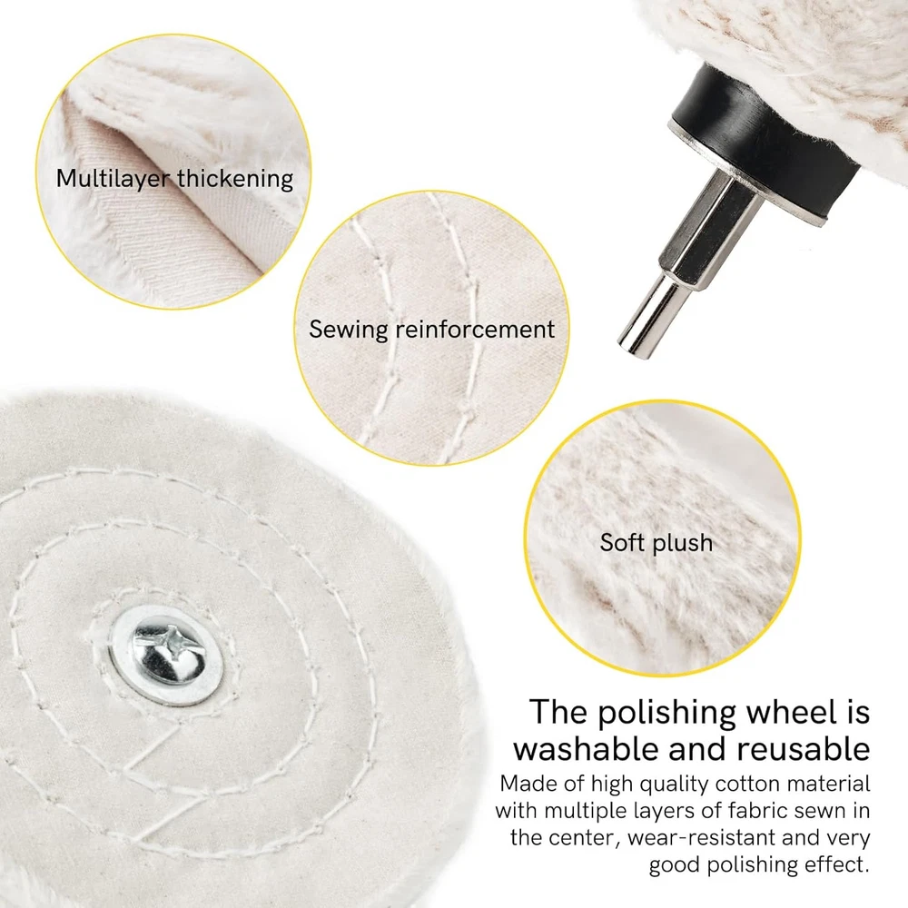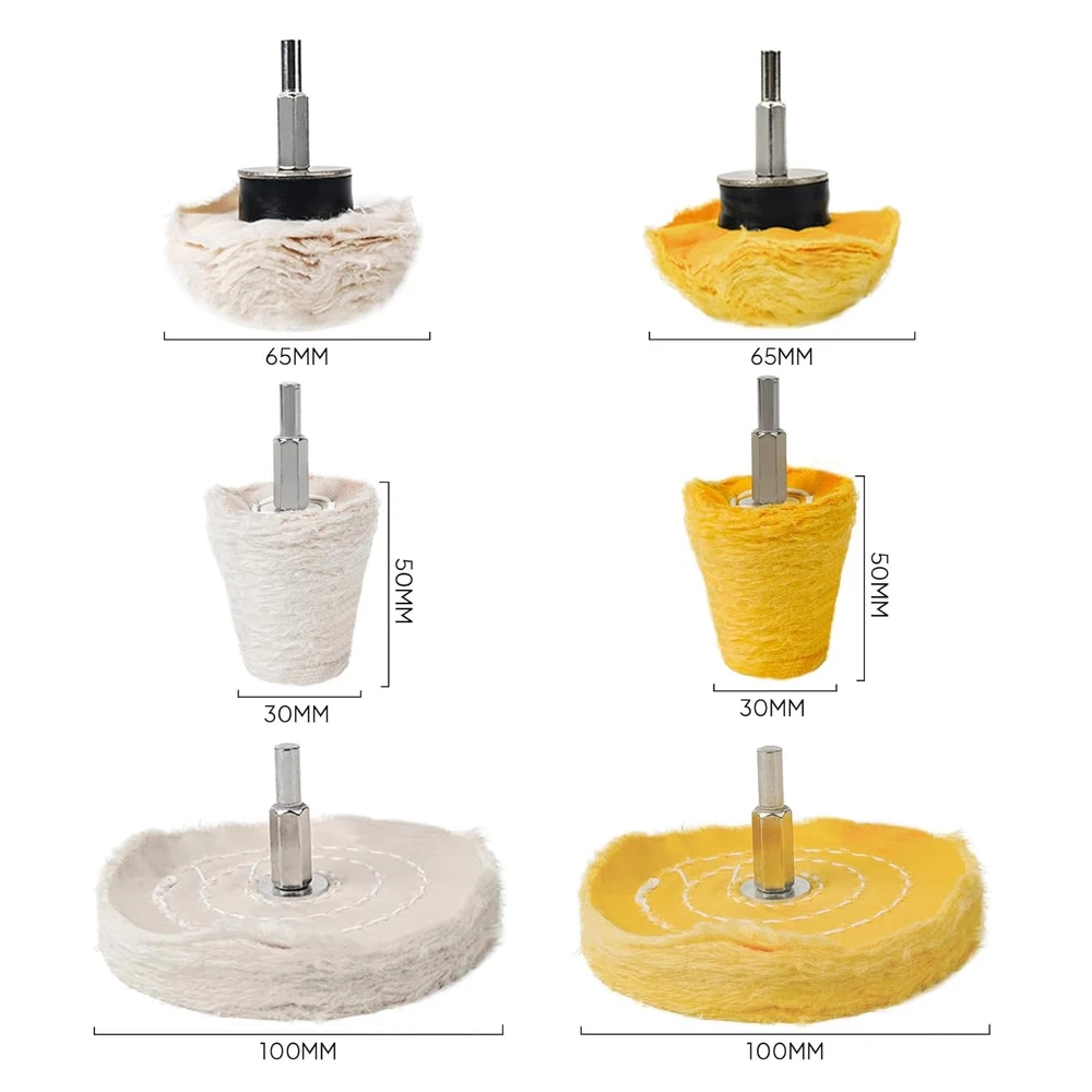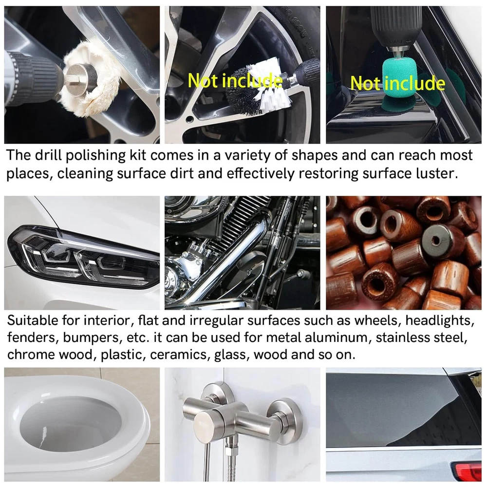 Aluminum Wheel Polishing Kit for Drill Buffing Wheel for Car Motorcycle Wheel Rim Manifold Polishing for Stainless Steel Chrome Wood Plastic Ceramic Glass Woods Machine Jewelry etc 6PCS Product Details Product Dimensions : 3.9 x 0.8 x 0.1 inches; 13.12 ounces Manufacturer : Unicaravan Country of Origin : China Grit Material: Aluminum Oxide Product Dimensions: 3.9"L x 0.8"W Brand: Unicaravan Compatible Devices: Drill Machines Grit Type: Fine 【Easy to Use】:First use the yellow aluminum wheel polish to remove the stains and oxides on the metal surface to make the metal surface smoother.Then use white the aluminum wheel polish to polish the metal surface more finely to make the details of the metal surface more bright. Yellow aluminum polishing wheel is suitable for large and localized metal polishing and sanding, such as car wheels, door handles, etc..White aluminum polishing wheel is suitable for polishing special metal materials, such as stainless steel and ceramics etc.. 【Widely Useful】:The drill polishing kit comes in a variety of shapes and can reach most places, cleaning surface dirt and effectively restoring surface luster. Suitable for interior, flat and irregular surfaces such as wheels, headlights, fenders, bumpers, etc. it can be used for metal aluminum, stainless steel, chrome wood, plastic, ceramics, glass, wood and so on. 【Package Included】:Total 6PCS ,Include Yellow polishing wheel (mushroom buffing wheels 65mm;T-shape buffing wheel 100mm;conical polishing wheels 30mm;) +White polishing wheel (mushroom buffing wheels 65mm;T-shape buffing wheel 100mm;conical polishing wheels 30mm;) 【Quality Material】:Made of high quality cotton material with multiple layers of fabric sewn in the center, wear-resistant and very good polishing effect.The polishing wheel is washable and reusable and when used, they will not scratch or damage the paint on surfaces. 【Professional After-sales Service]: If you have any questions about the Unicaravan Aluminum Wheel Polishing Kit For Drill, please contact us.We also offer super friendly customer service and lifetime technical support.