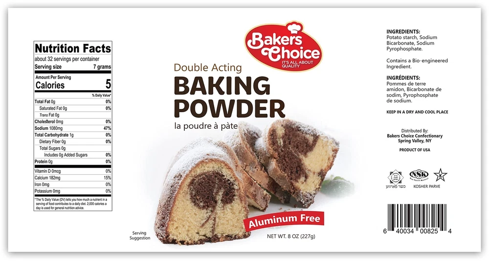Double Acting Baking Powder, 8 oz. - Aluminum Free Baking Powder, Premium Grade, Vegan, Vegetarian, Kosher - By Baker’s Choice BAKING POWDER FOR COOKING: Our baking powder is perfect for pancakes, breads and others EASY TO USE: Our double acting baking powder makes it easy to bake VERSATILE & MULTIPURPOSE: Our gluten free baking powder is great for making desserts and treats ALUMINUM-FREE BAKING POWDER: Our high quality baking powder aluminum free is a must-have ingredient PREMIUM QUALITY: Baker’s Choice premium quality ingredients provide the best flavor and taste Bake everything to perfection with Baker’s Choice Sodium Free Baking Powder . It’s easy to use and versatile. Whip up some delicious baked goodies, our baking powder adds texture allows everything to bake evenly. Add it to your signature recipes and keep it stored in your kitchen. It creates consistently delicious baked goods with uniform texture. This double acting baking powder provides an exquisite crumb texture. A little bit goes a long way. When a recipe calls for baking powder you’ll want to choose Bakers Choice premium quality aluminum free baking powder. You’re not baking right if you’re not using Baker’s Choice! PRODUCT FEATURES: 8 Ounce Can Certified Kosher Aluminum Free EASY TO USE AND VERSATILE Make it your way! Our baking powder can be used to make a wide variety of baked goods and treats like biscuits and cookies. It’s exactly what you need for recipes that require baking powder. It’s easy to mix in with other ingredients and it adds texture to baked treats. It’s a must-have for professional and amateur chefs or bakers. It comes packaged in a convenient can that preserves freshness and makes it easy to in kitchen pantries or cabinets. It’s easy to measure just the right amount of this essential baking ingredient ABOUT US At Baker’s Choice, we believe it’s all about quality. Established in 1997, we’ve been working hard to provide ready-made baking ingredients for our customers. We source the globe for a unique variety of premium quality ingredients to make our toppings and dessert decorations. You can count on our fresh ingredients to make your signature treats even more delicious. Choose Baker’s Choice, where customer satisfaction is our top priority. Shipping We ship within Three business days of payment, usually sooner. We use a selection of shipping services such as UPS, FedEx, USPS etc. We only ship to the lower 48 states, no APO/FPO addresses or PO Boxes allowed. Local pickups and combined shipping options are not provided at this time. Return You can return a product for up to 30 days from the date you purchased it. Any product you return must be in the same condition you received it and in the original packaging. Please keep the receipt. Payment We accept payment by any of the following methods: PayPal Please pay as soon as possible after winning an auction, as that will allow us to post your item to you sooner! Feedback Customer satisfaction is very important to us. If you have any problem with your order, please contact us and we will do our best to make you satisfied. Contact Us If you have any queries, please contact us via ebay. We usually respond within 24 hours on weekdays. Please visit our eBay store to check out other items for sale! Thank you for shopping at our store.