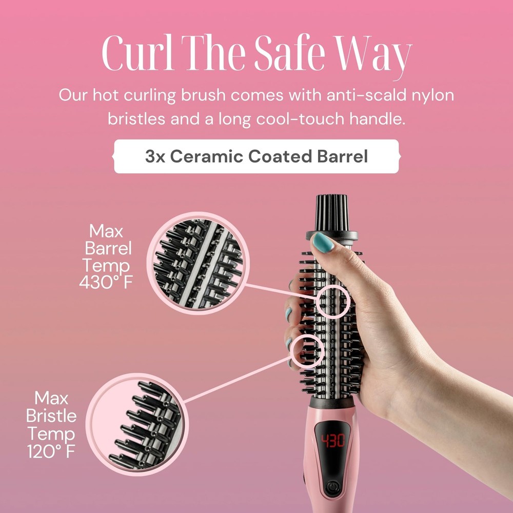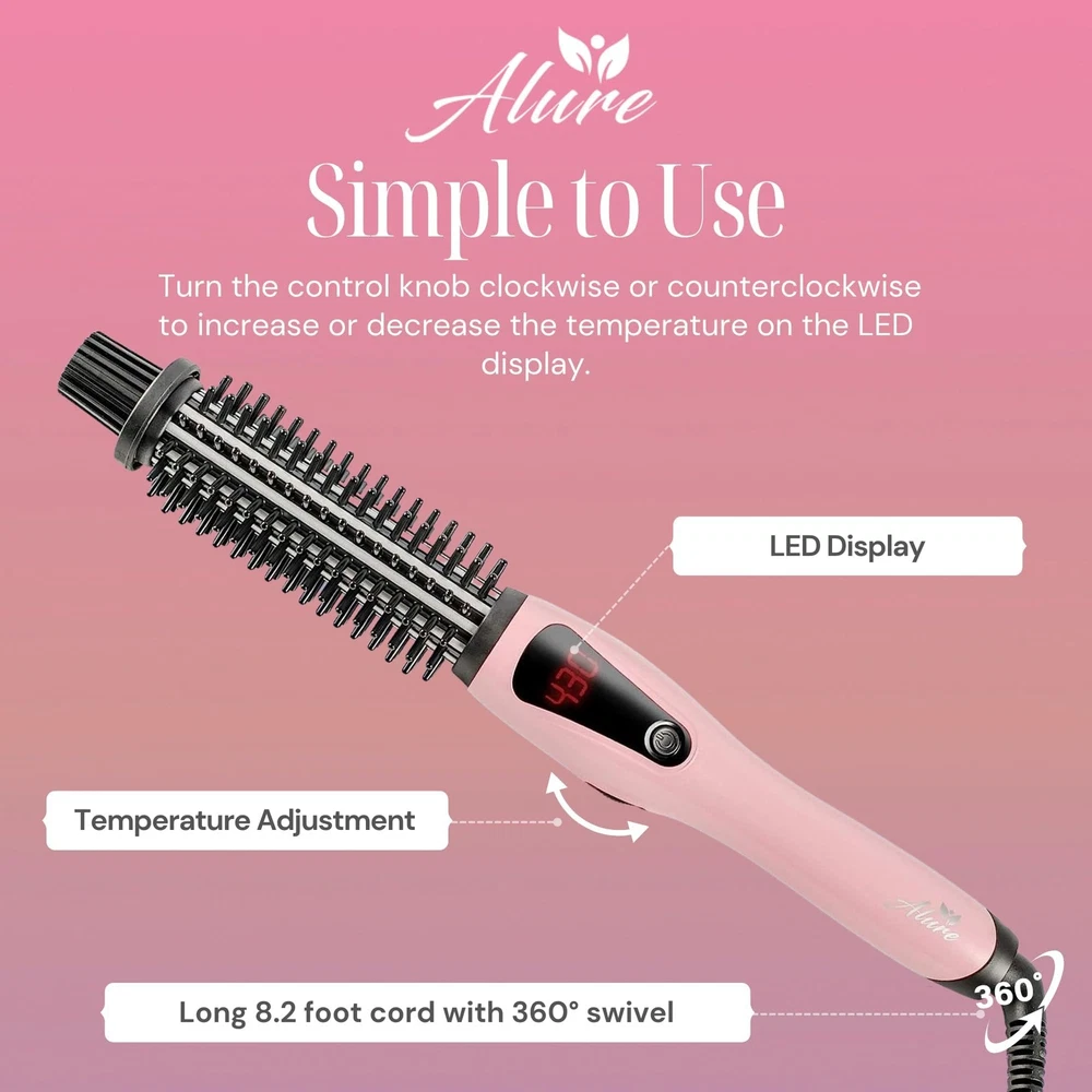 Experience worry-free styling with Alure's 1-inch curling iron brush, prioritizing safety with anti-scald nylon bristles and a cool-touch handle, allowing you to reach temperatures up to 430F without the risk of burns. This 3-in-1 styling essential seamlessly combines a curler, straightening brush, and ionic conditioning comb, providing unmatched flexibility and convenience. Effortlessly style all hair types with the adjustable temperature (265F to 430F) and revel in swift 30-second heat-up time for salon-quality results. Achieve enduring, glossy curls as the ceramic-coated barrel releases anti-frizz negative ions, preventing tangling and ensuring even heat distribution. With an intuitive design, easily adjust the temperature using a simple knob, monitor settings on the LED display, and enjoy safety features like a 60-minute auto shut-off and 3-second temperature lock for a professional touch in the comfort of your home. Elevate your hairstyling routine with Alure, the perfect alternative to popular thermal brushes and curling irons on the market. CURL THE SAFE WAY: Unlike other hair curlers that result in burnt fingers and scalded scalps, our hot curling brush comes with anti-scald nylon bristles and a long cool-touch handle. This means you get to turn up the heat up to 430F for professional results without dealing with nasty burns. 3-IN-1 VERSATILITY: This 1 inch curling iron brush is a hair curler, straightening brush, and normal comb (with shiny ionic conditioning) all rolled into one. FOR ALL HAIR TYPES: The variable temperature of 265F to 430F safely & precisely styles all hair types: fine, normal, or thick. You’ll also love the extra-fast 30-second heat-up. FRIZZ-FREE, LUSTROUS CURLS: Revel in enduring, glossy curls. The ceramic-coated barrel of our Alure hot curling brush releases anti-frizz negative ions, preventing tangling and ensuring even heat distribution for smooth, silky locks. INTUITIVE AND SECURE: Easily adjust the temperature with a straightforward knob, monitor settings on the LED display, and benefit from safety features including a 60-minute auto shut-off and a 3-second temperature lock. Ideal for achieving salon-quality styling. NOTE TO CUSTOMERS: This curler comes with a temperature auto-lock feature that prevents accidental changing of the temperature setting during use. This is indicated by the "LOC" message on the display. To unlock, simply double-press the power button.