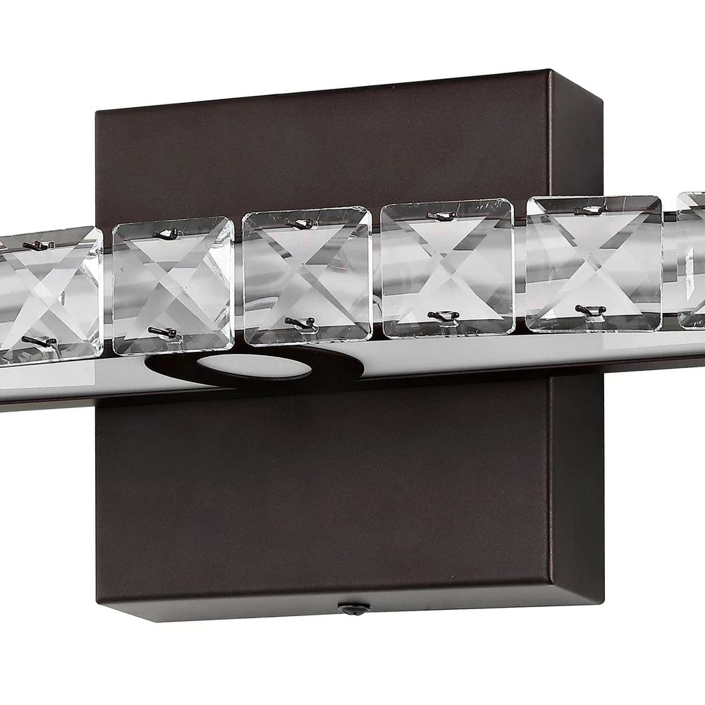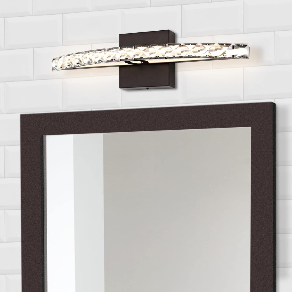 Crystal prisms form a line of jewels to create a glamorous vanity light with vintage flair. The sleek metal finish accentuates the clean lines, and acrylic prisms add sparkle and texture to the minimalist design. Add a touch of glam above a bathroom mirror, or use these Art-Deco-inspired sconces in a hallway or bedroom. QUALITY CONSTRUCTION: Integrated LED wall light fixtures provide a minimalist lighting solution; feature high-end metal finishes and provide flicker-free, soft white light; LED components are built into the fixture, so they’ll never need replacing SMART, ENERGY SAVING LIGHTING: Integrated LED light fixtures dimmable when connected to an LED-dimmer switch; Our lights are ETL Listed and meet 120-volt UL standards for safety and quality; Professional installation is recommended SATISFACTION GUARANTEED: Every design is created with uncompromising attention to detail, using only the highest quality components; Based in Soho, New York, designer Jonathan and his talented team create affordable high-end home decor The oil-rubbed bronze finish adds modern elegance, while acrylic crystals amplify the warm, bright light Our light fixtures work with LED-dimmers