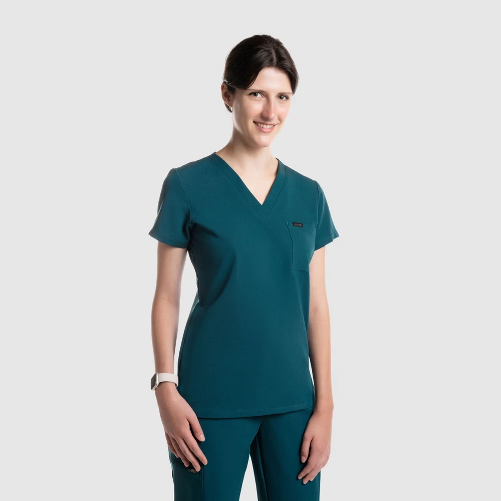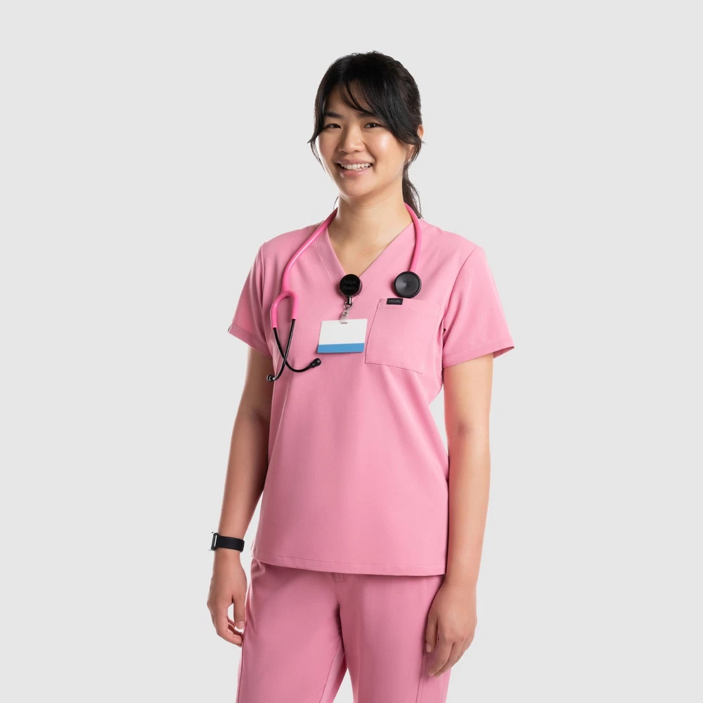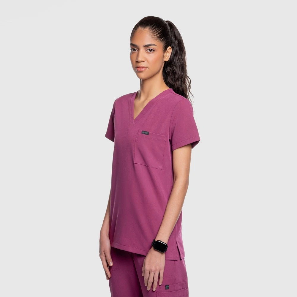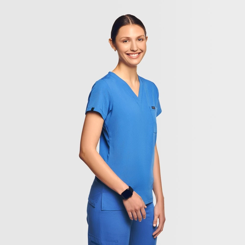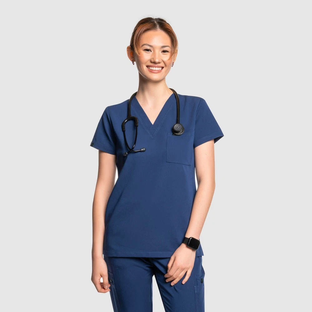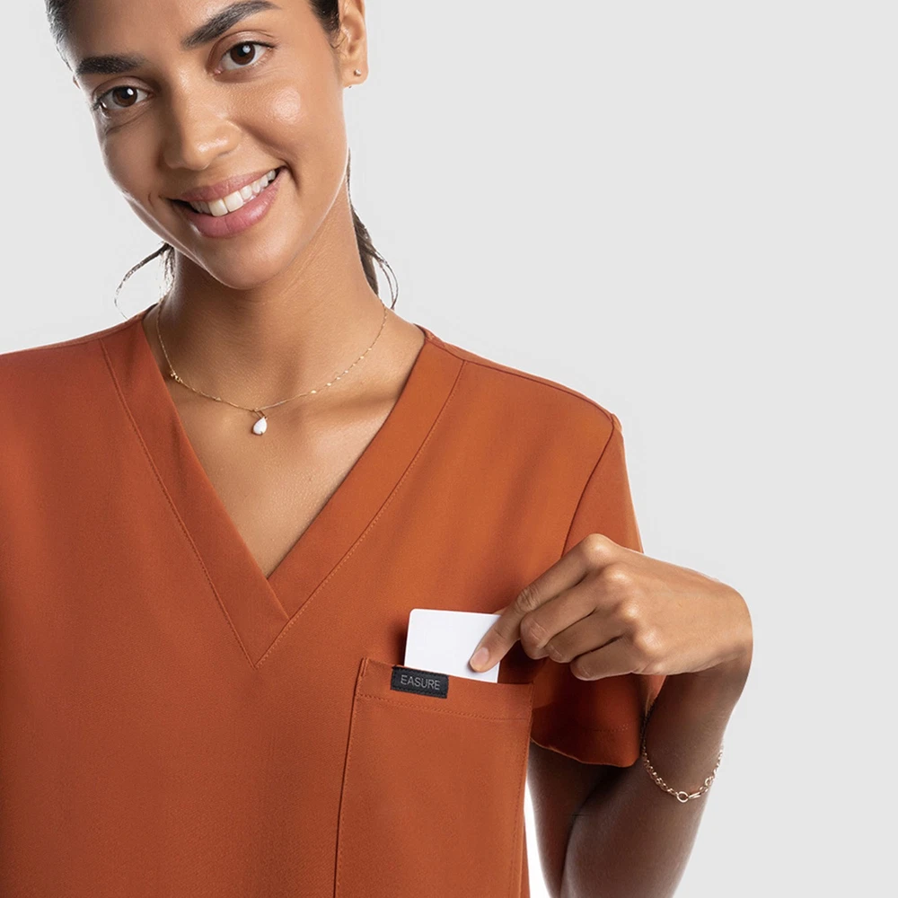 The Amara 1-Chest Pocket Women's Scrub Top by Easure is a stretchy medical uniform top designed for women. Made of polyester, rayon, and spandex, this V-neck top features a solid pattern and a convenient chest pocket. Perfect for medical professionals looking for comfortable and functional work clothing. Stay comfortable and professional with the Amara Women’s V-Neck Scrub Top, designed for performance and everyday wear in medical environments. Crafted from a premium polyester, rayon, and spandex blend, this scrub top provides excellent stretch, breathability, and ease of movement. The flattering V-neck silhouette delivers a modern look, while the functional chest pocket adds practical storage. Wrinkle-resistant fabric helps you stay neat and confident throughout your shift, making this scrub top a dependable choice for busy professionals. Perfect for hospitals, clinics, nursing homes, and healthcare settings